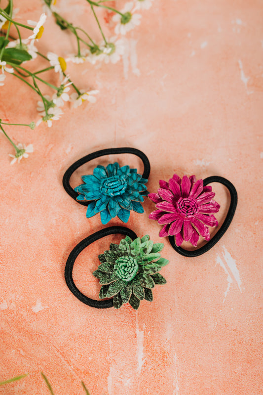 Leather Flower Hair Bobble - Turquoise (HRC 097)
