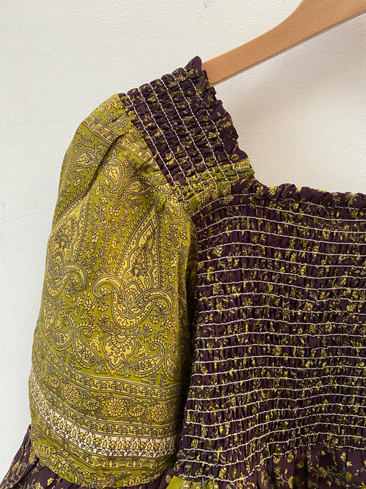 Joelyn Silk Smock Blouse - XS - Gold/Purple Print 045