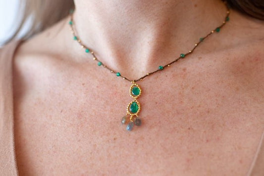 Gold Cotton Necklace with Green Onyx and Labradorite