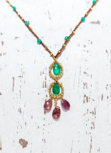 Gold Cotton Necklace with Green Onyx and Pink Tourmaline