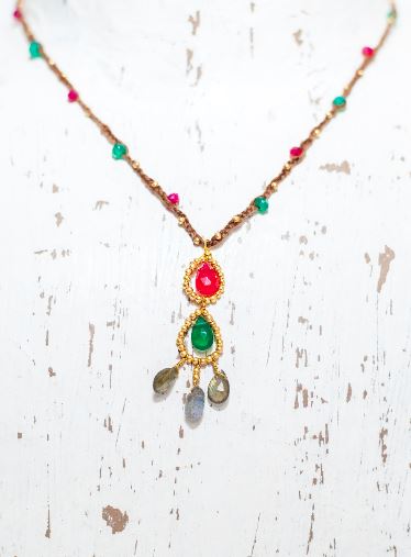 Gold Cotton Necklace with Pink Chalcedony, Green Onyx and Labradorite