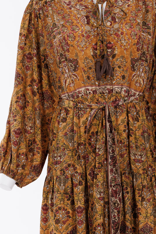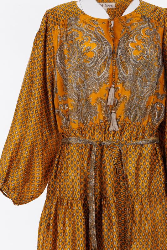 Prairie Round Neck Silk Dress S - Mustard Paisley Print 025