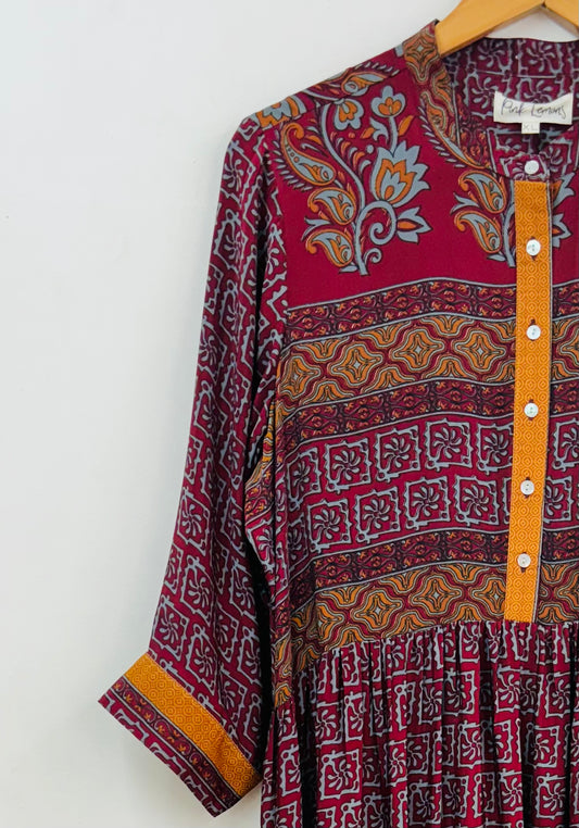 Prairie Round Neck Silk Dress S - Gold/Deep Red Paisley Print 026