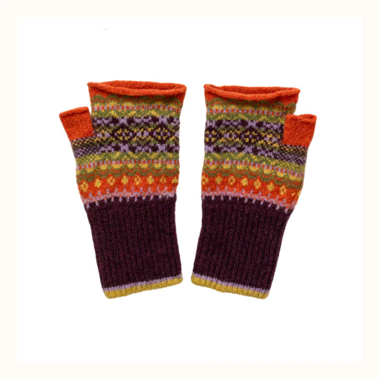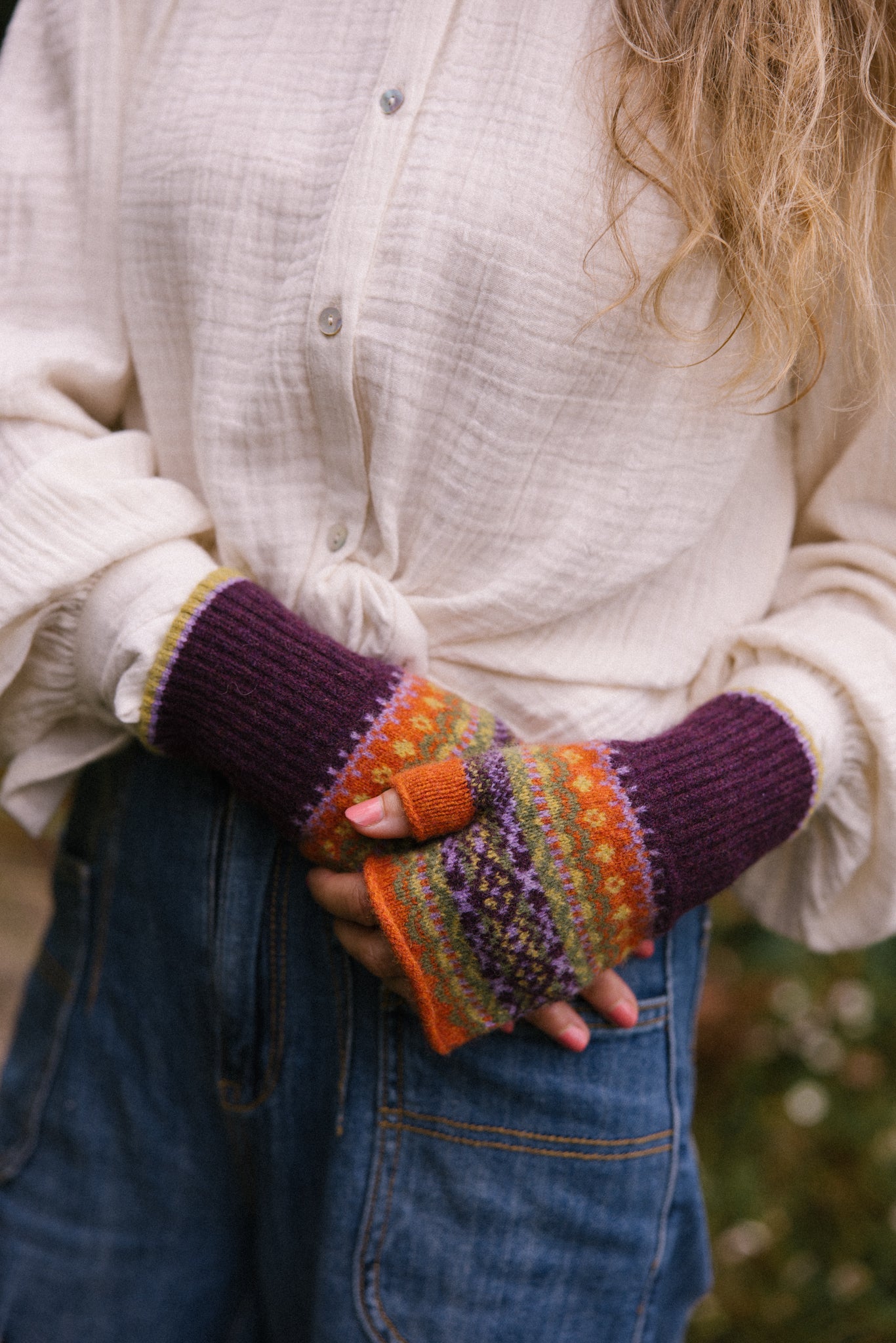 Bright and colourful 100% Merino wool, what more could you ask for? With bold geometrics and Fairisle in block contrasting colours, these open mitts have a hidden inner cuff colour. Perfect for keeping things warm and practical.