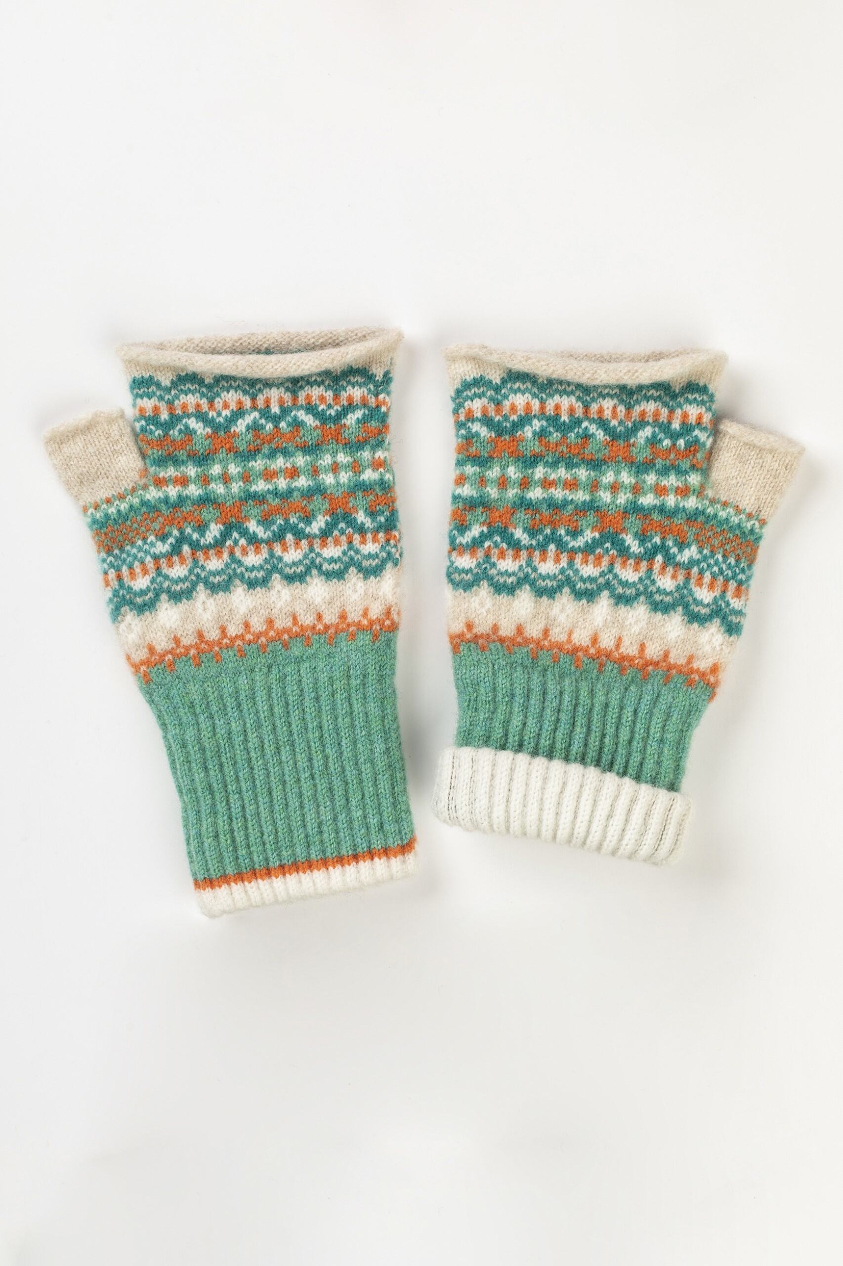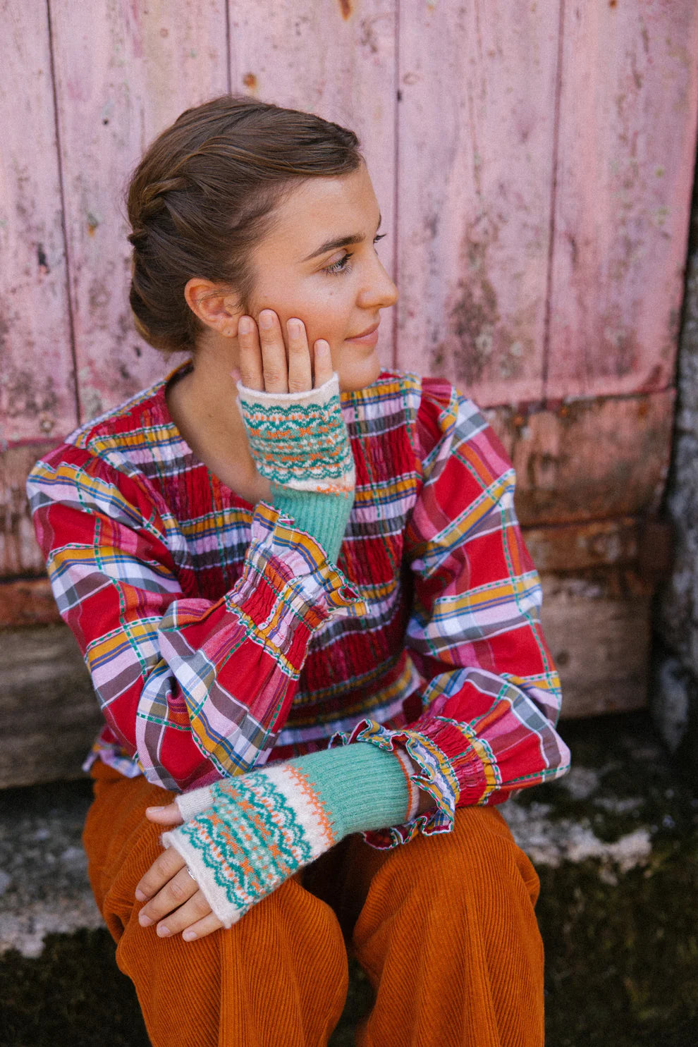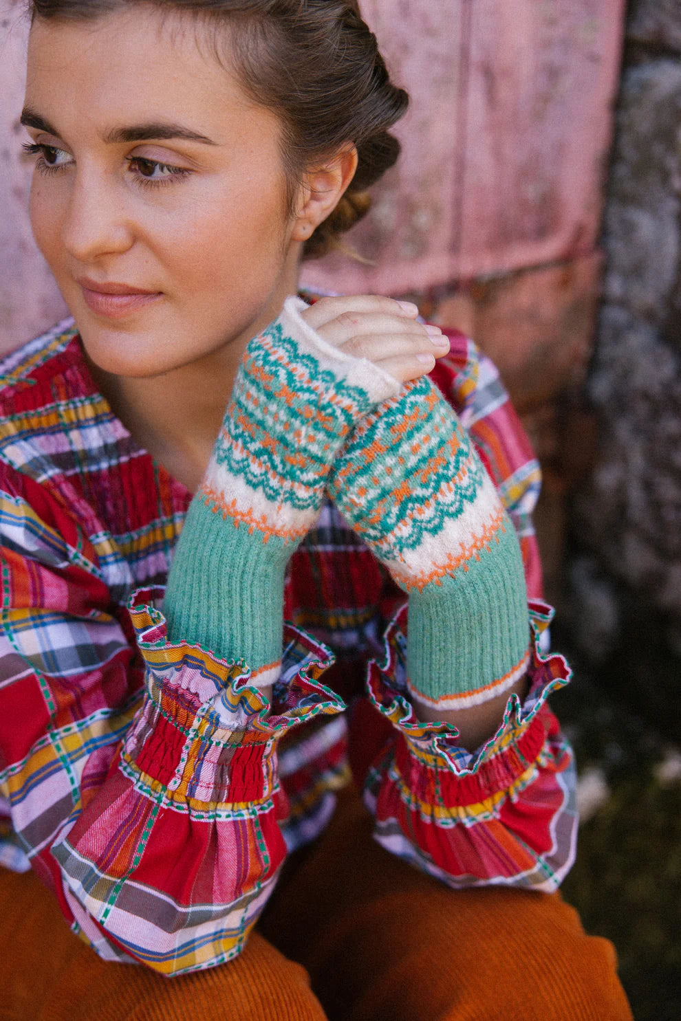 Bright and colourful 100% Merino wool, what more could you ask for? With bold geometrics and Fairisle in block contrasting colours, these open mitts have a hidden inner cuff colour. Perfect for keeping things warm and practical.