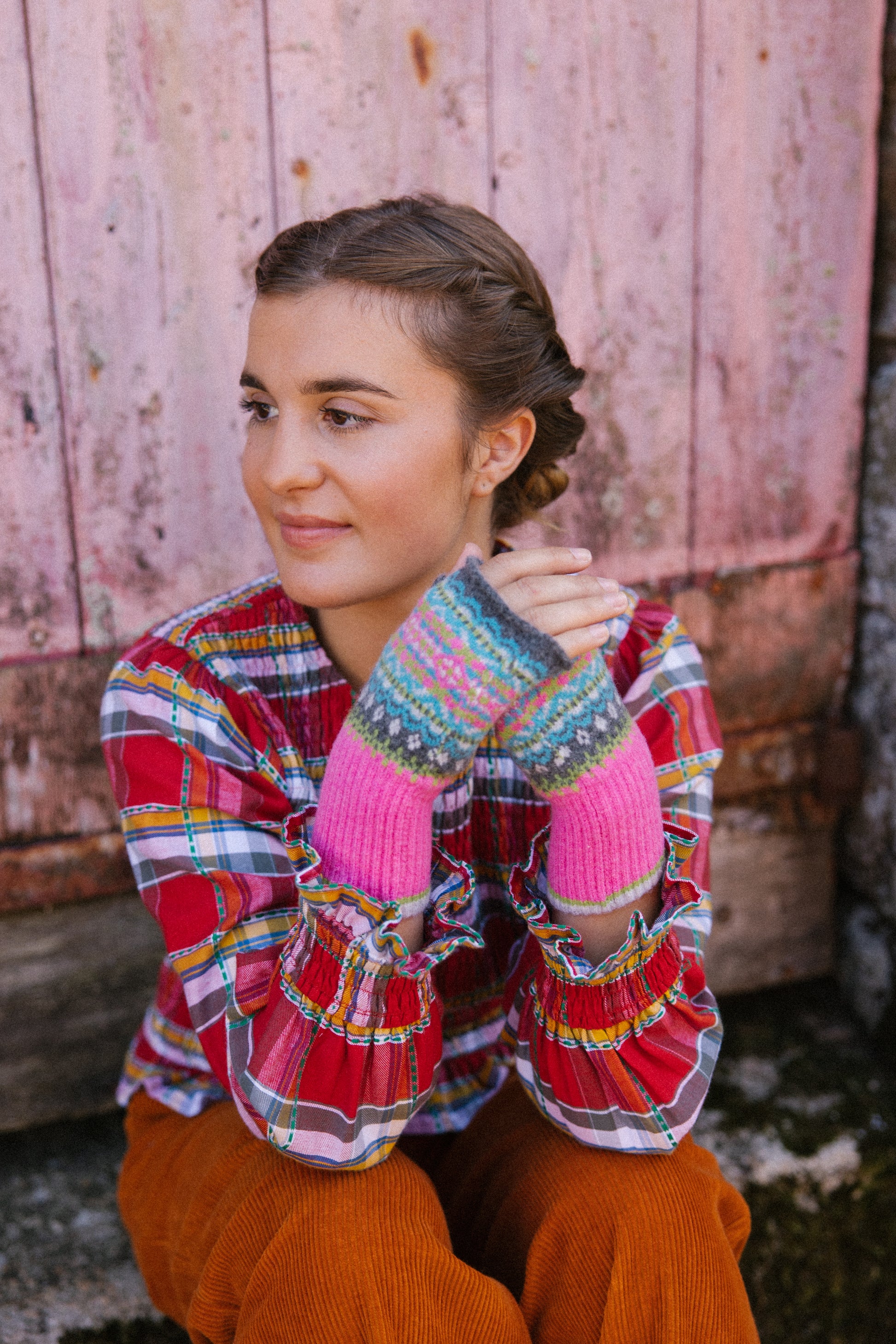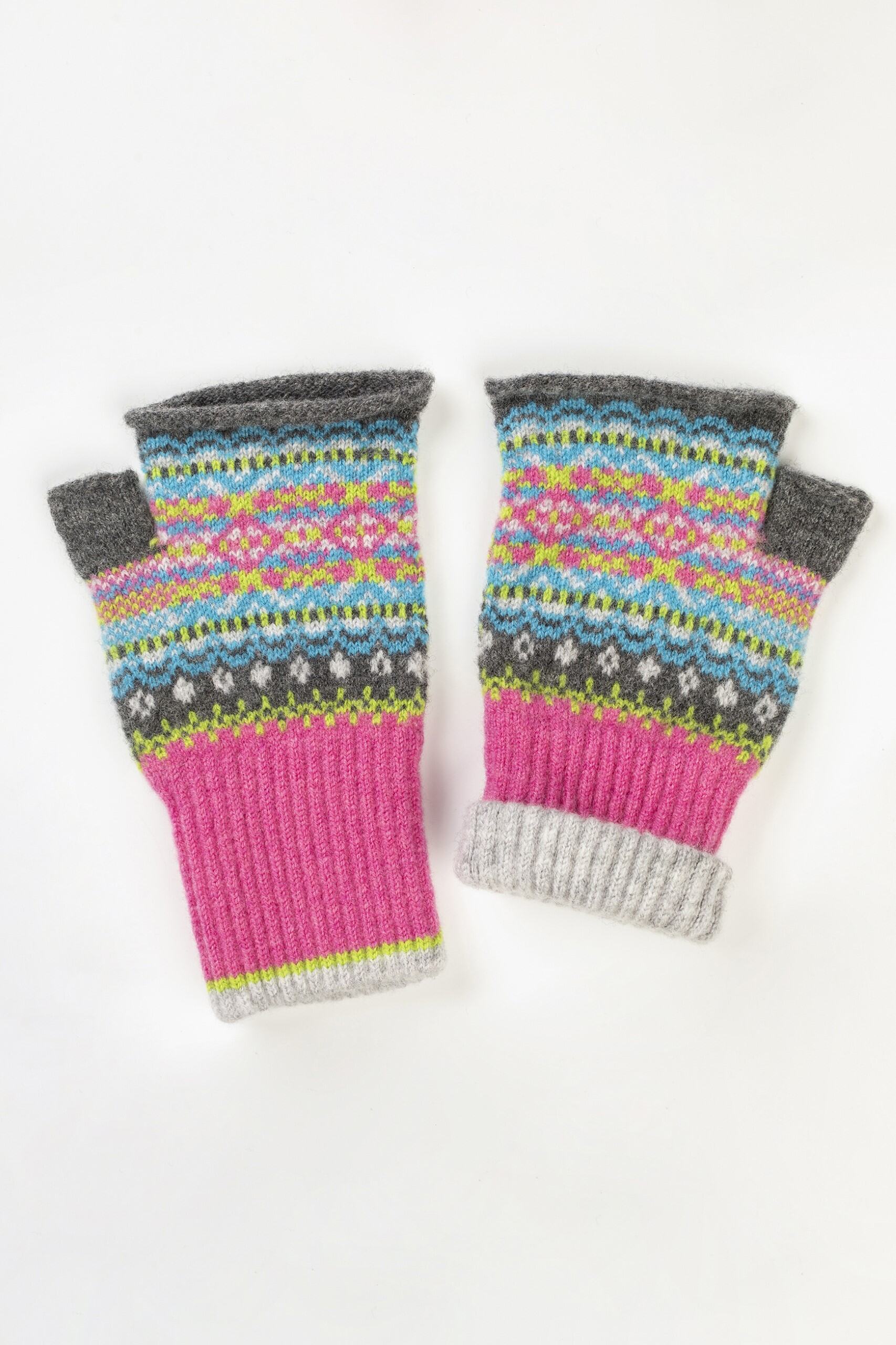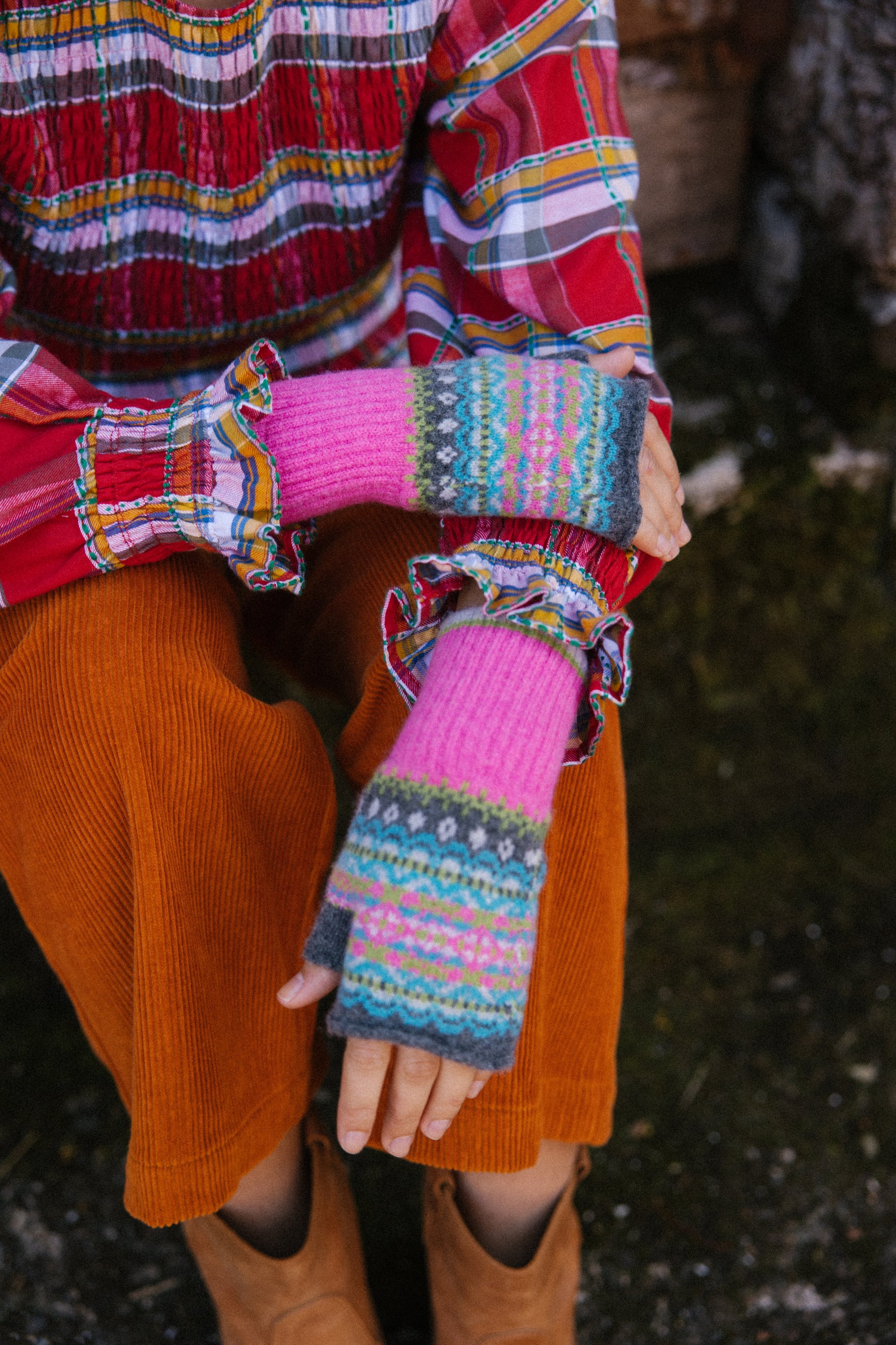 Bright and colourful 100% Merino wool, what more could you ask for? With bold geometrics and Fairisle in block contrasting colours, these open mitts have a hidden inner cuff colour. Perfect for keeping things warm and practical.