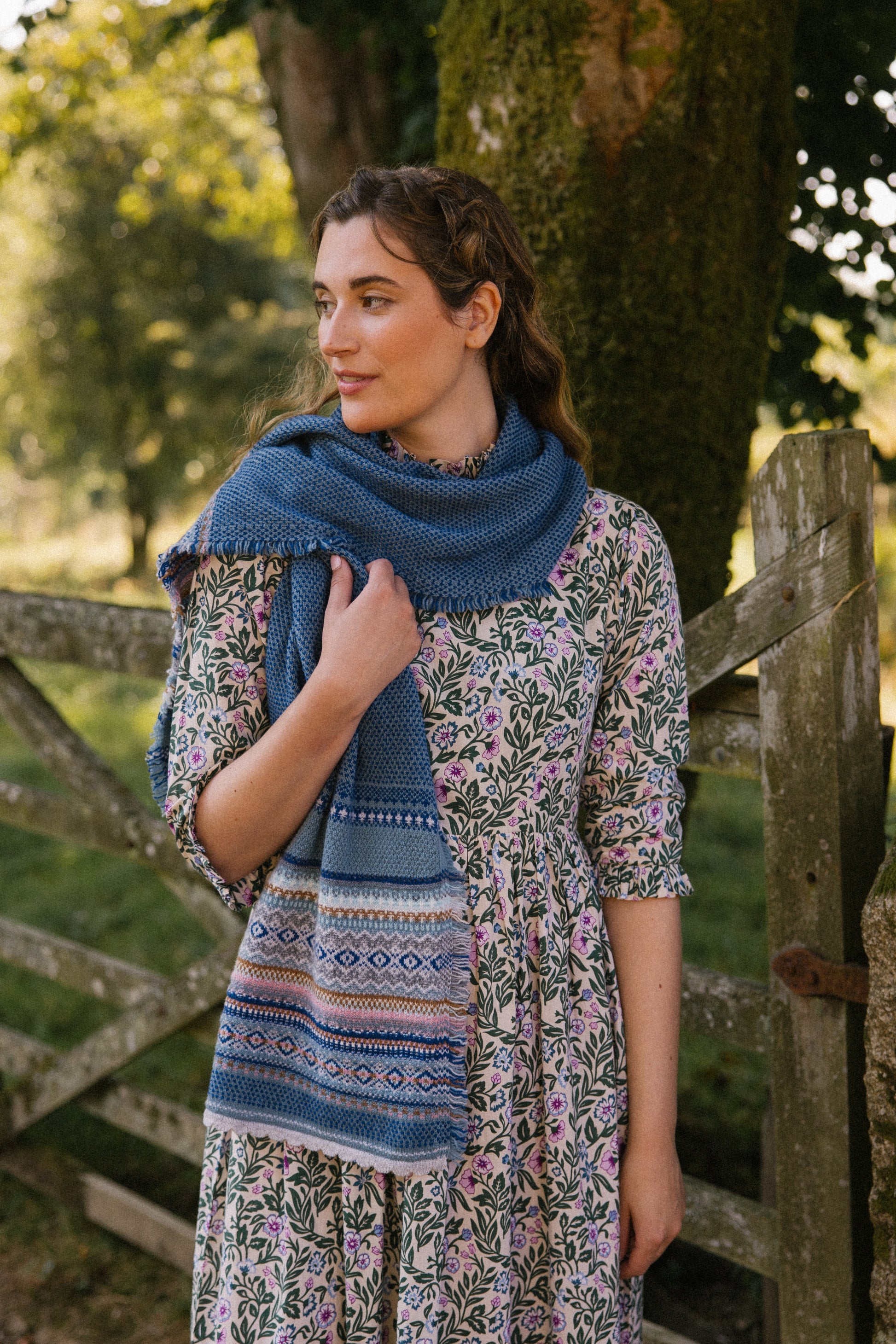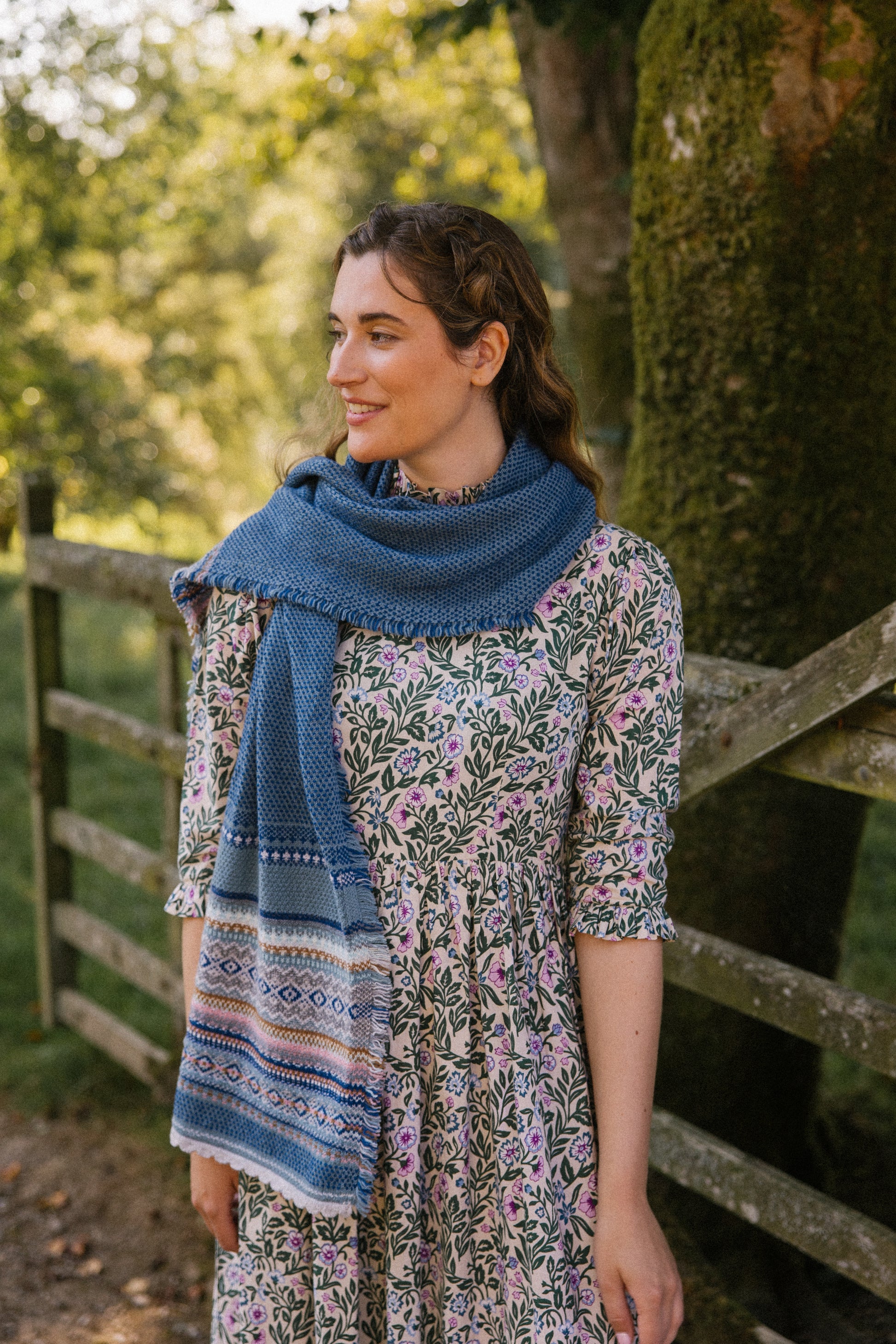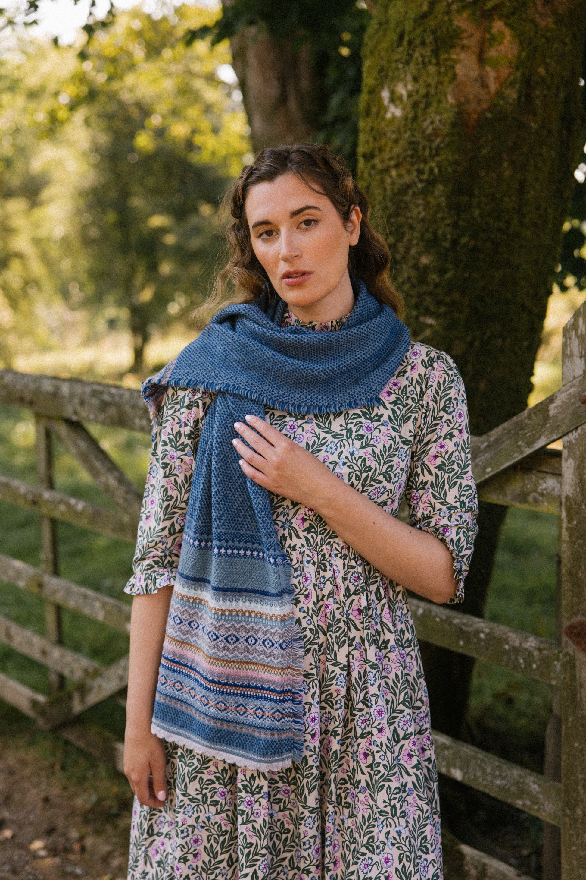 Intricate embroidery-like Fairisle scarf with two toned tweed textured base patterning and scallop edges.
