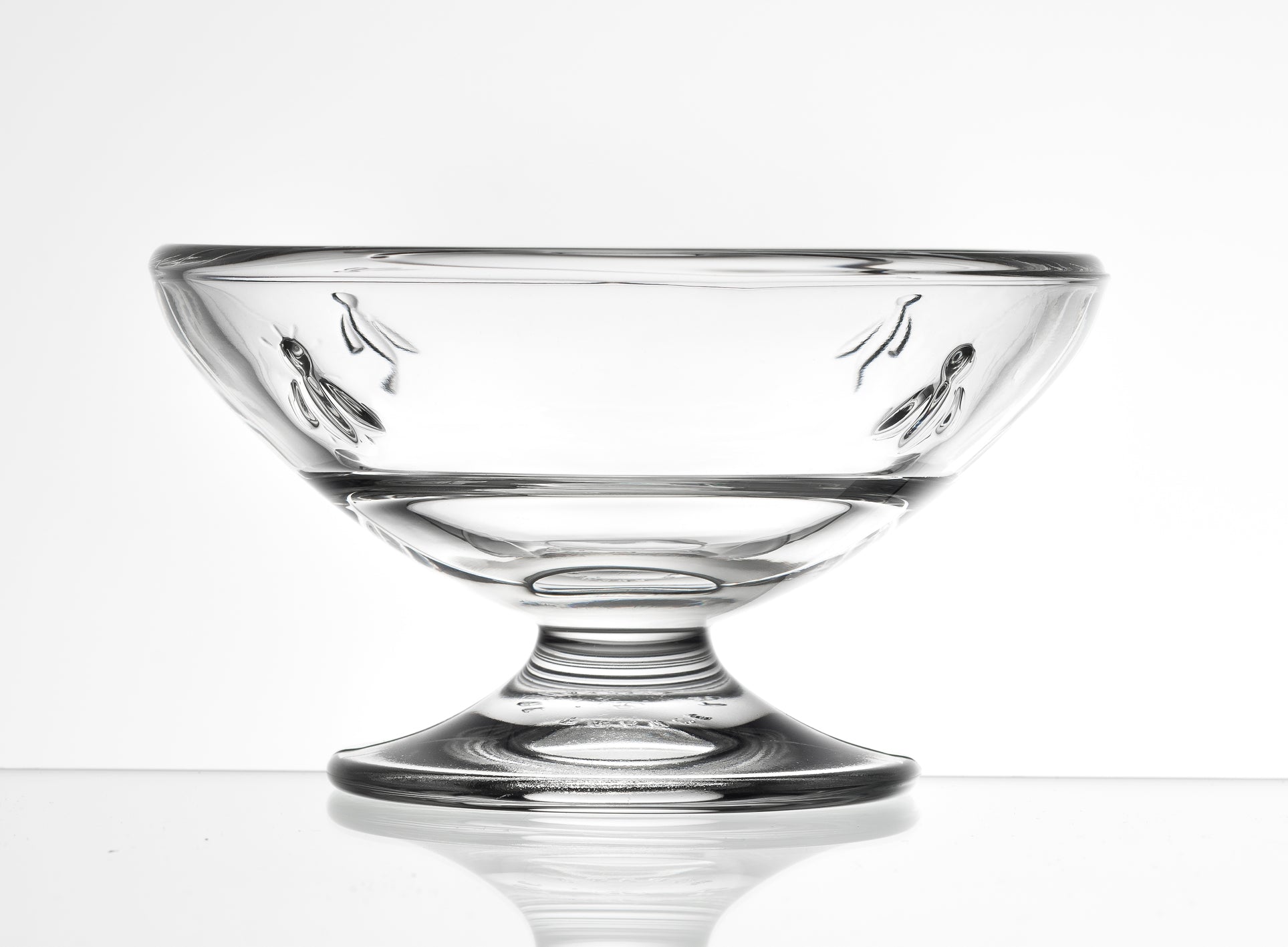 Pressed glass coupe, decorated with four bees.