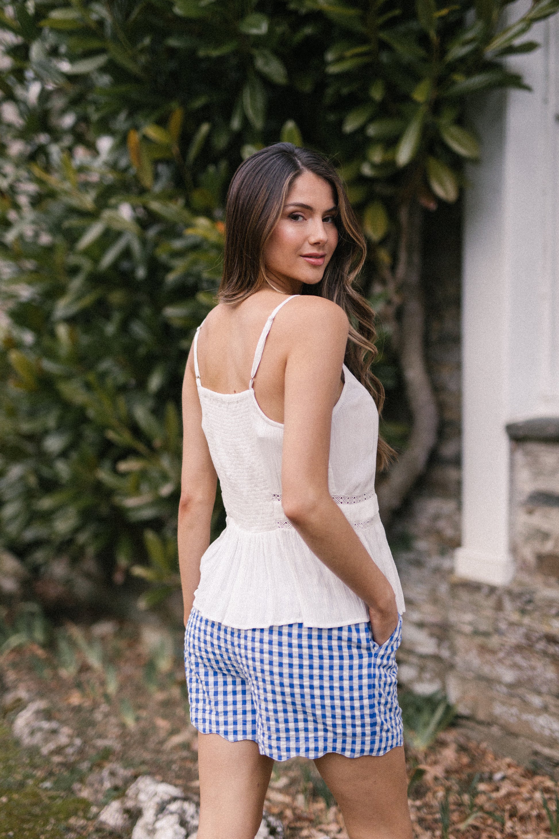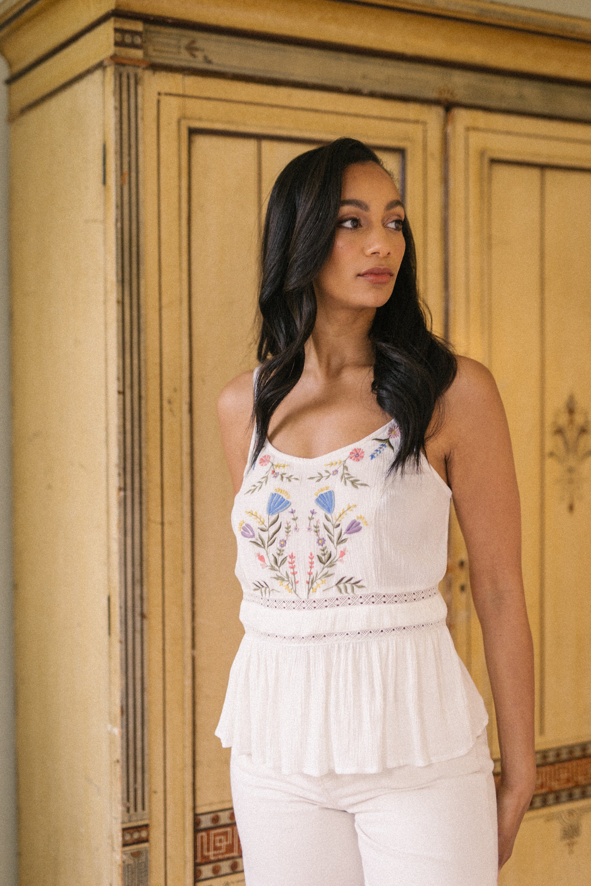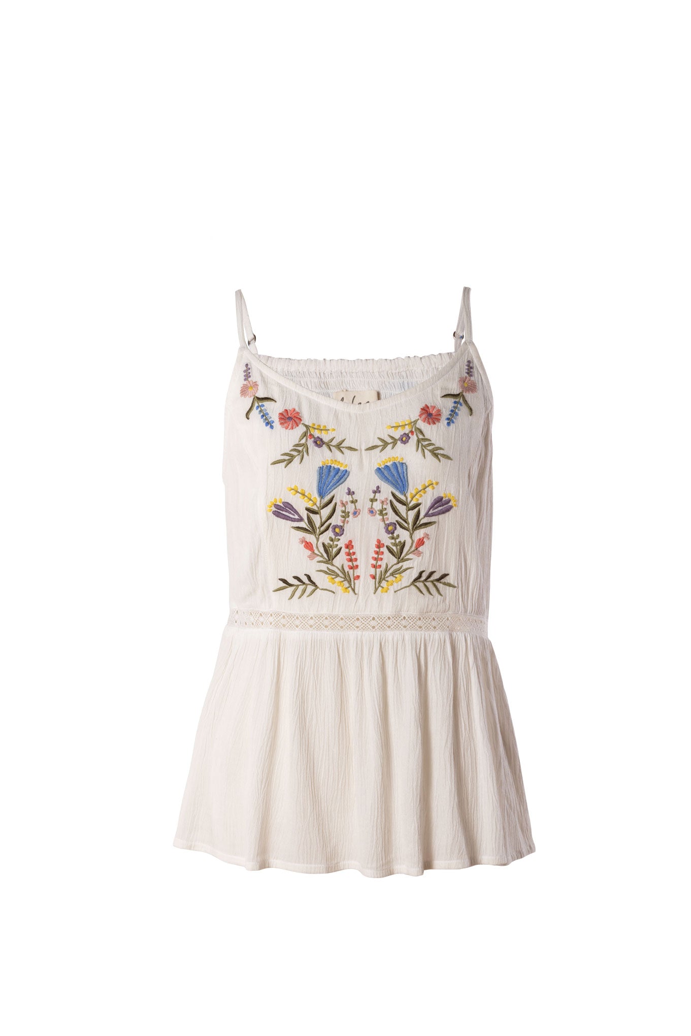 Romanticism is captured in our Bianca camisole top , hand crafted from a floaty viscose and patterned with intricate floral embroidery motif ,with a delicate lace trim and a feminine peplum hem for added femininity. It features centre back smocking with delicate straps , she is a easy summer style to style with separates