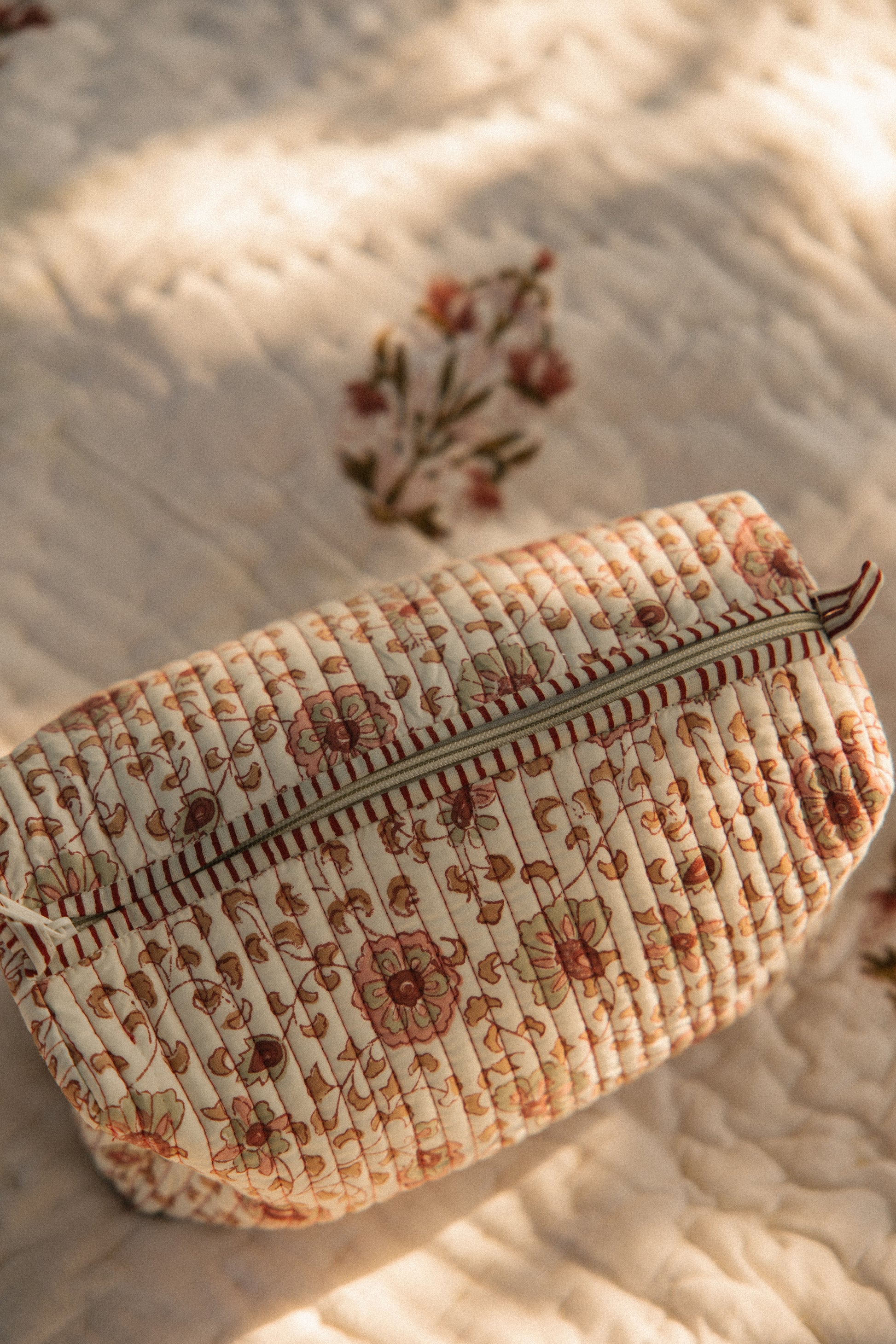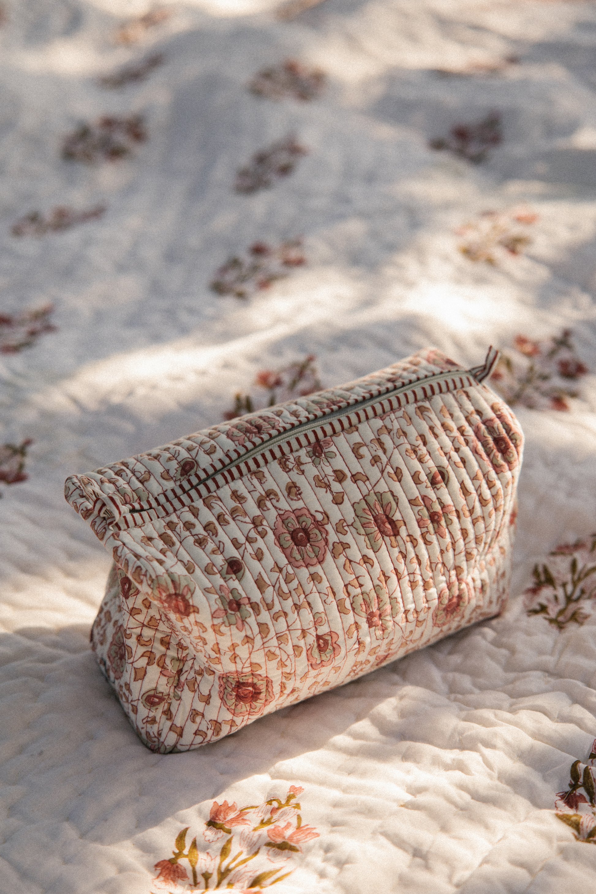 Hand crafted in a soft earth tones in our unique floral print on 100% organic cotton. This item comes fully lined with a water-proof lining and four internal side pockets.