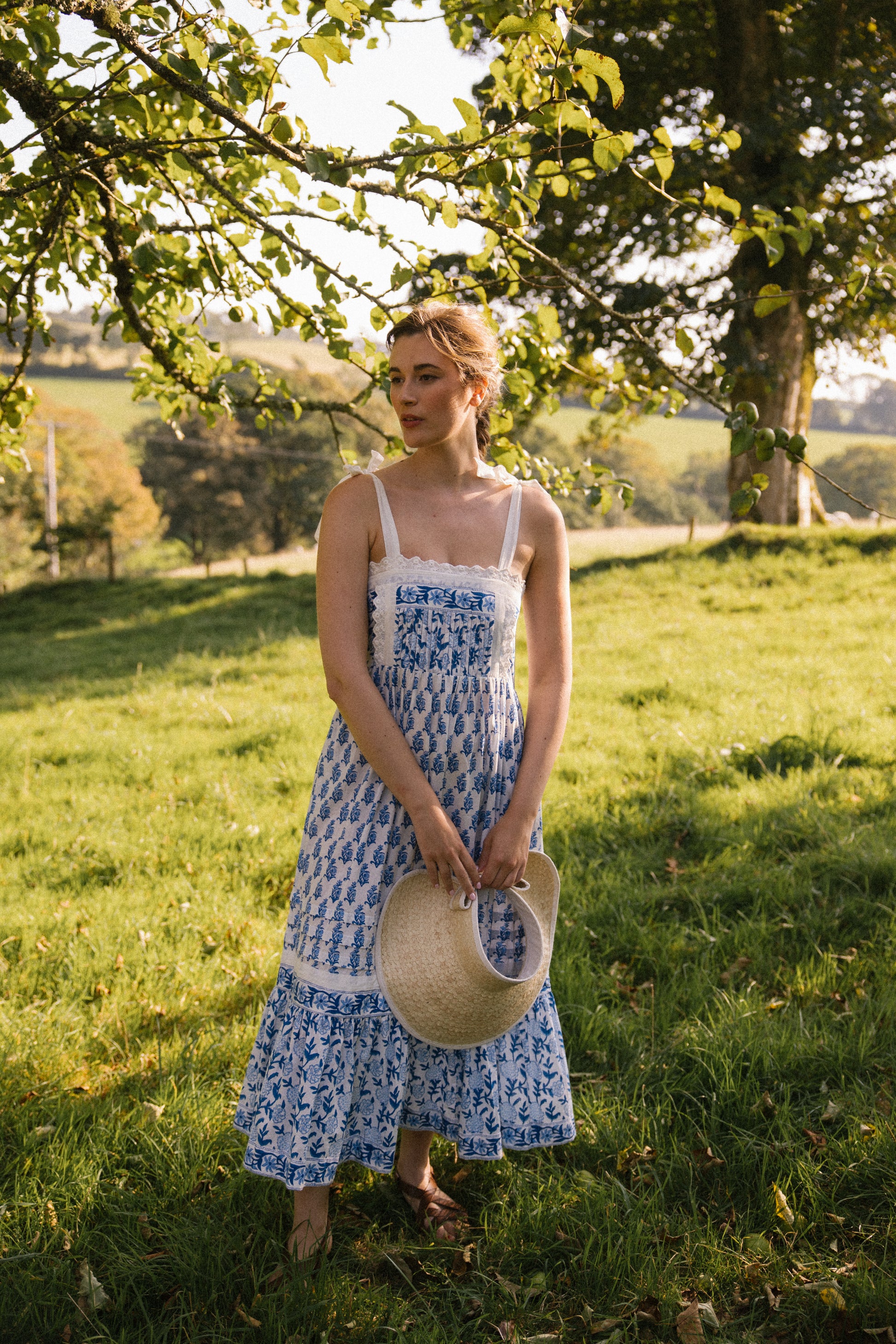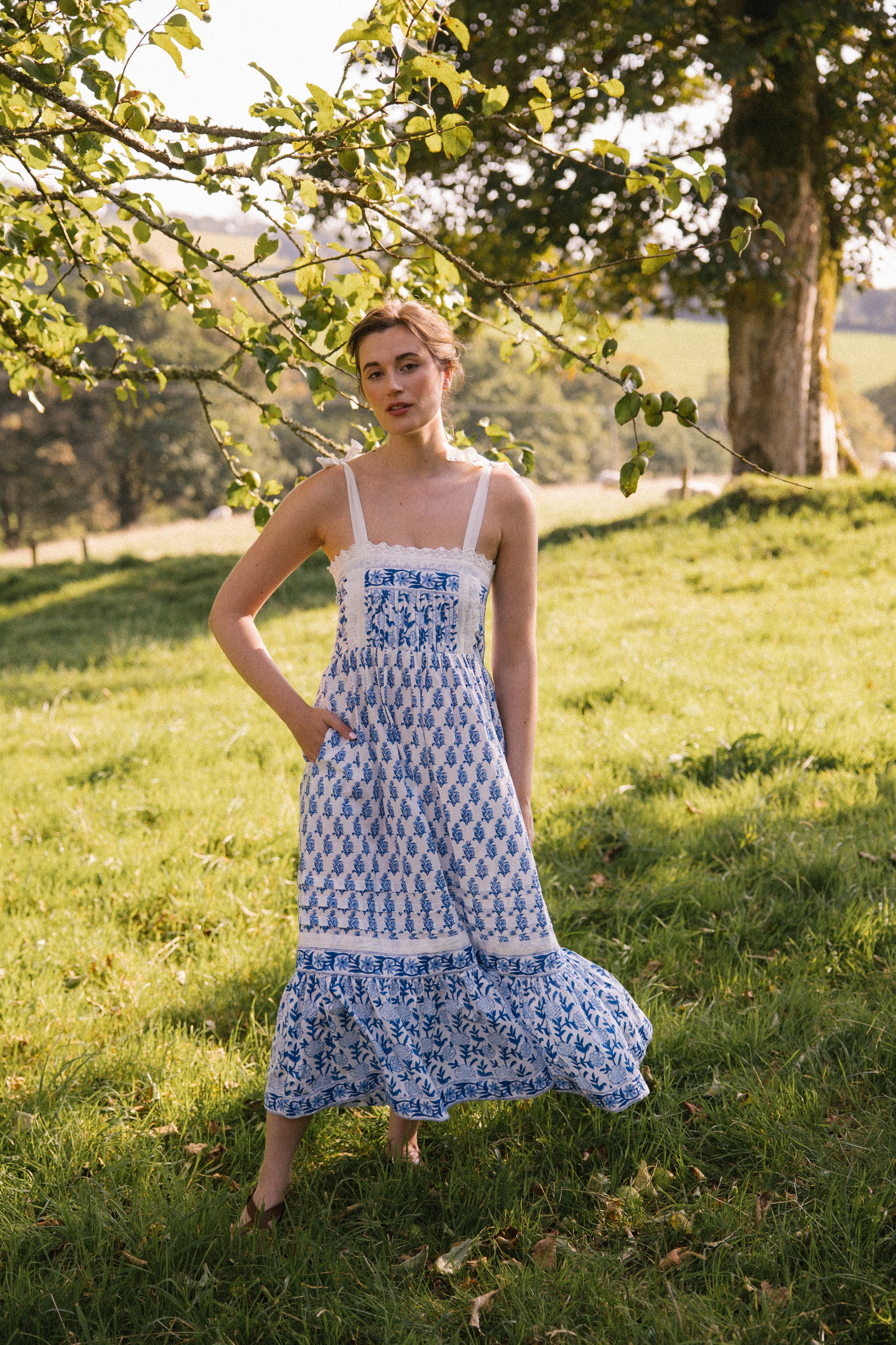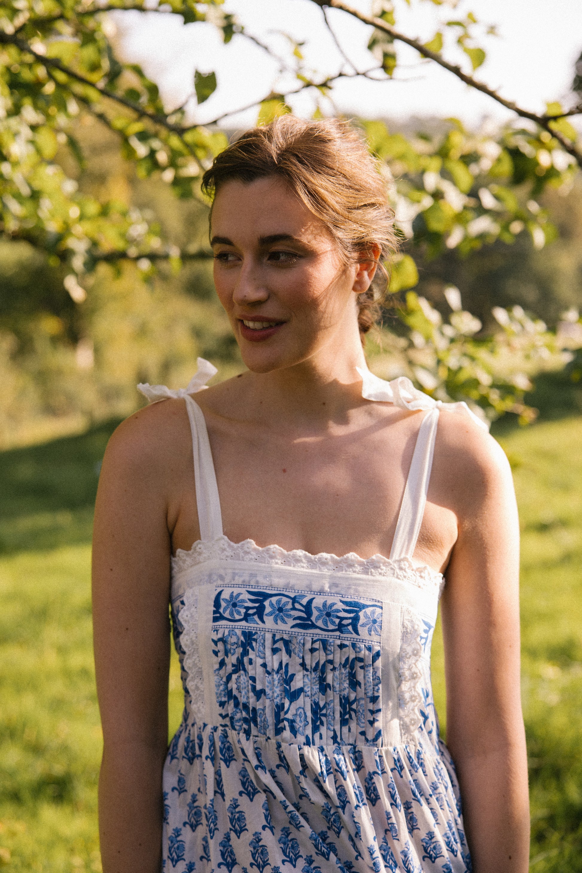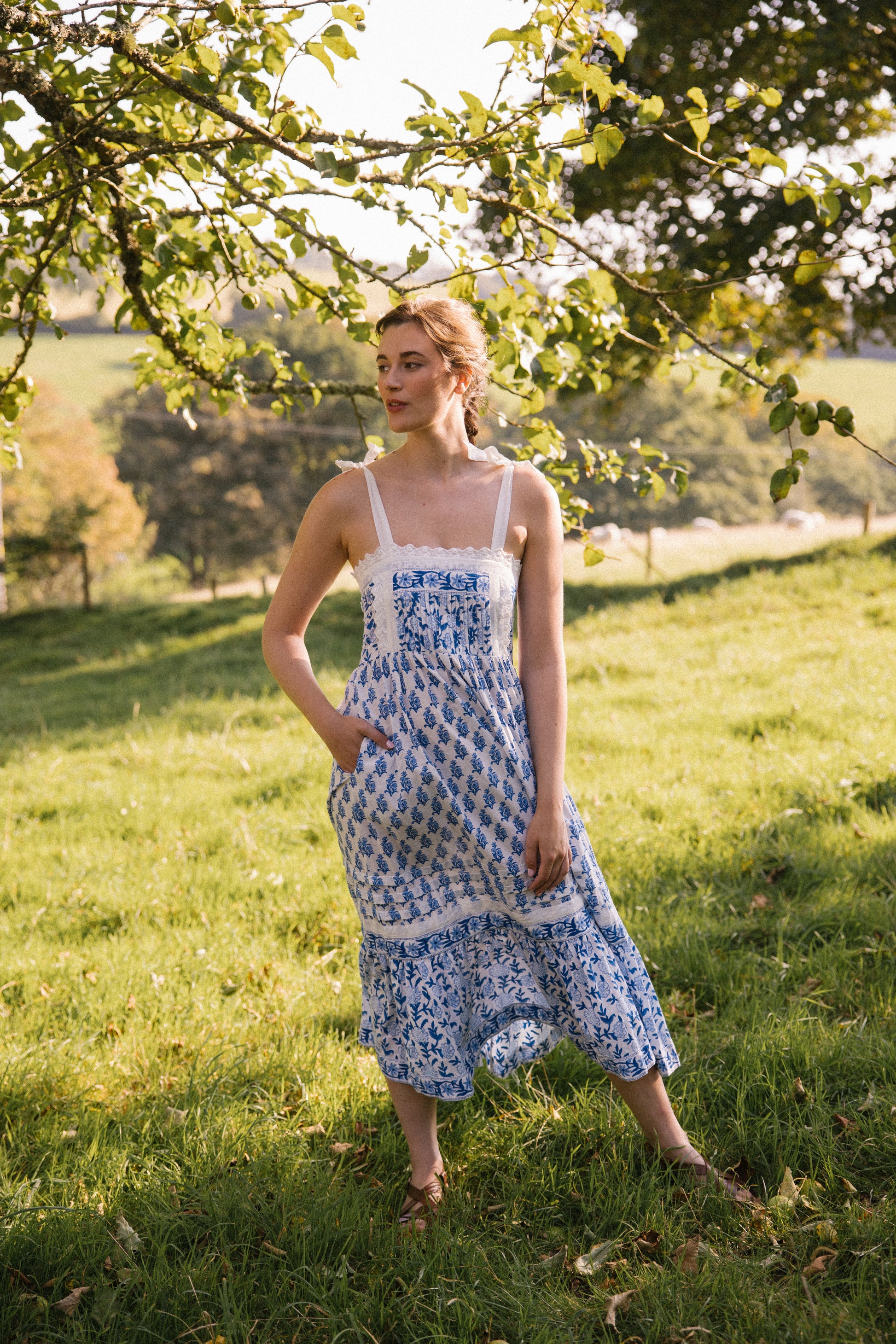 Crafted from organic cotton in the prettiest shade of blue & white, with a super flattering bodice with pleating detail and cotton lace, finished with adjustable shoulder tie straps and pleating detail on the bottom tier, makes this dress a utterly feminine look and of course internal side pockets for your lippy.
