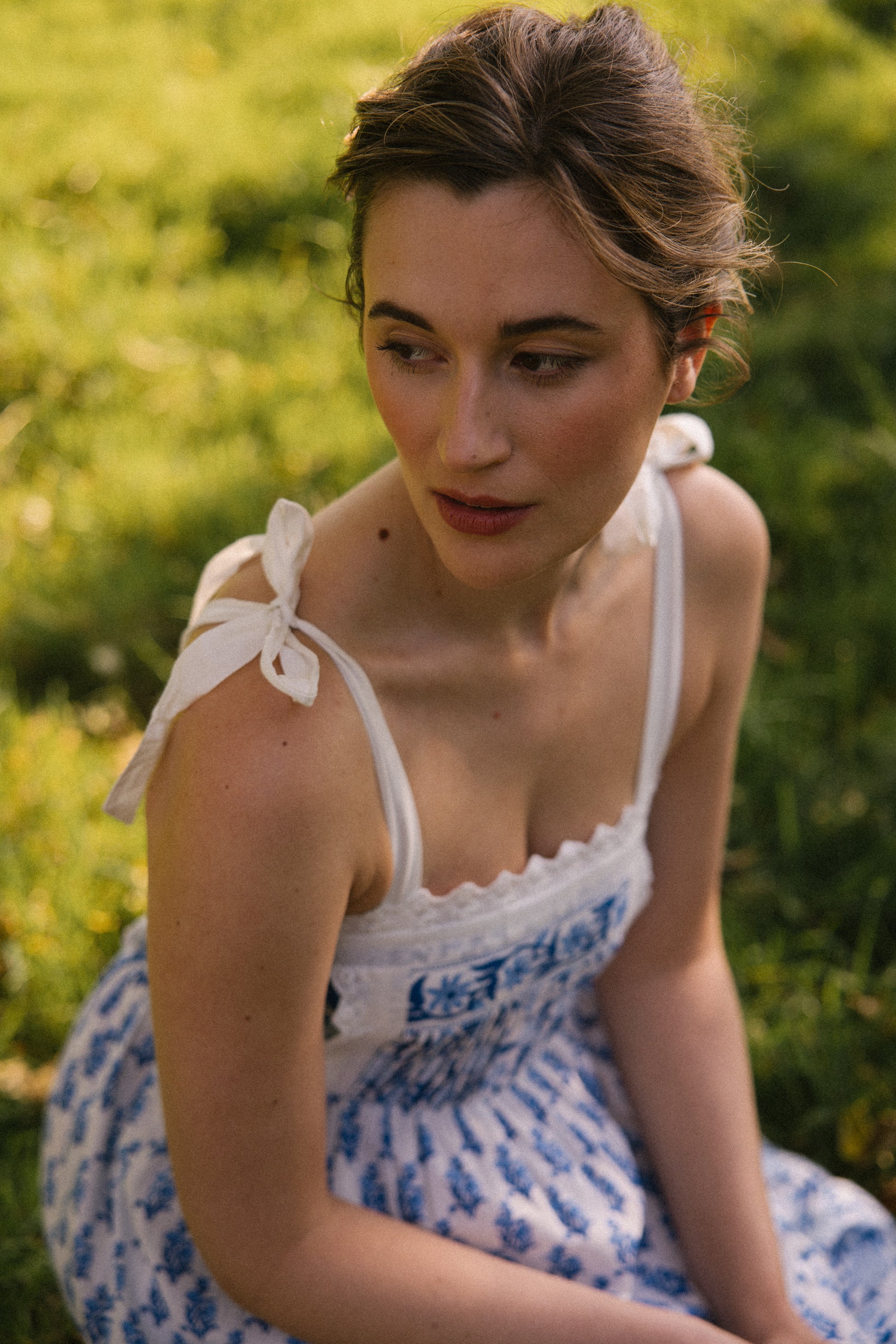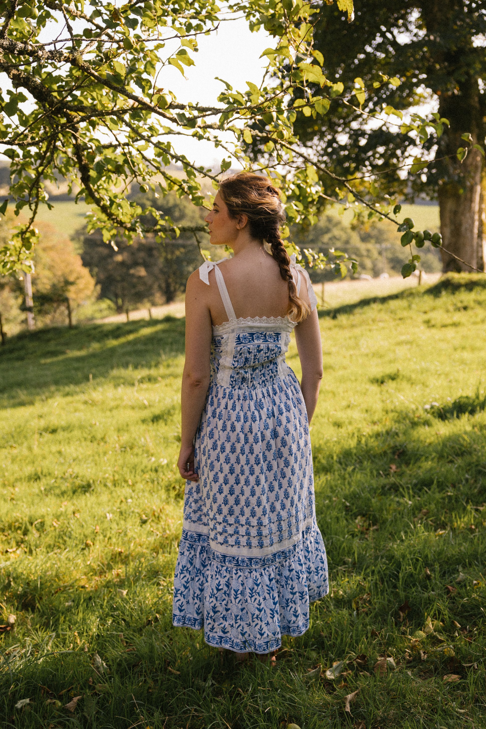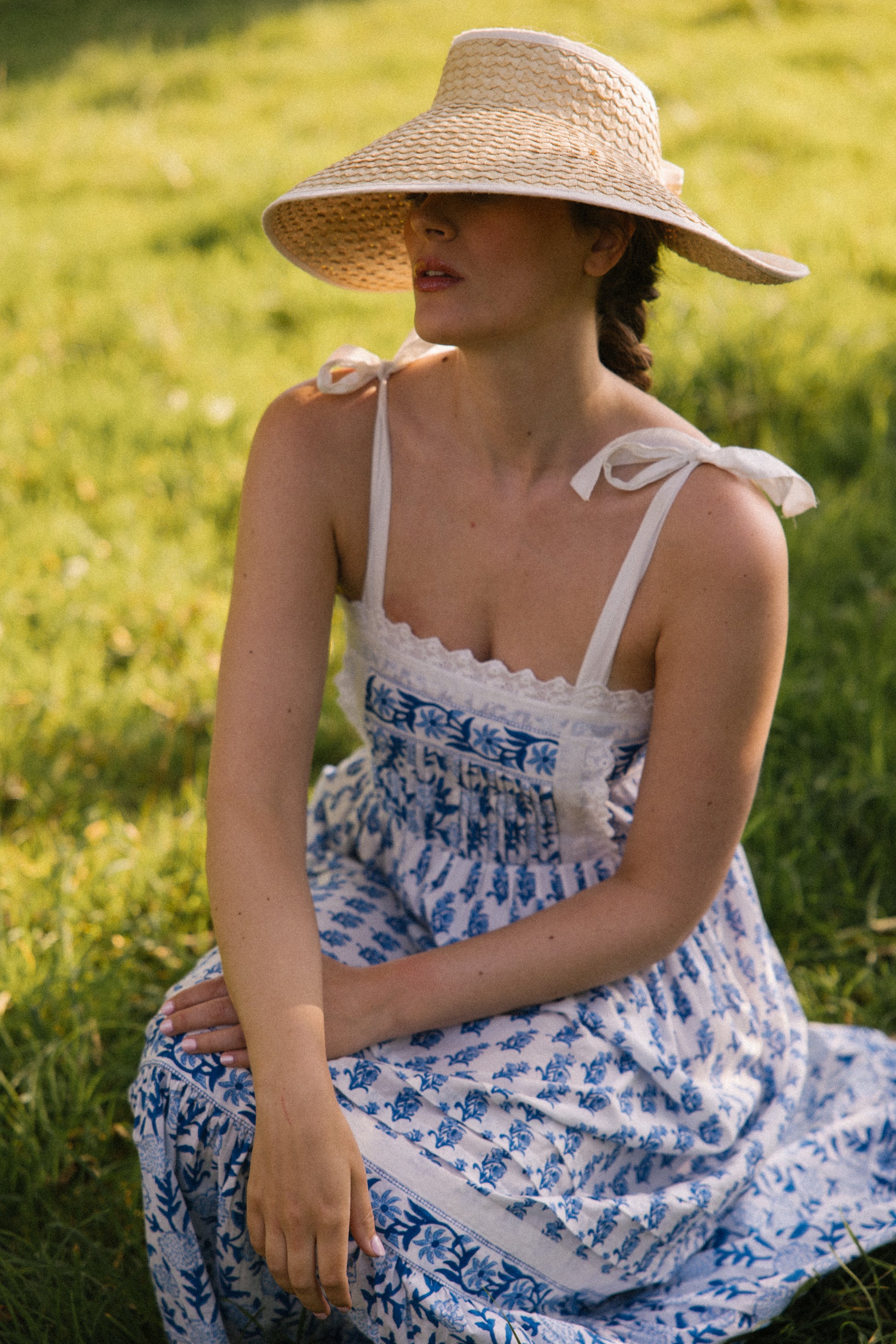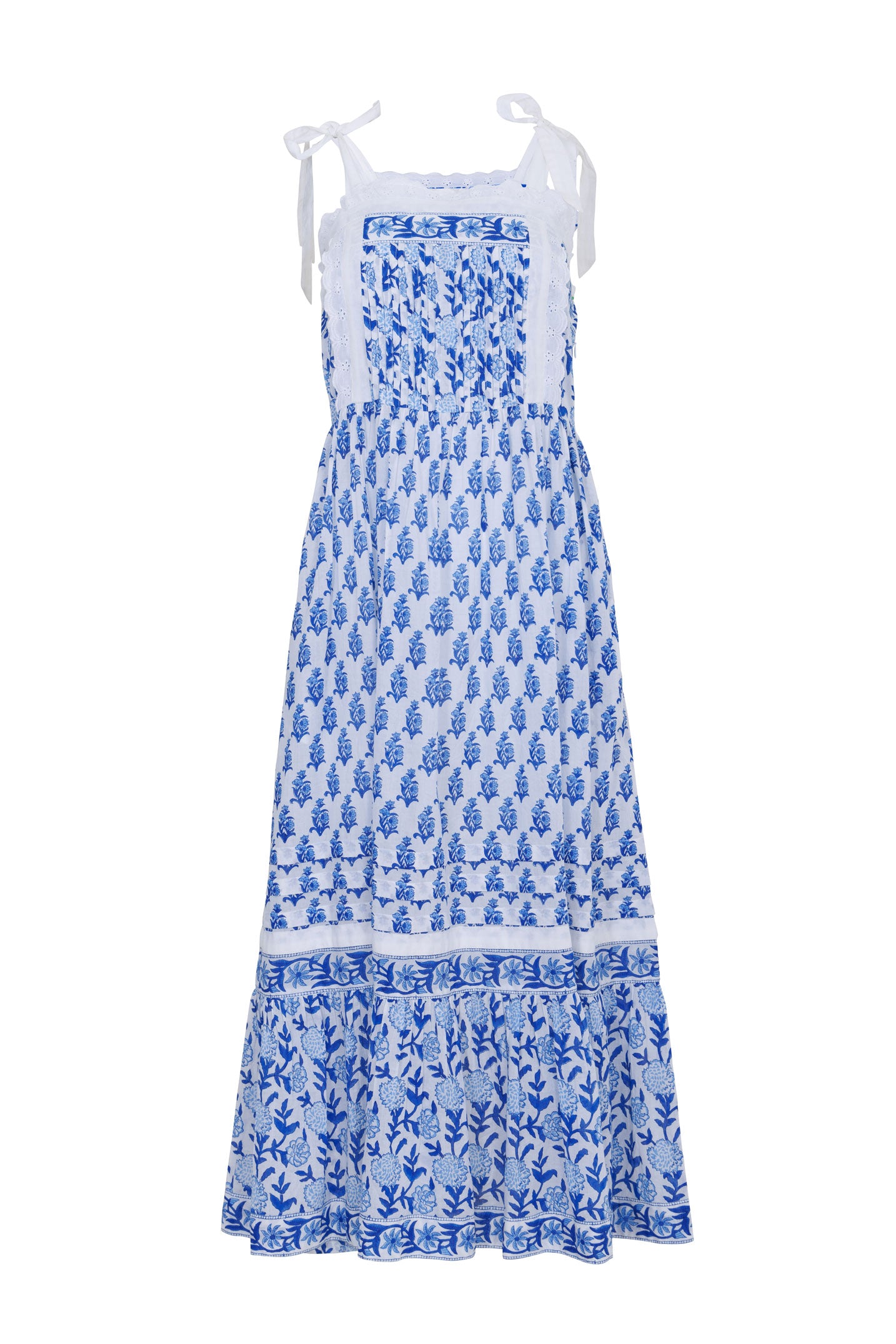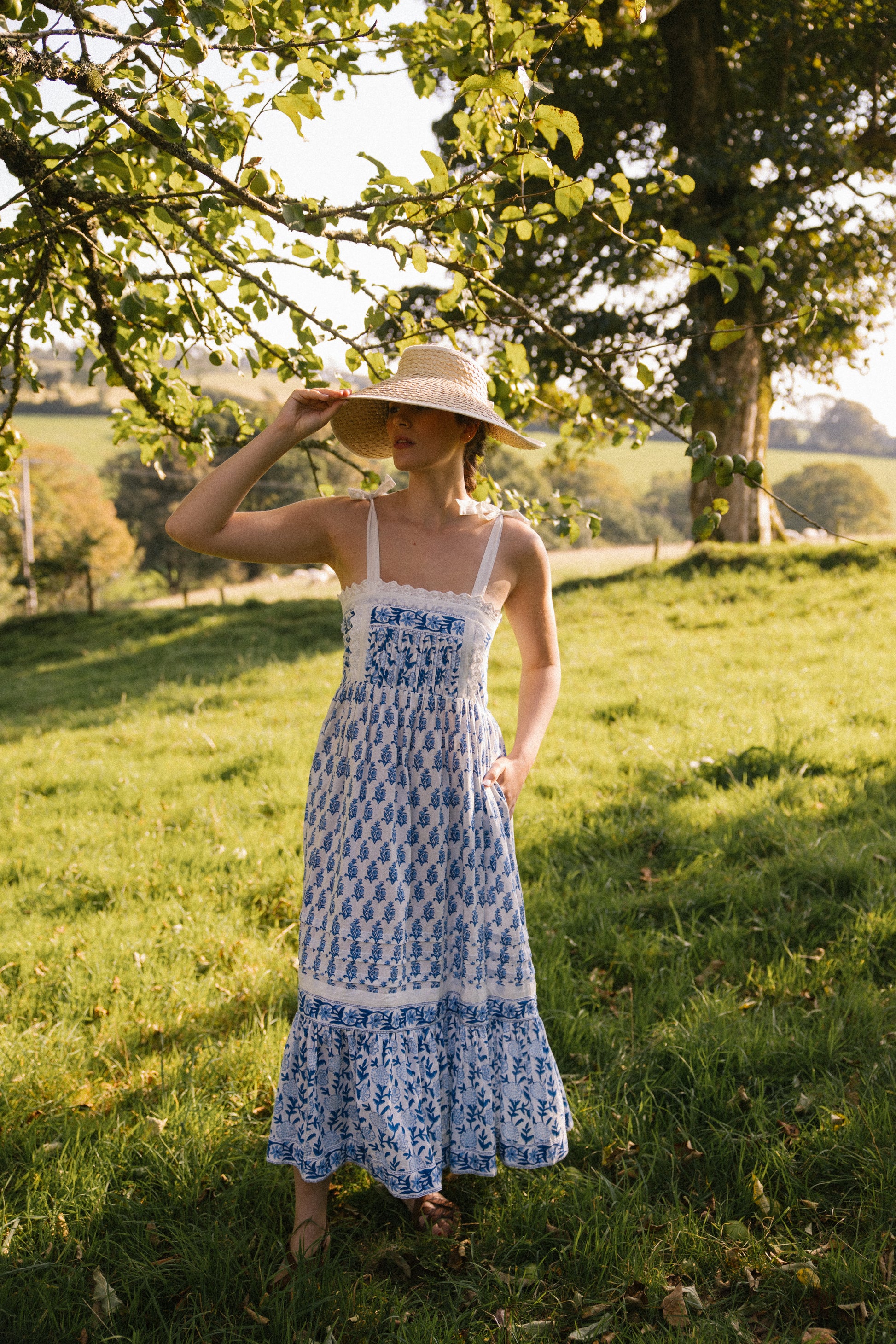Crafted from organic cotton in the prettiest shade of blue & white, with a super flattering bodice with pleating detail and cotton lace, finished with adjustable shoulder tie straps and pleating detail on the bottom tier, makes this dress a utterly feminine look and of course internal side pockets for your lippy.