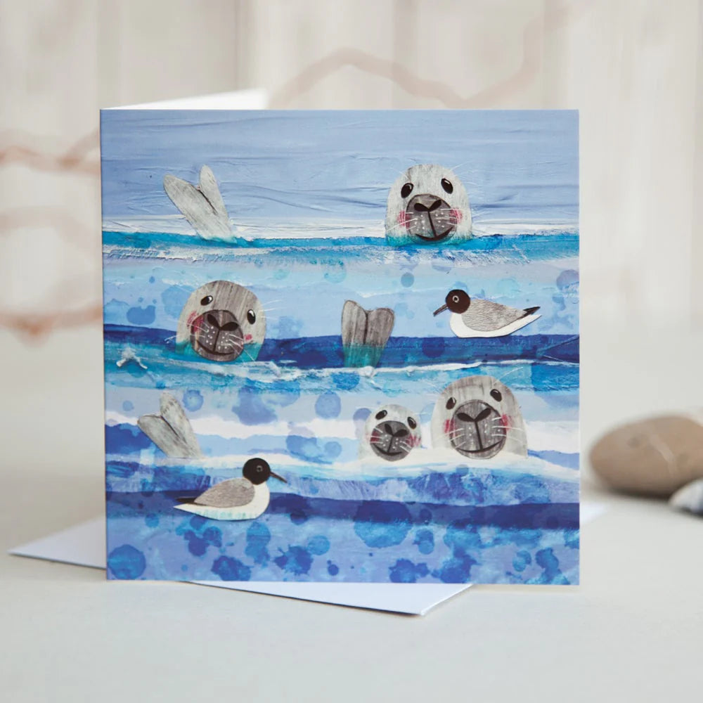 A quirky greetings card featuring charming seals bobbing in the sea amongst the black headed gulls. The perfect card for coast and sea life lovers