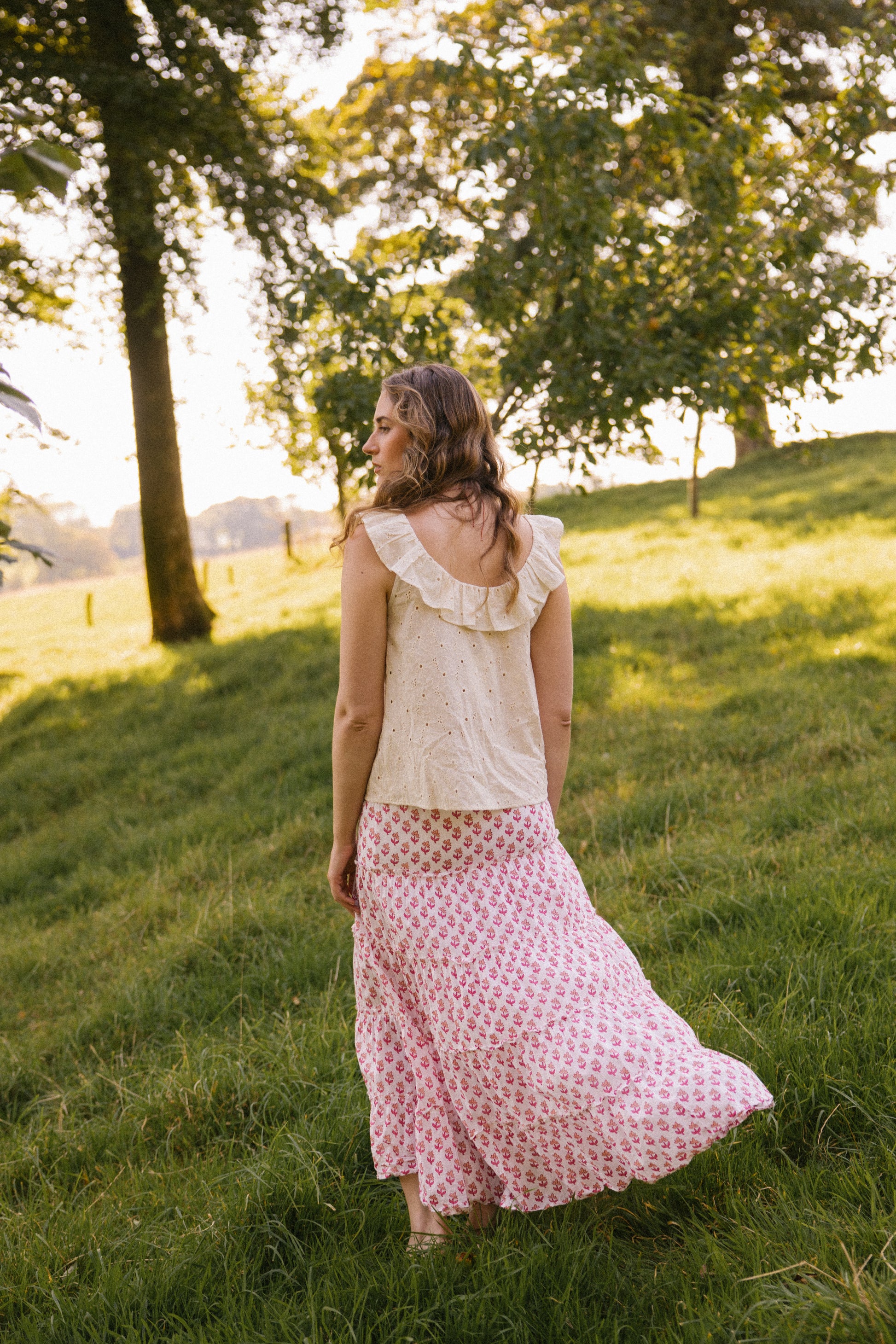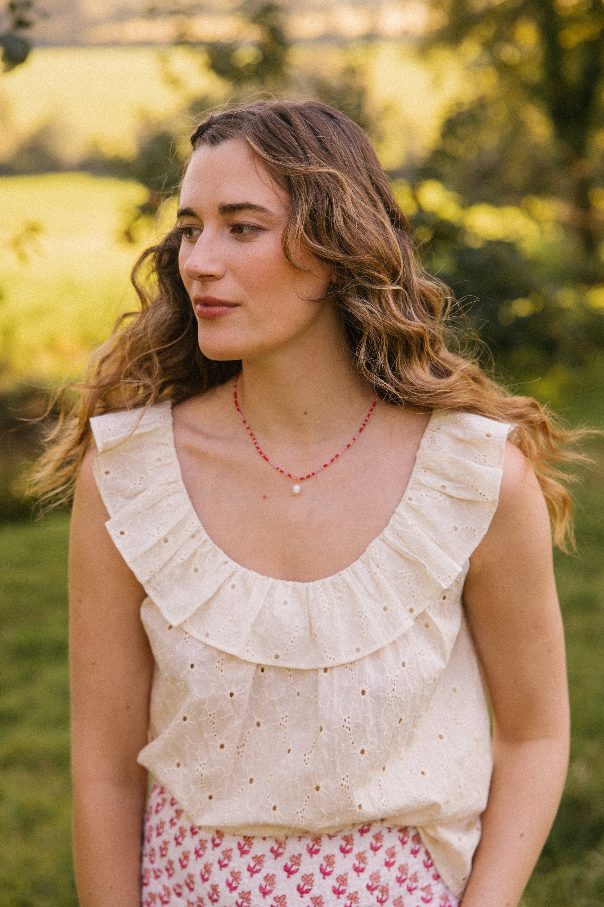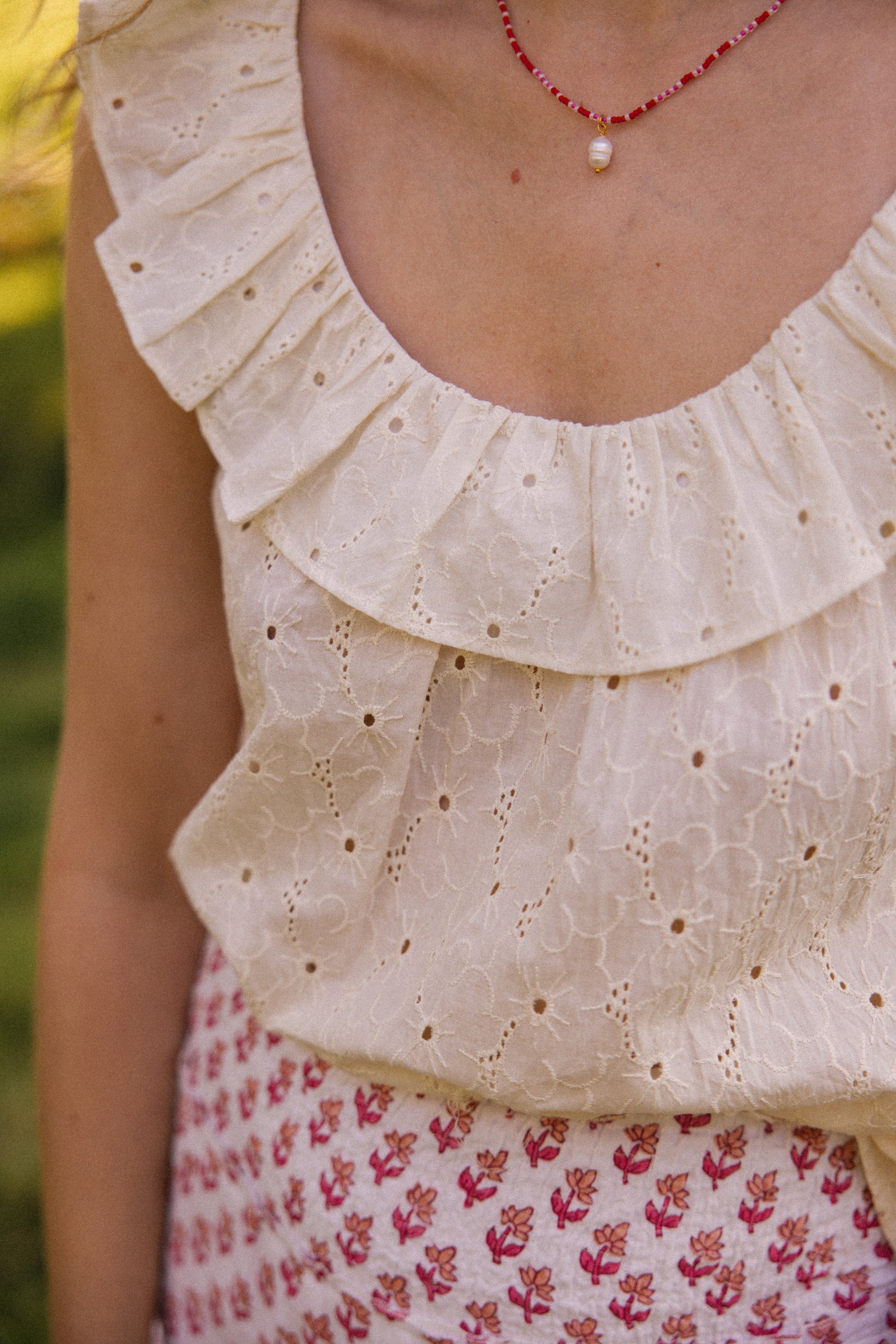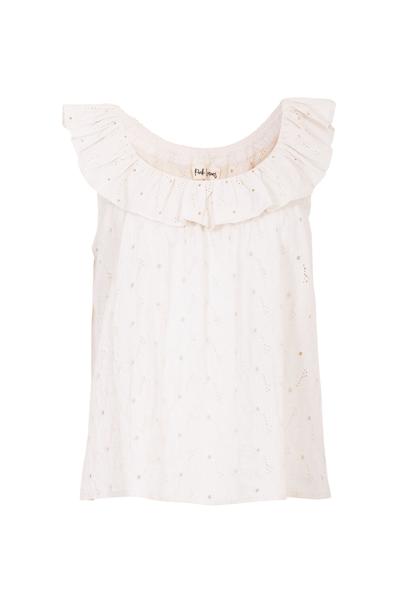Hand crafted from a soft breathable cotton , this floral broderie features a delicate gathered ruffle scoop cut-out neckline front and back, which adds a touch of elegance to any outfit. Designed to be worn on those hot sunny days to keep you cool.