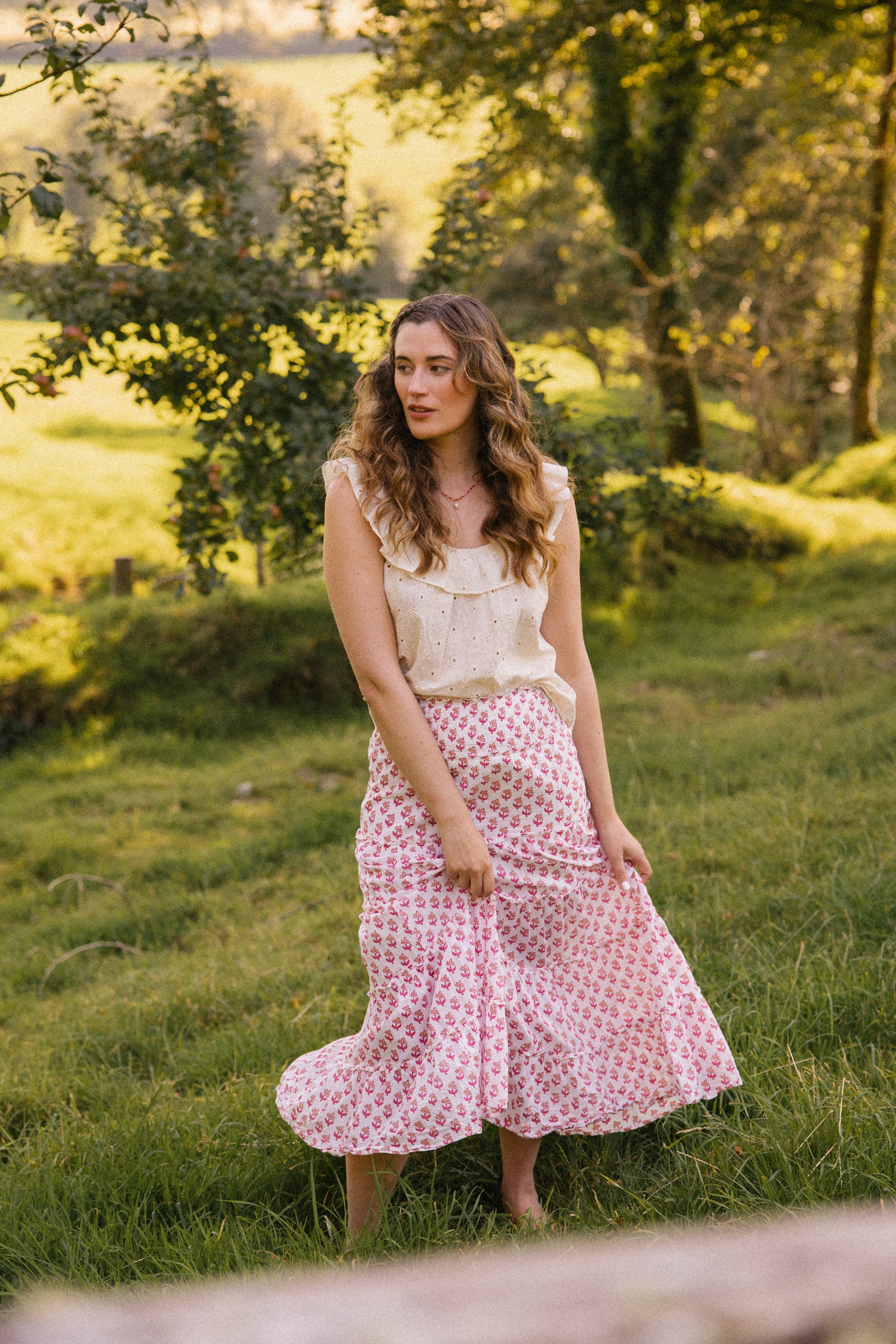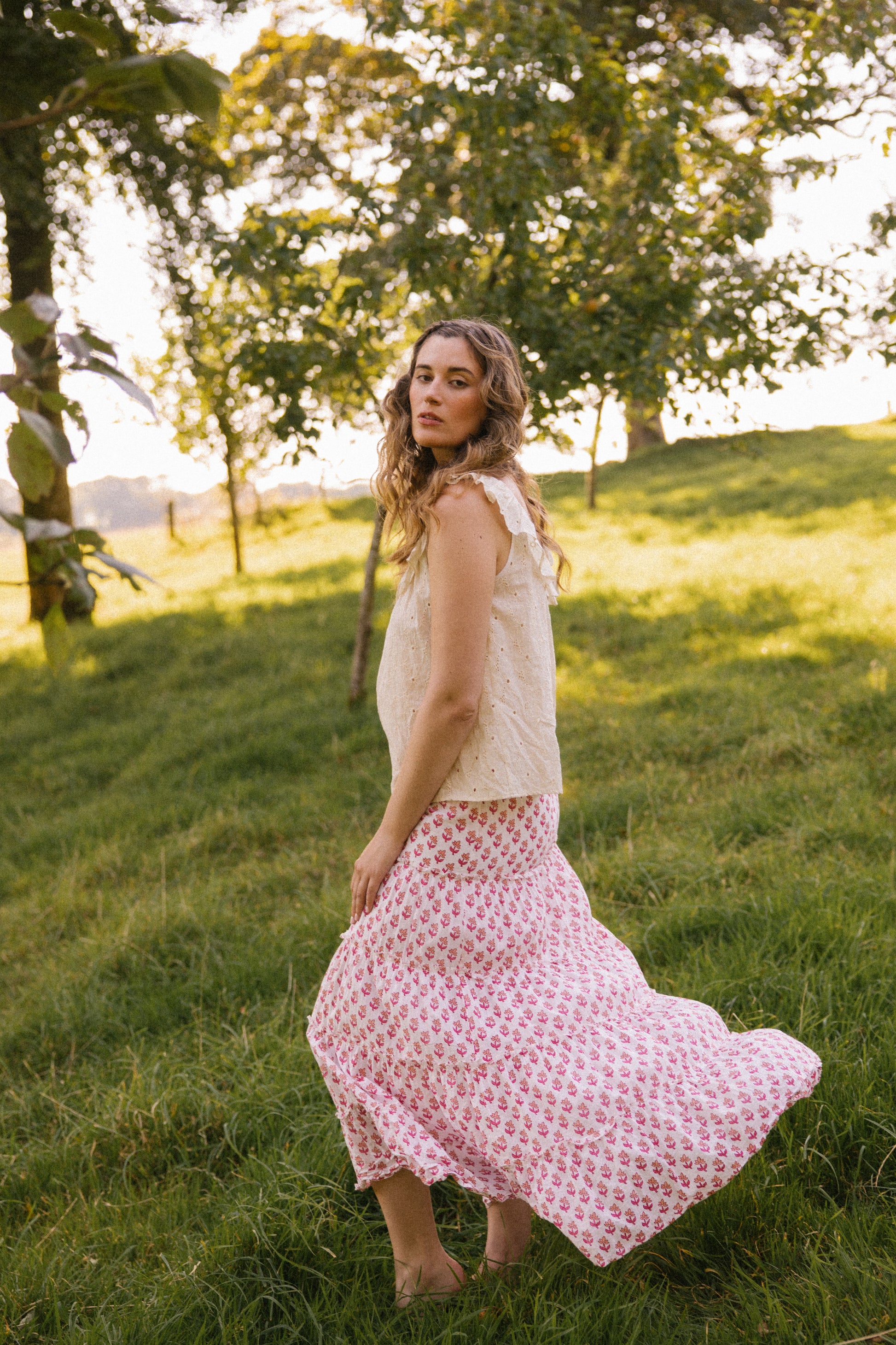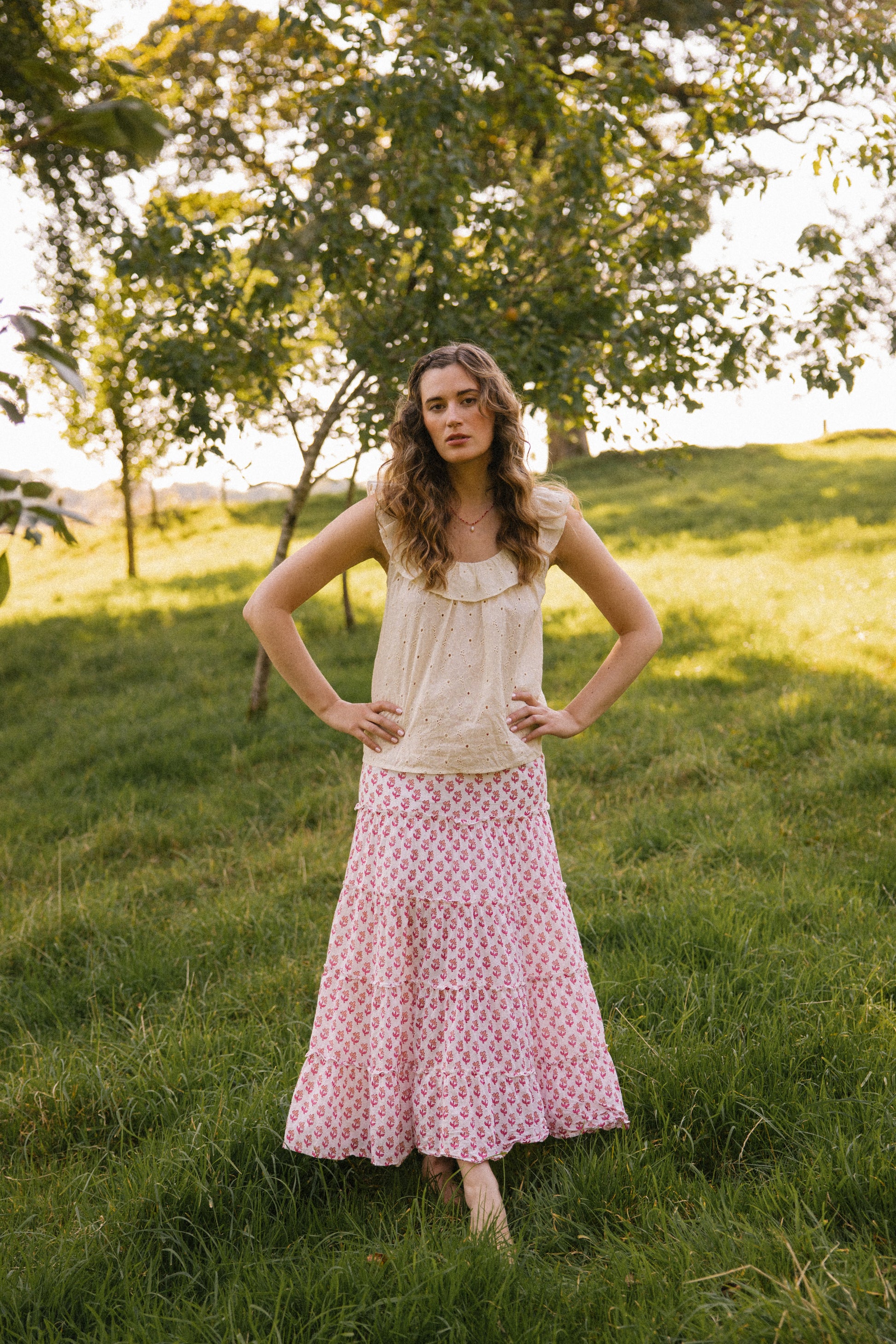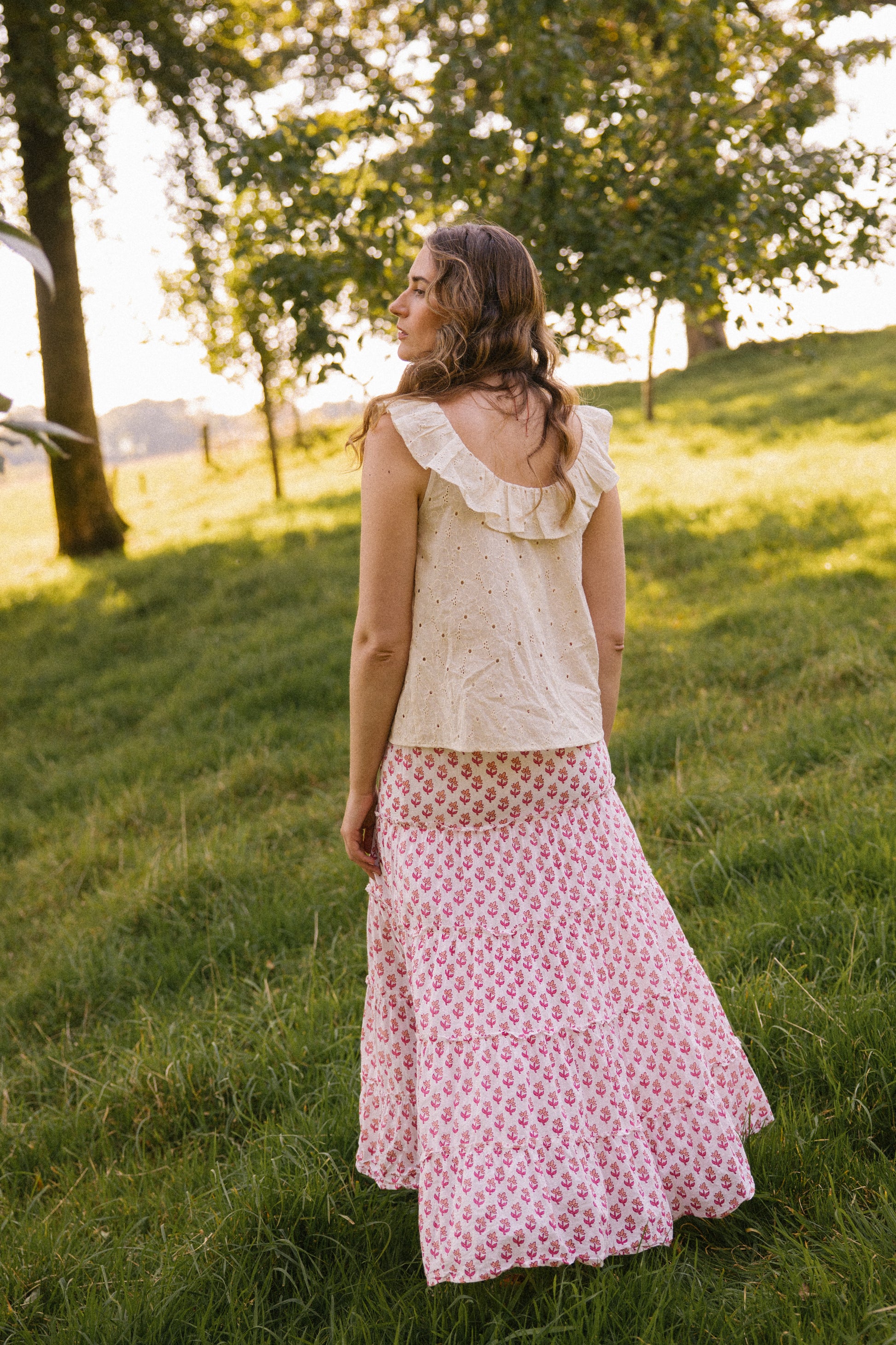 Hand crafted from a soft breathable cotton , this floral broderie features a delicate gathered ruffle scoop cut-out neckline front and back, which adds a touch of elegance to any outfit. Designed to be worn on those hot sunny days to keep you cool.