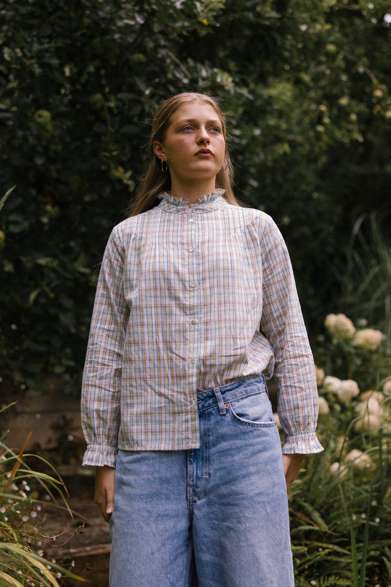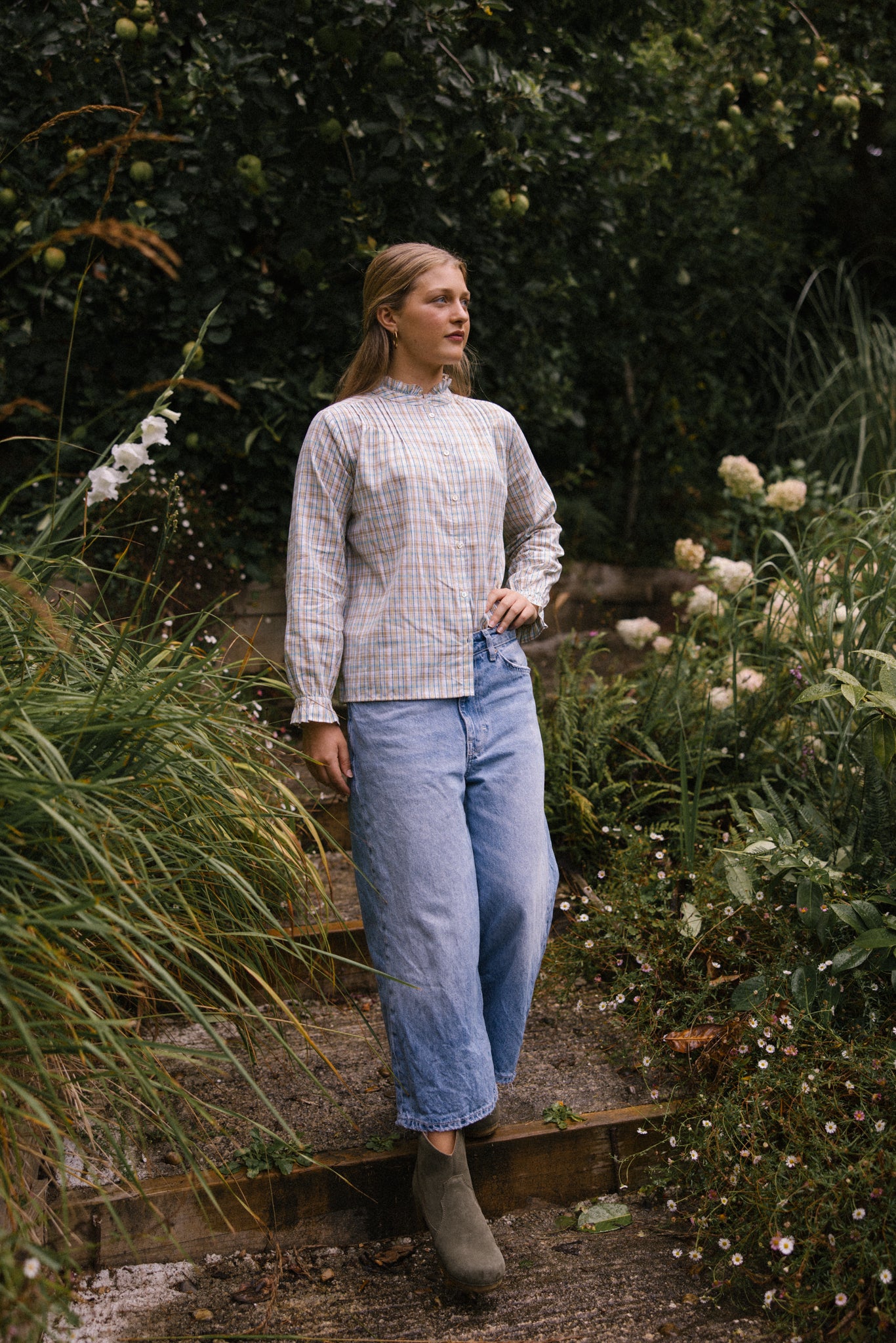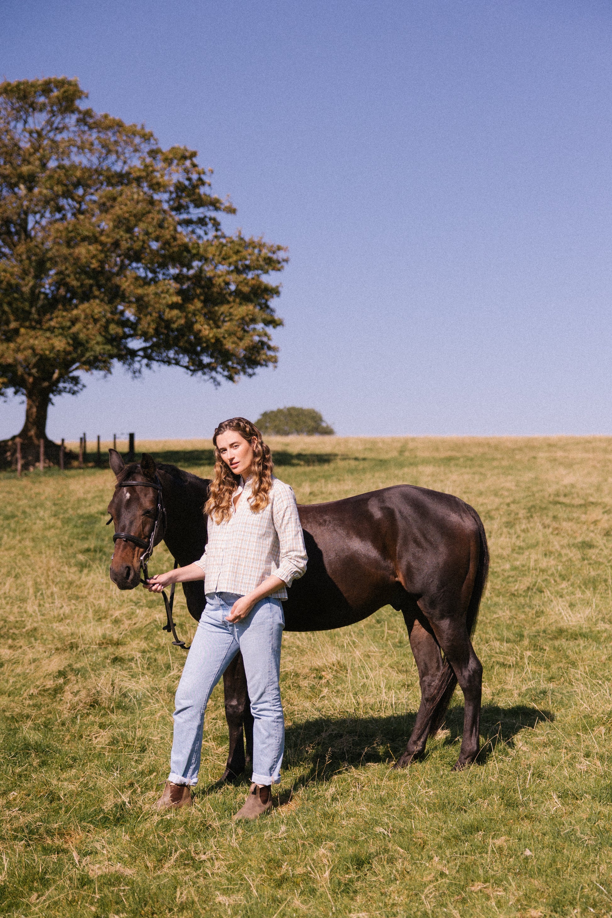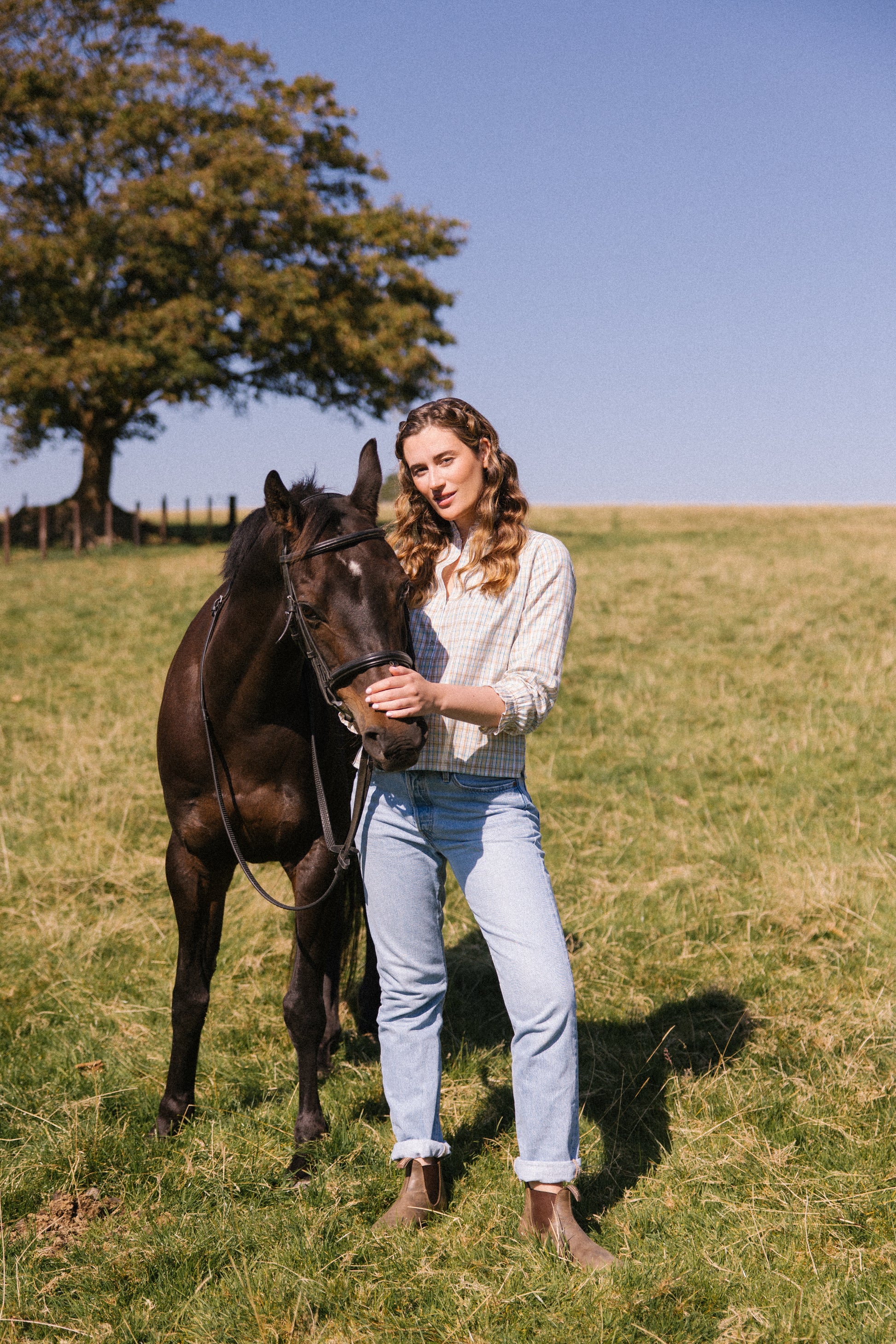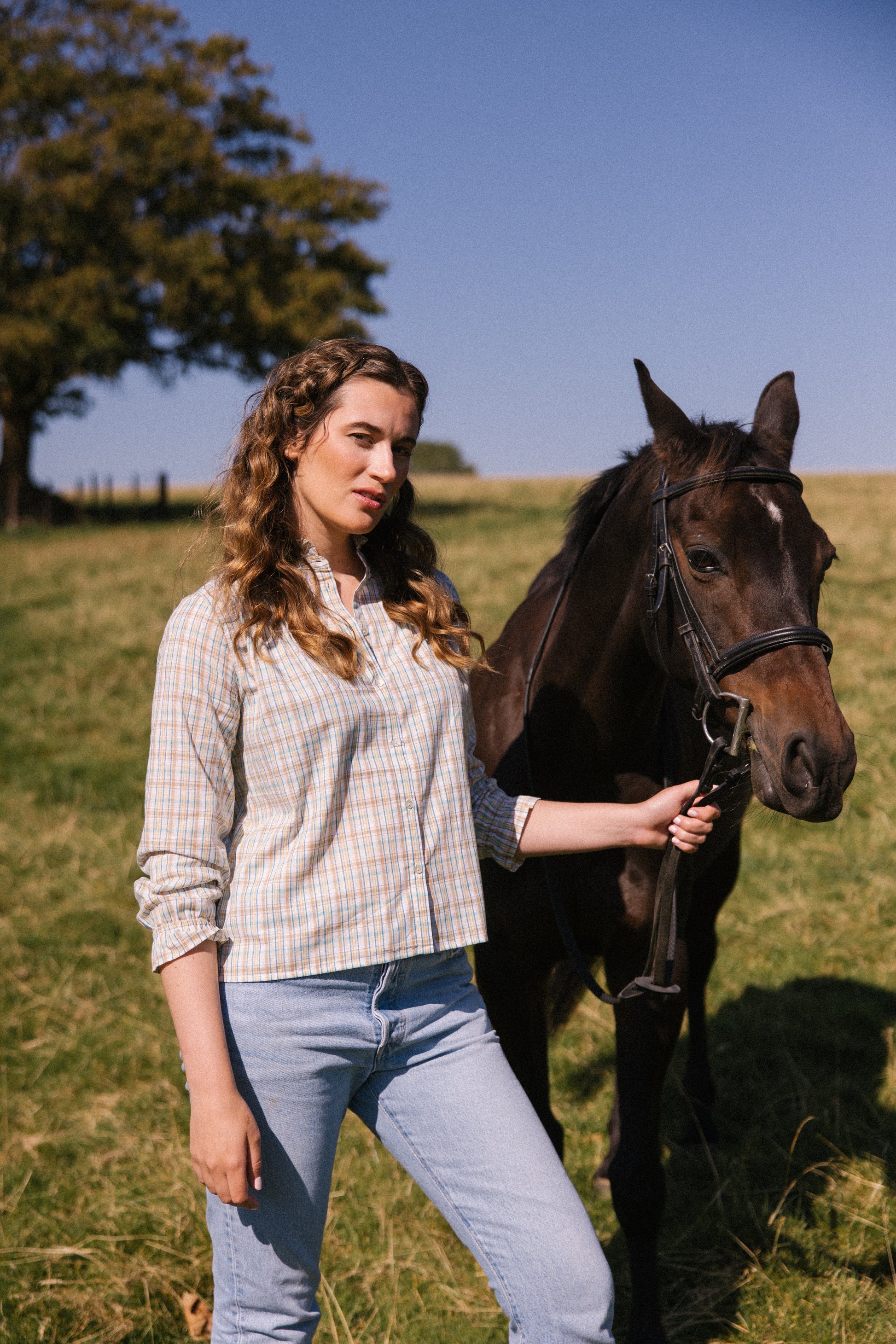 There are certain styles that you know you'll have for years to come, this blouse will be one of them. Its crafted from a lovely weight cotton with a check detail of blue and sandy stripes running in the weave.