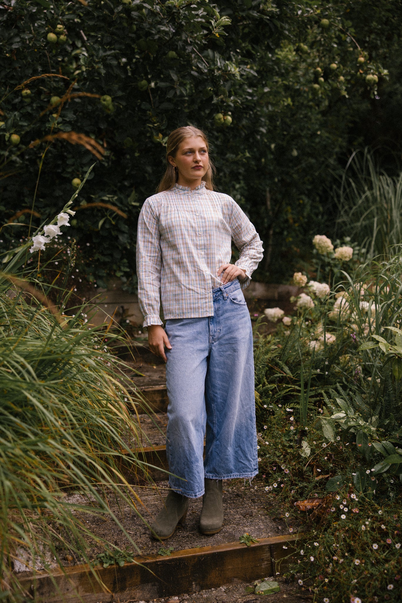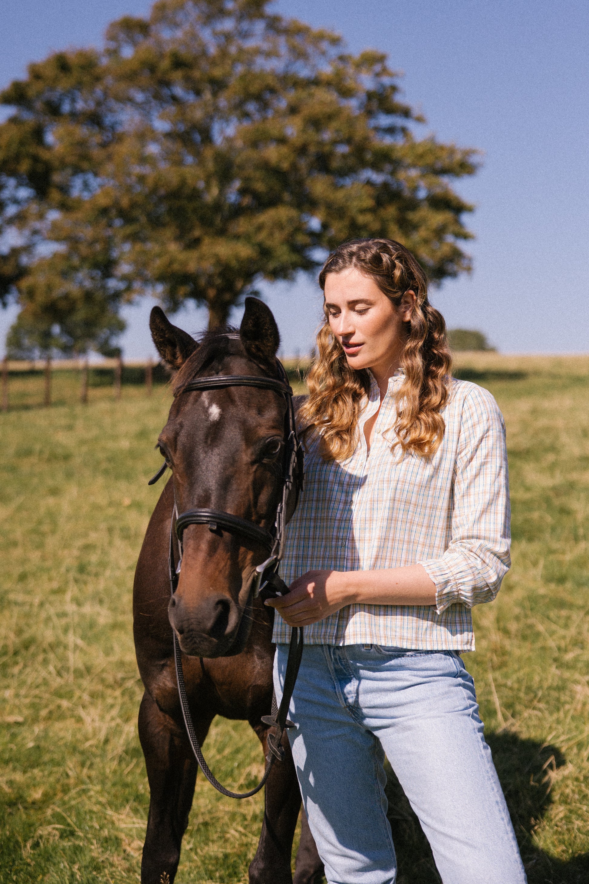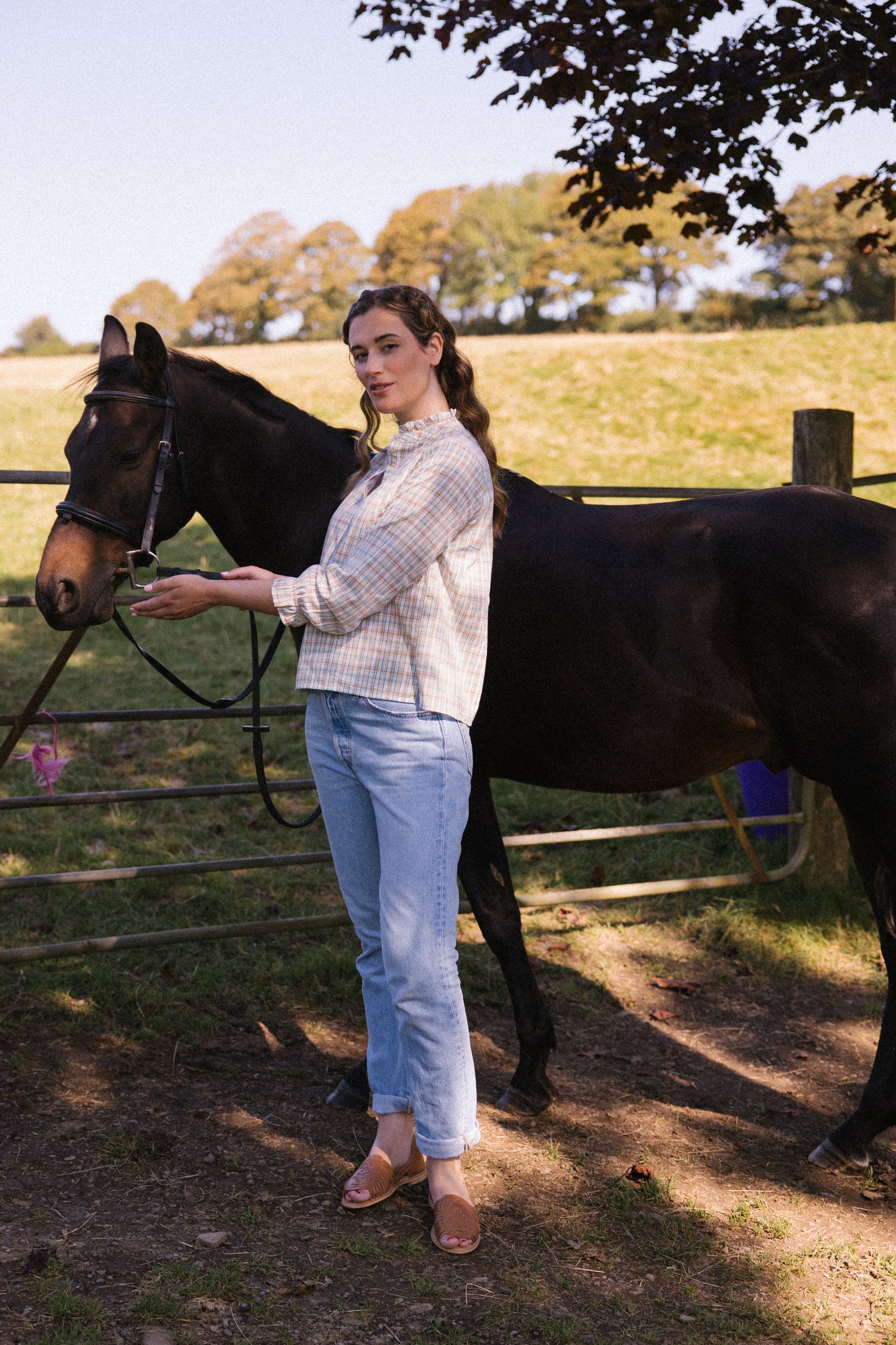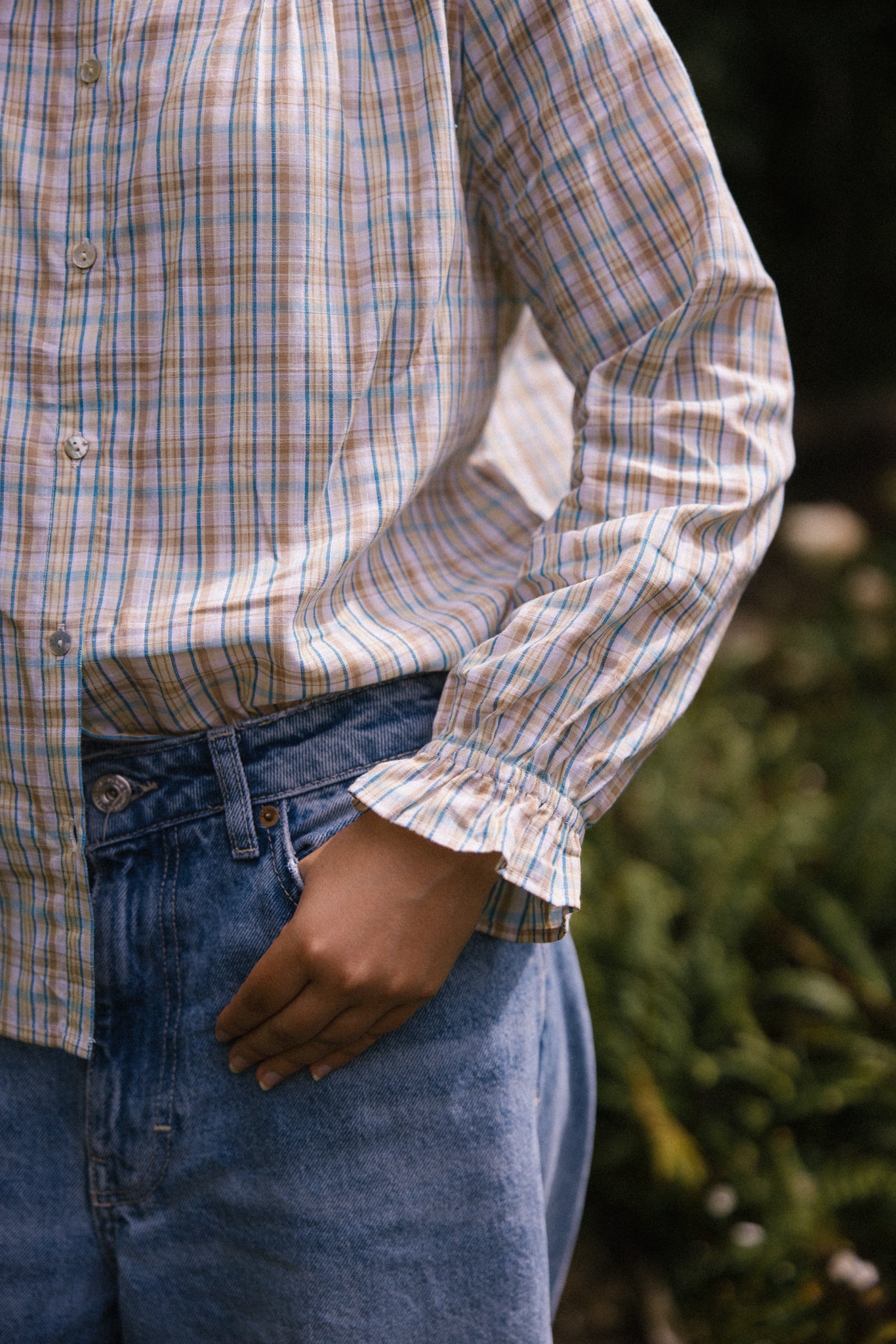 There are certain styles that you know you'll have for years to come, this blouse will be one of them. Its crafted from a lovely weight cotton with a check detail of blue and sandy stripes running in the weave.