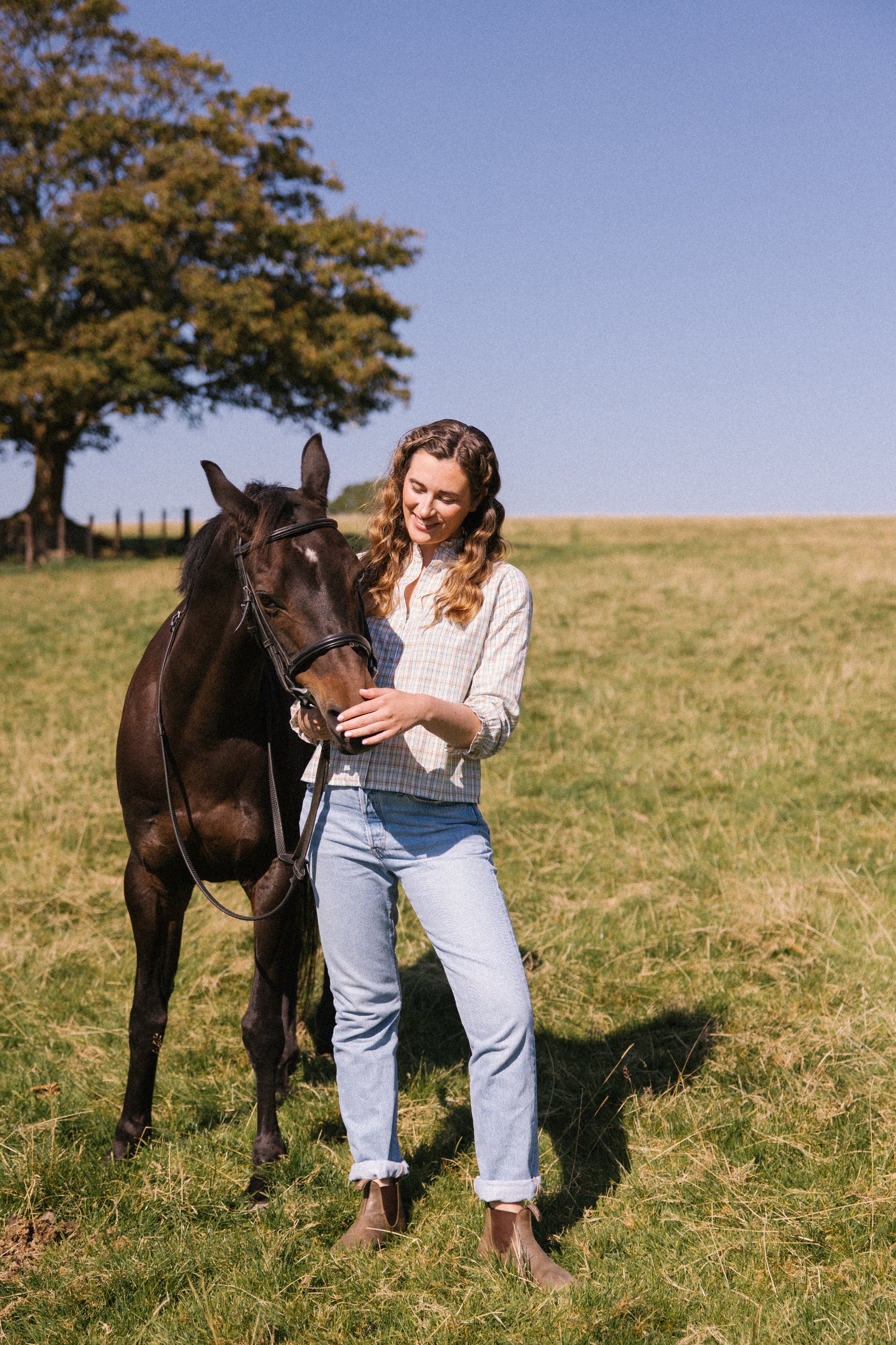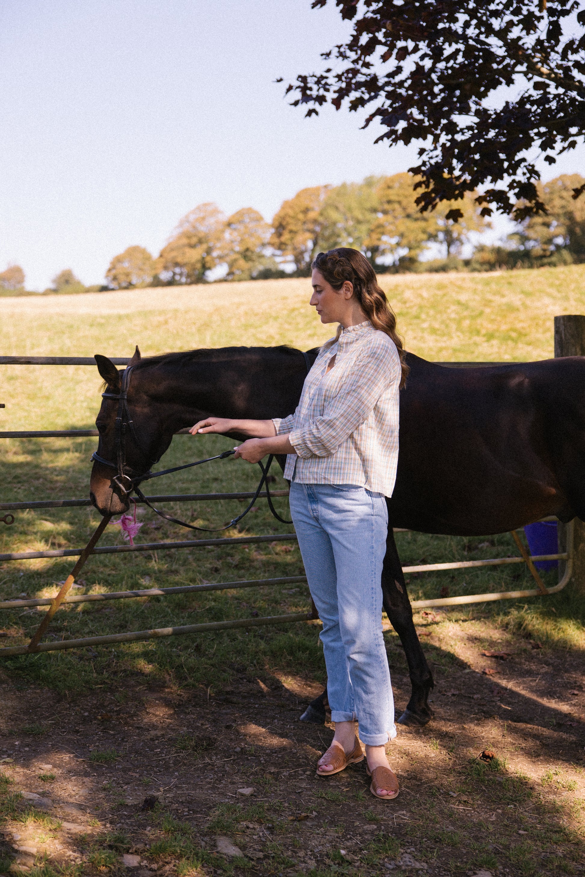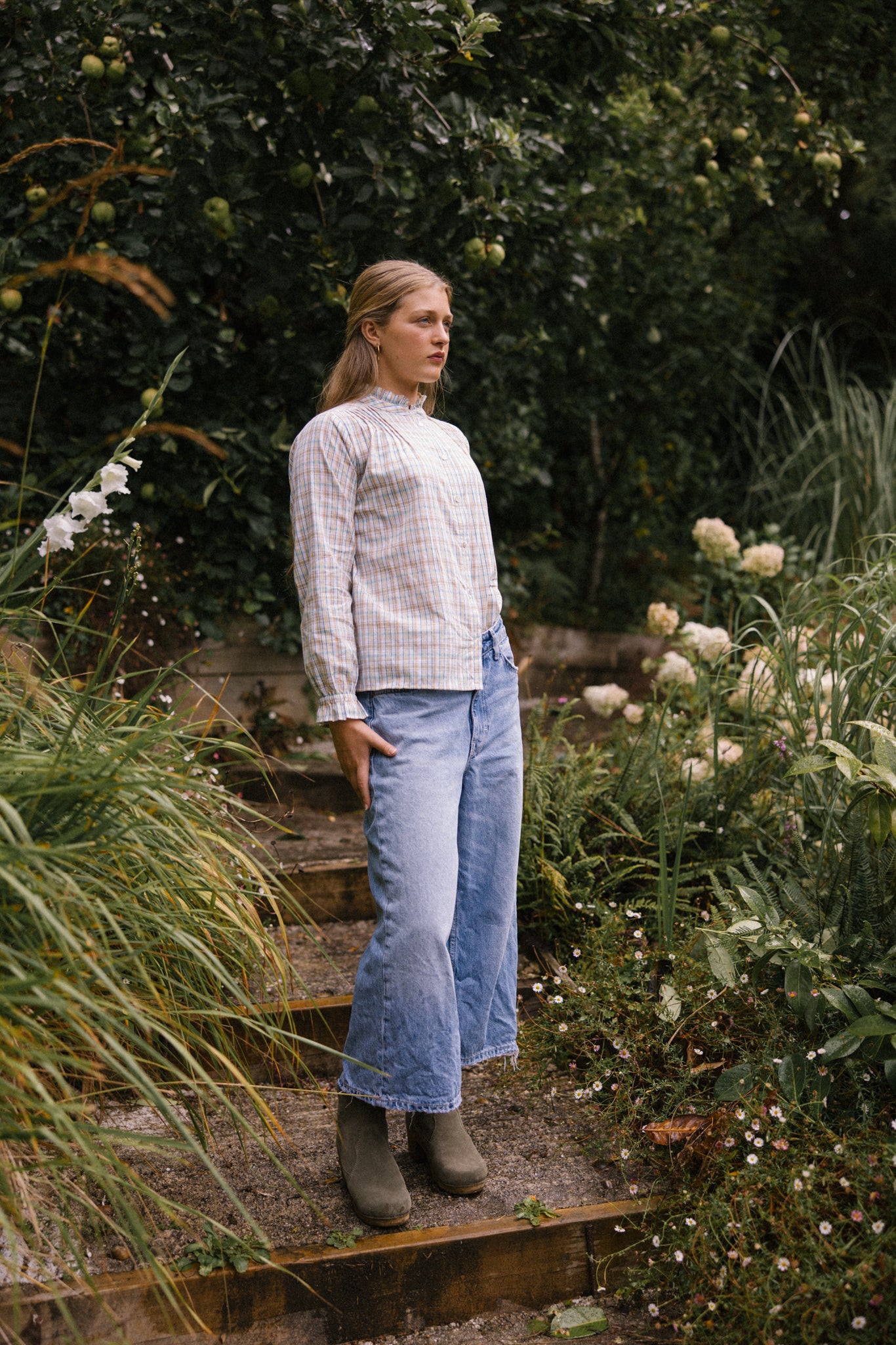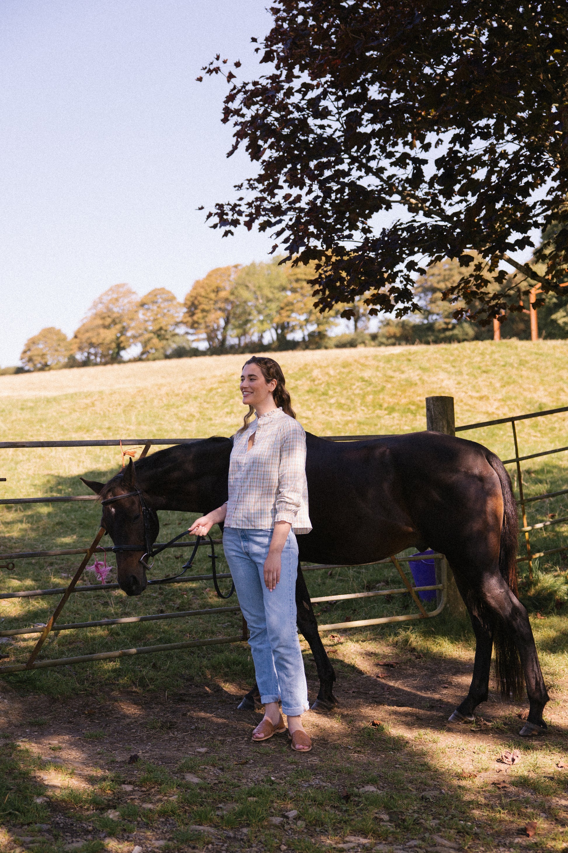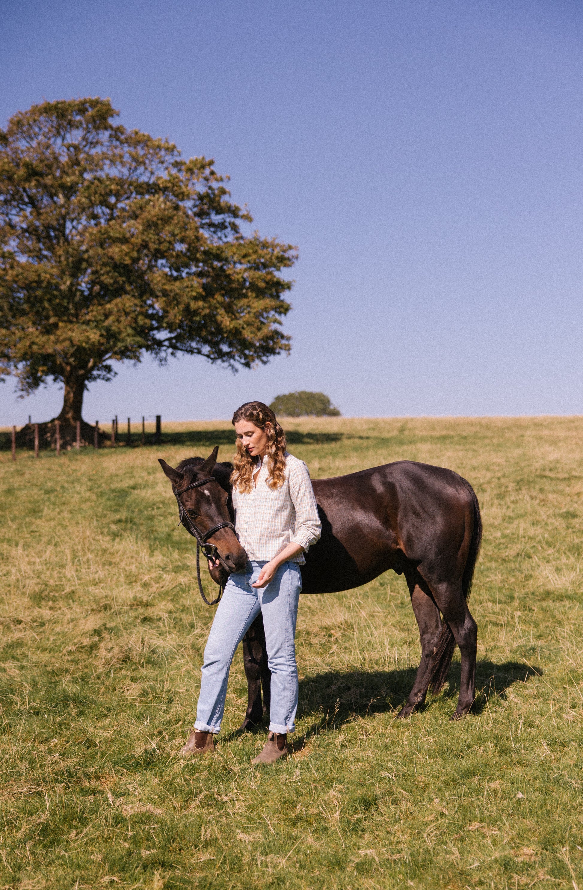 There are certain styles that you know you'll have for years to come, this blouse will be one of them. Its crafted from a lovely weight cotton with a check detail of blue and sandy stripes running in the weave.