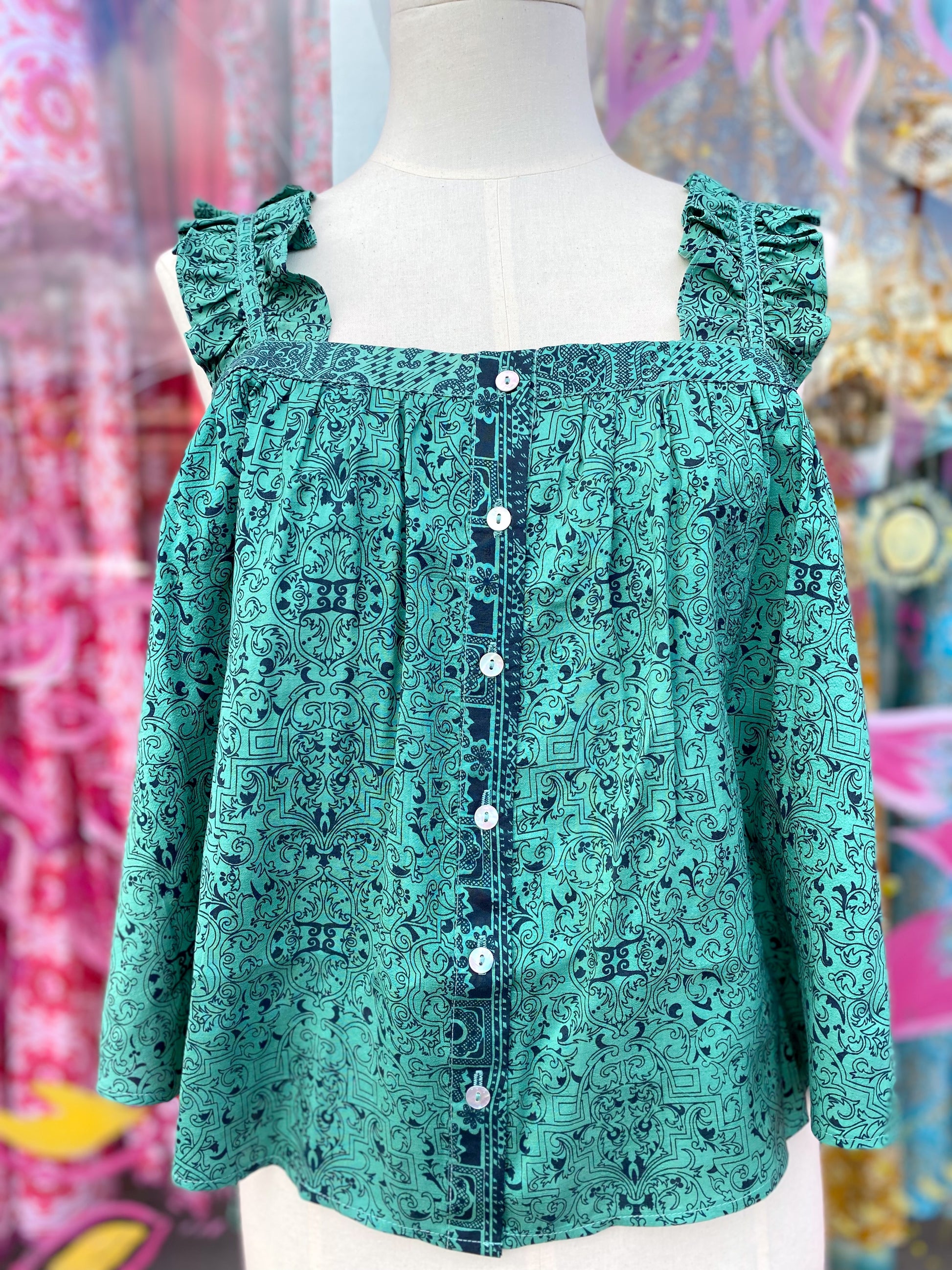 Lilly is the prettiest of camisoles made in pure vintage silk from up-cycled vintage sari’s. Designed for a loose fit. She has delicate ruffle strap details with adjustable metal attachments at the back, with mother of pearl buttons running down the front. This camisole is ideal for layering, it has a gentle flared hem, with a dropped them hem on the back which creates a relaxed look but also gives it a elegant touch. Wear yours with jeans, skirts, shorts, the style ways are endless. Lilly can be worn casually or dressed up with jewels for a night out .