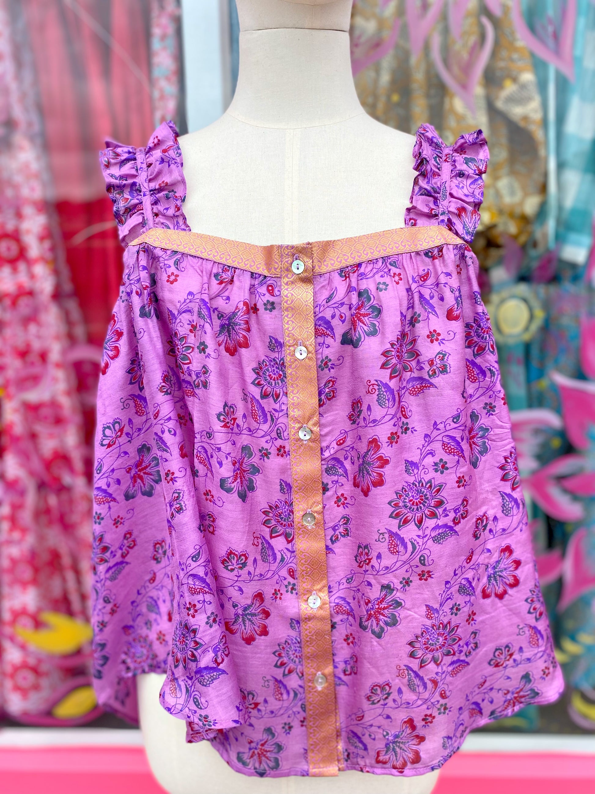 Lilly is the prettiest of camisoles made in pure vintage silk from up-cycled vintage sari’s. Designed for a loose fit. She has delicate ruffle strap details with adjustable metal attachments at the back, with mother of pearl buttons running down the front. This camisole is ideal for layering, it has a gentle flared hem, with a dropped them hem on the back which creates a relaxed look but also gives it a elegant touch. Wear yours with jeans, skirts, shorts, the style ways are endless. Lilly can be worn casually or dressed up with jewels for a night out .