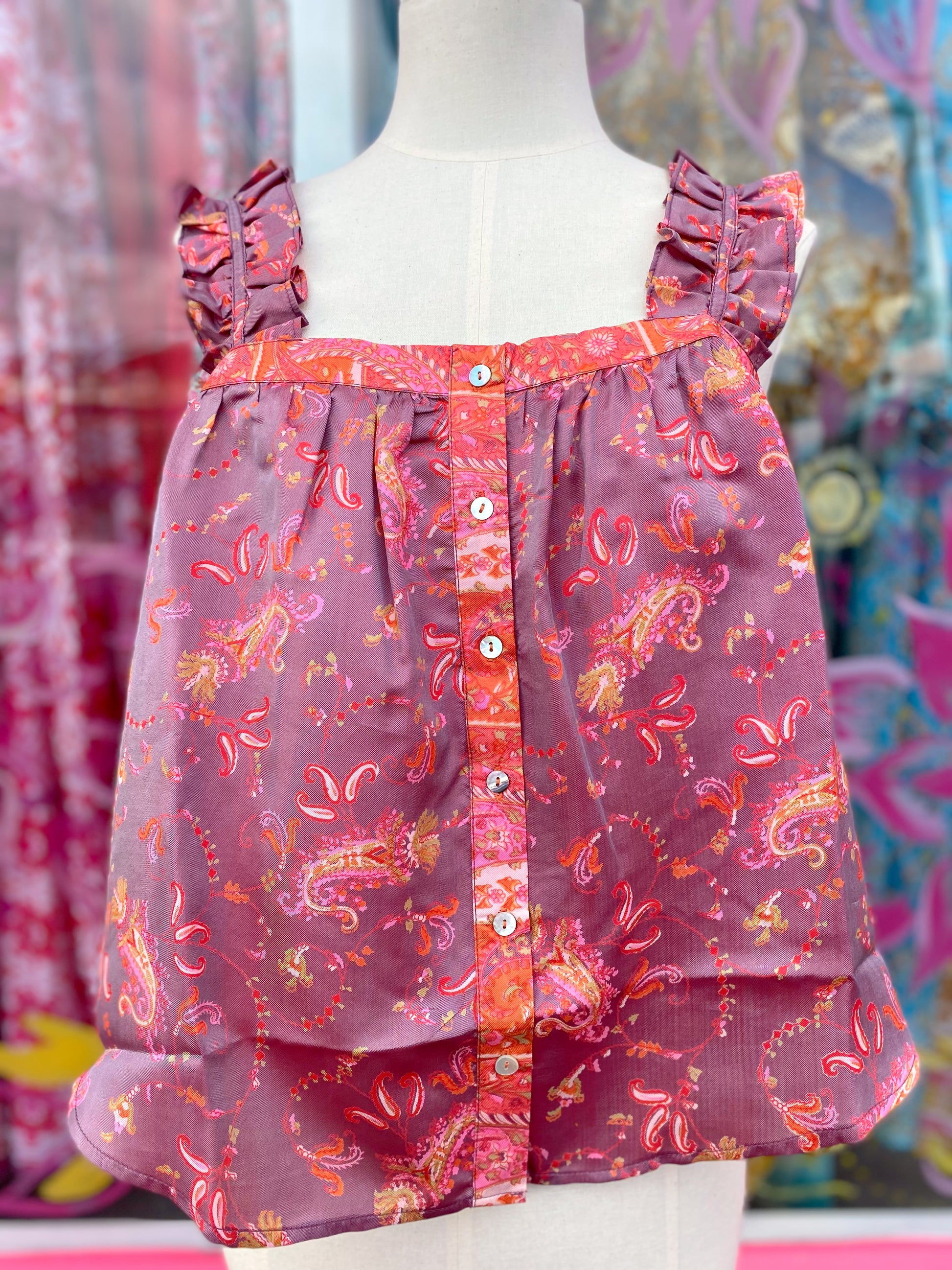 Lilly is the prettiest of camisoles made in pure vintage silk from up-cycled vintage sari’s. Designed for a loose fit. She has delicate ruffle strap details with adjustable metal attachments at the back, with mother of pearl buttons running down the front. This camisole is ideal for layering, it has a gentle flared hem, with a dropped them hem on the back which creates a relaxed look but also gives it a elegant touch. Wear yours with jeans, skirts, shorts, the style ways are endless. Lilly can be worn casually or dressed up with jewels for a night out .