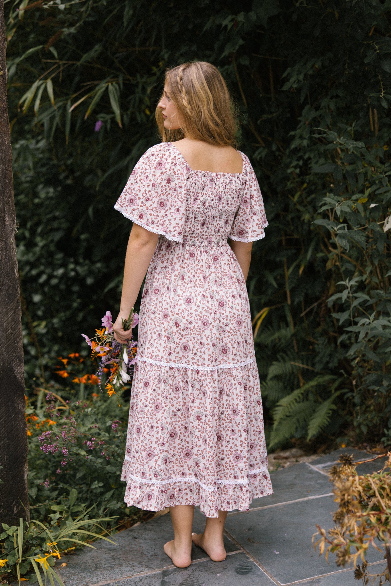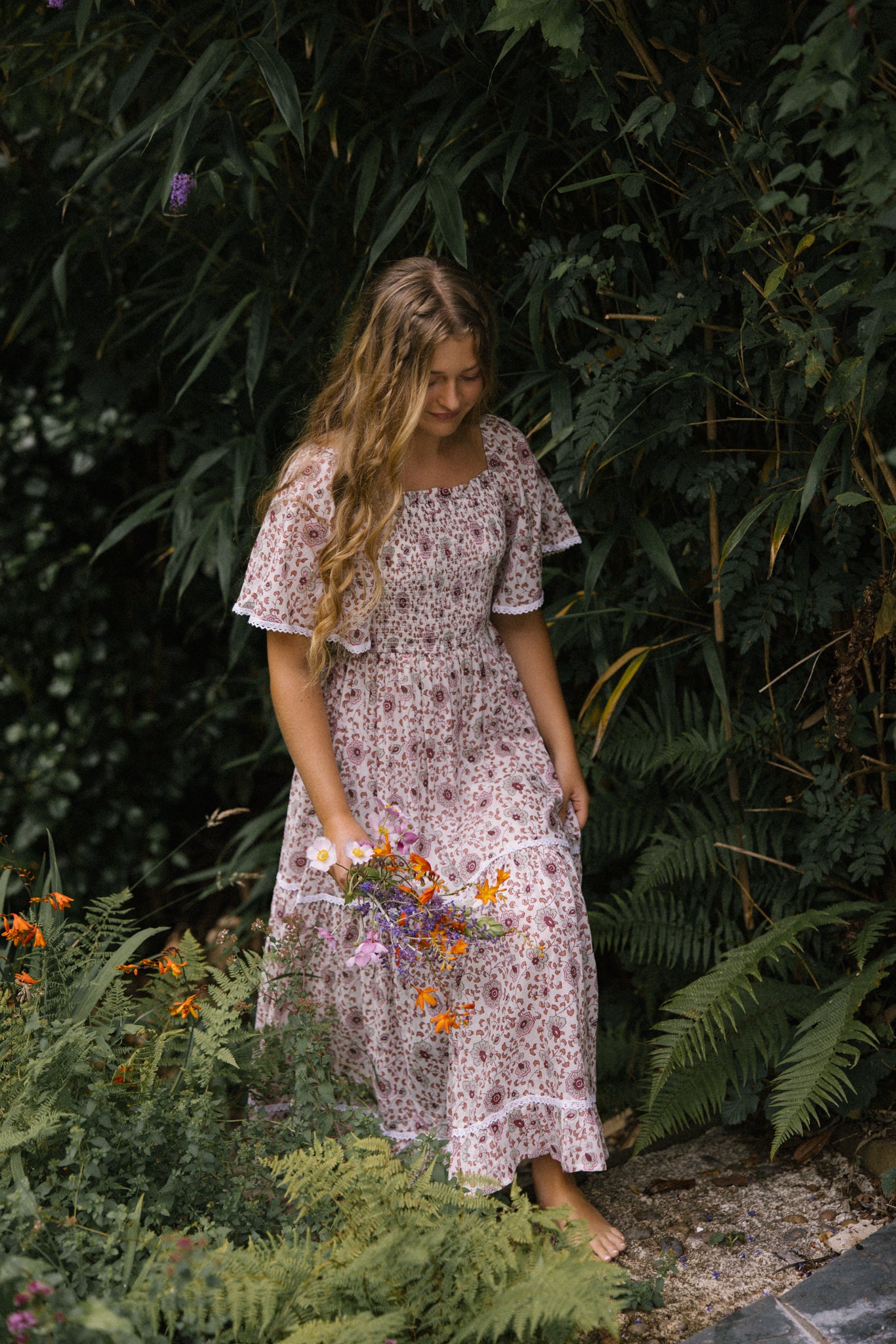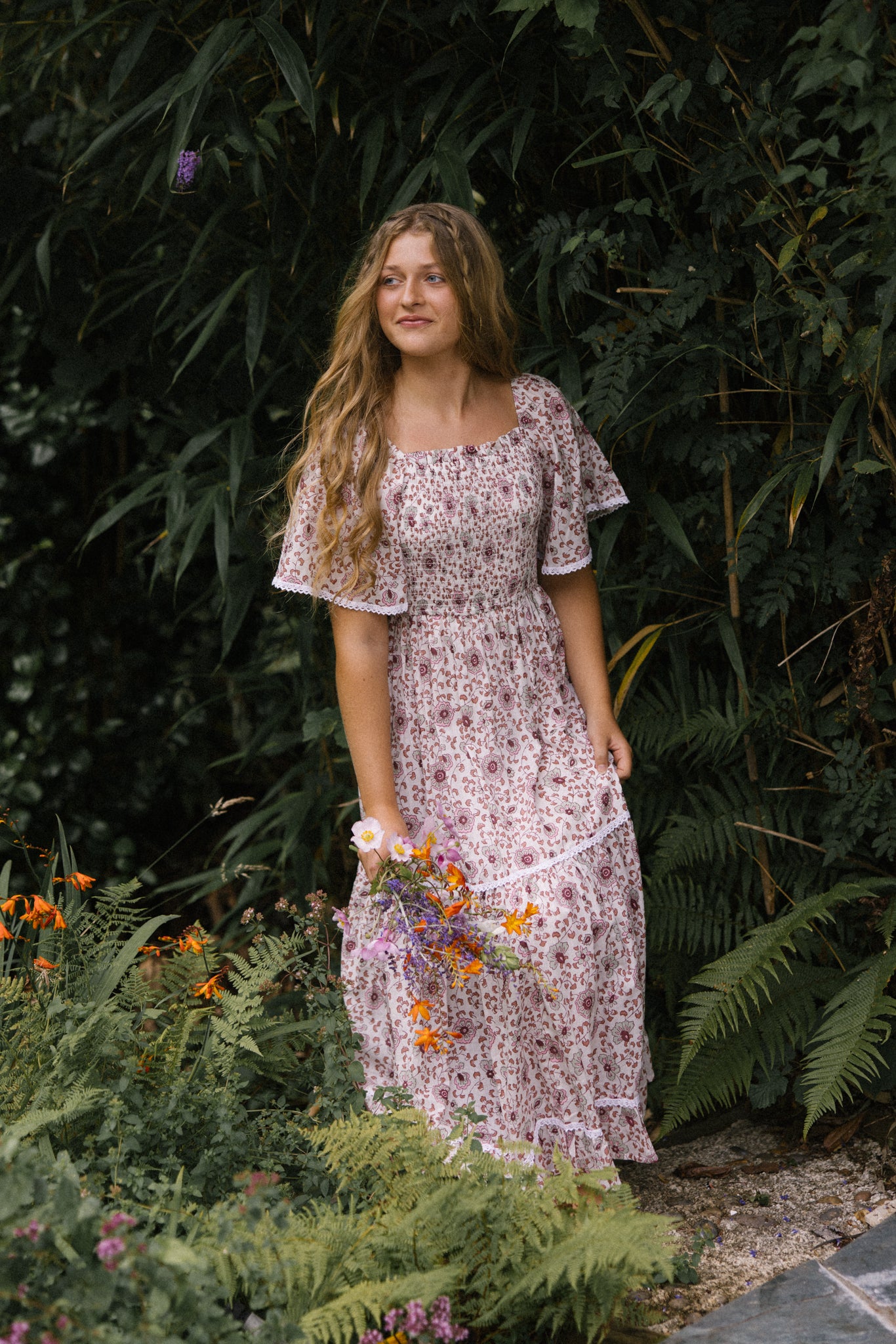 It has a hand shirring bodice, petite frill neckline with bell 3/4 length sleeves giving it a nod to the 70s era.