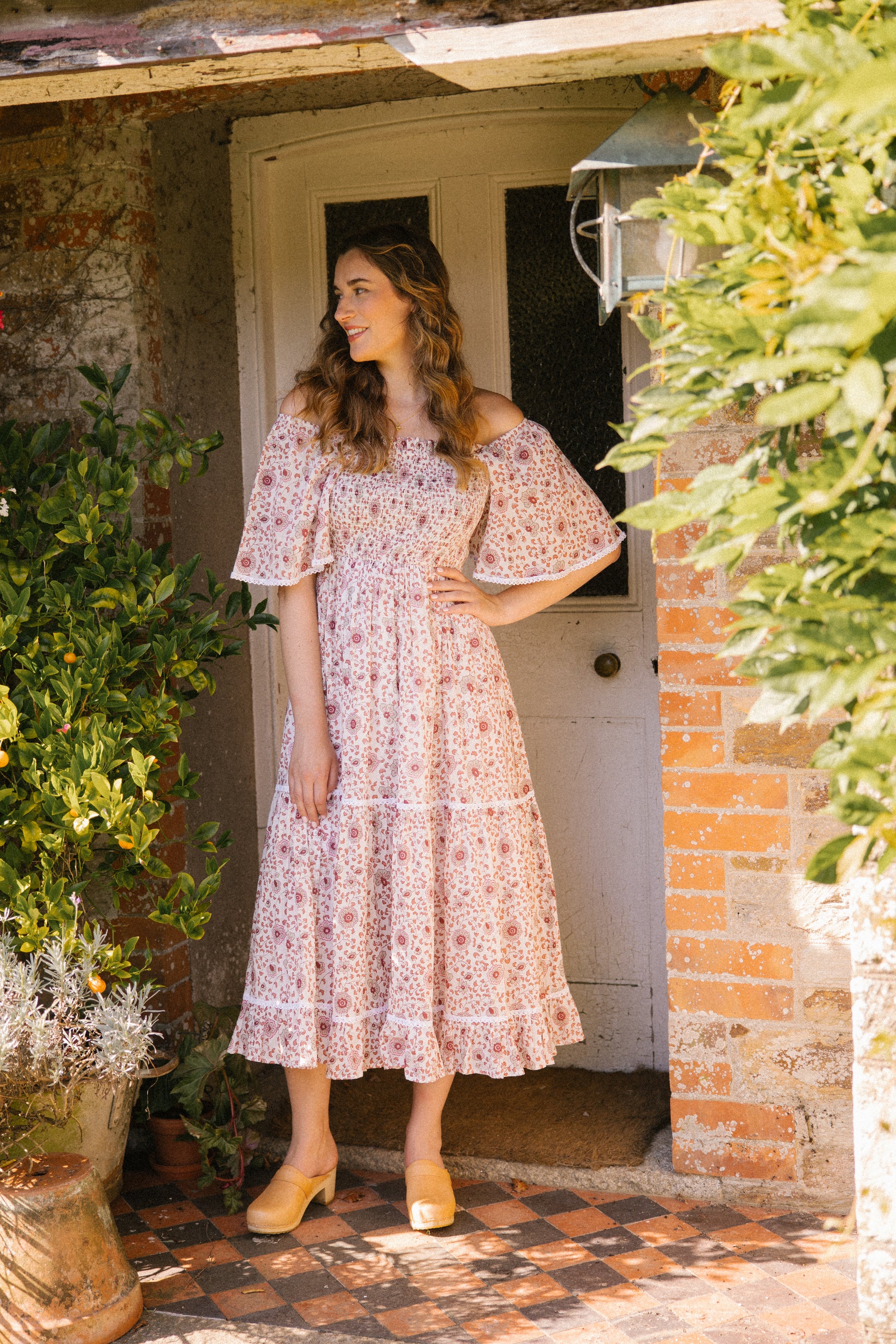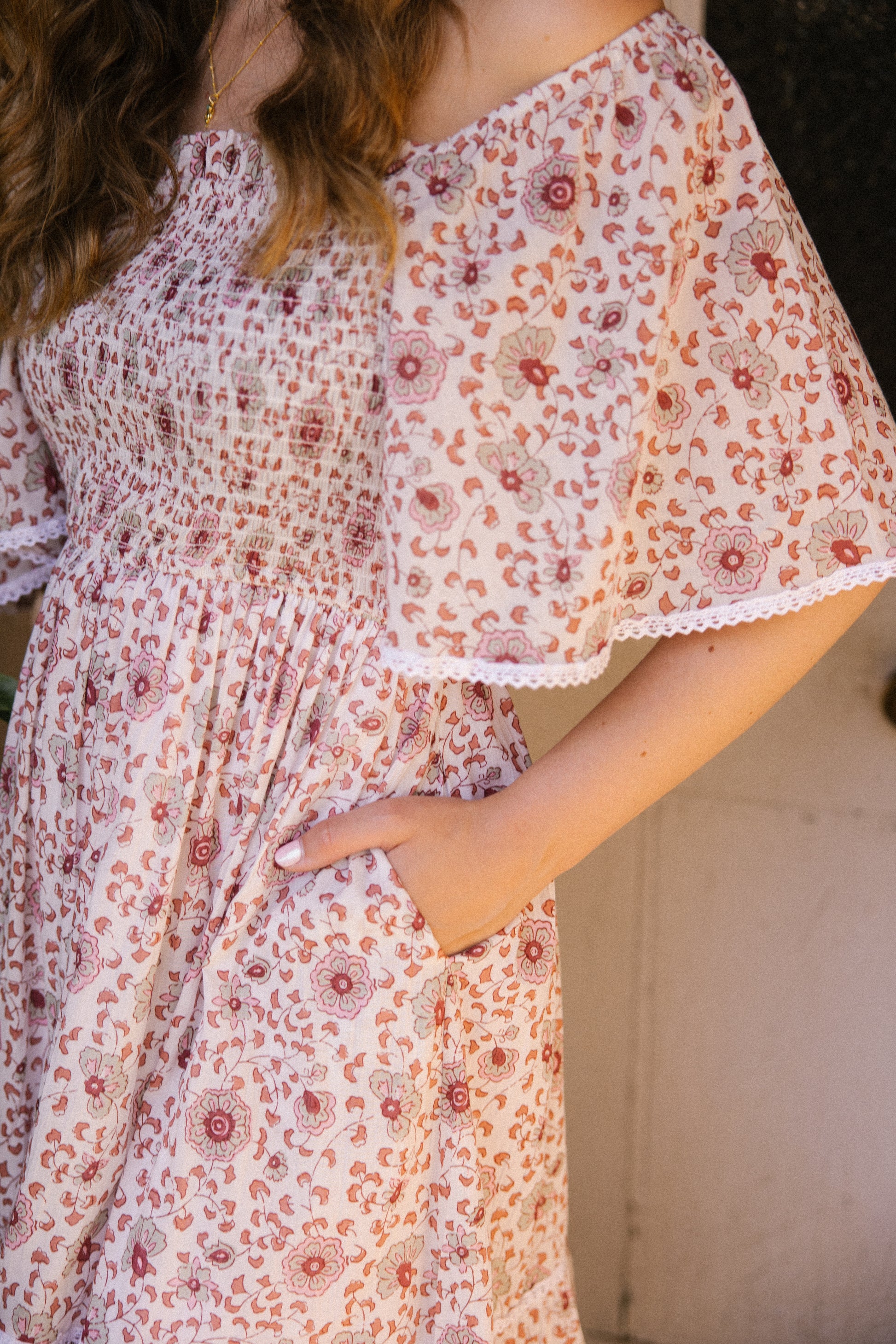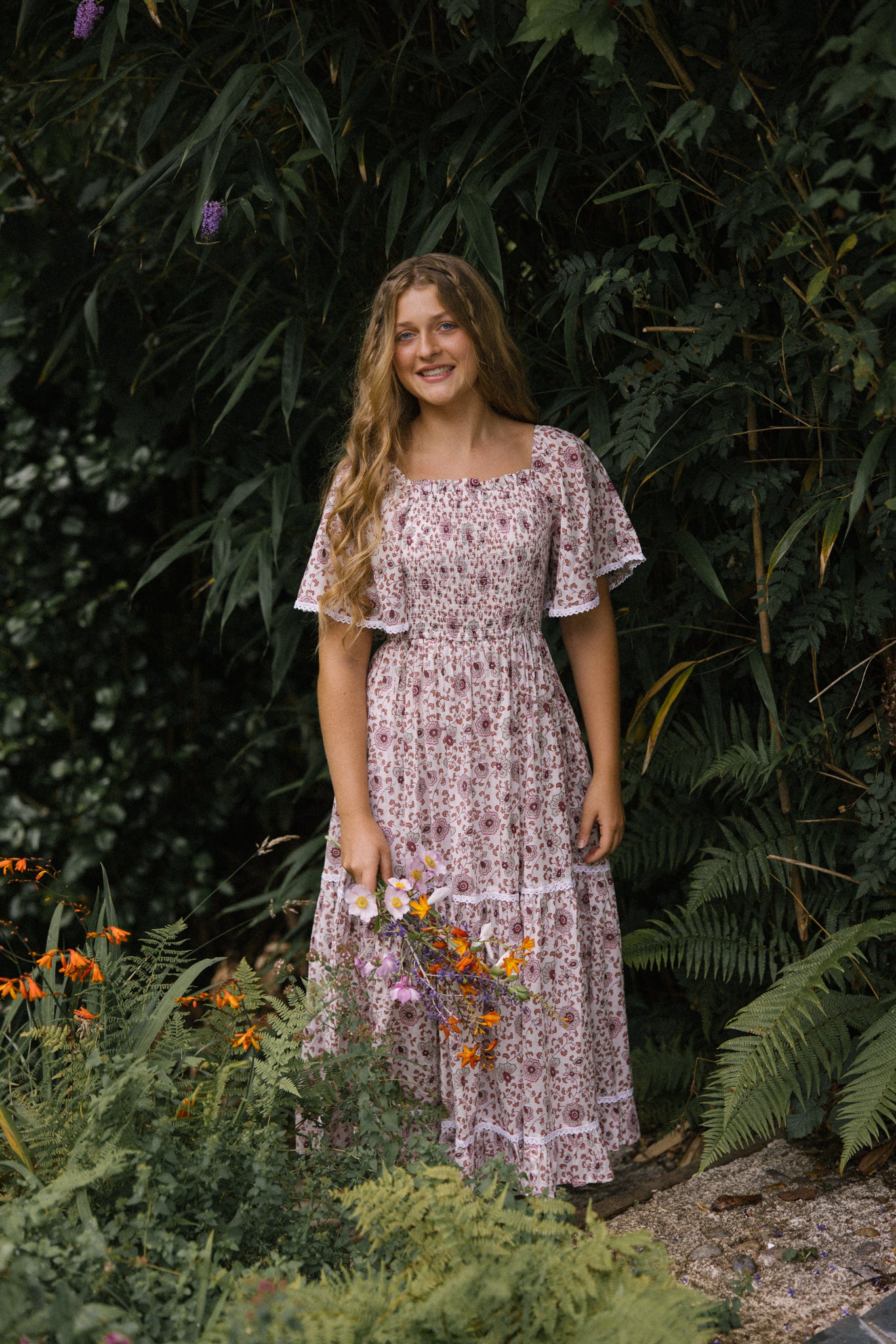 It has a hand shirring bodice, petite frill neckline with bell 3/4 length sleeves giving it a nod to the 70s era.