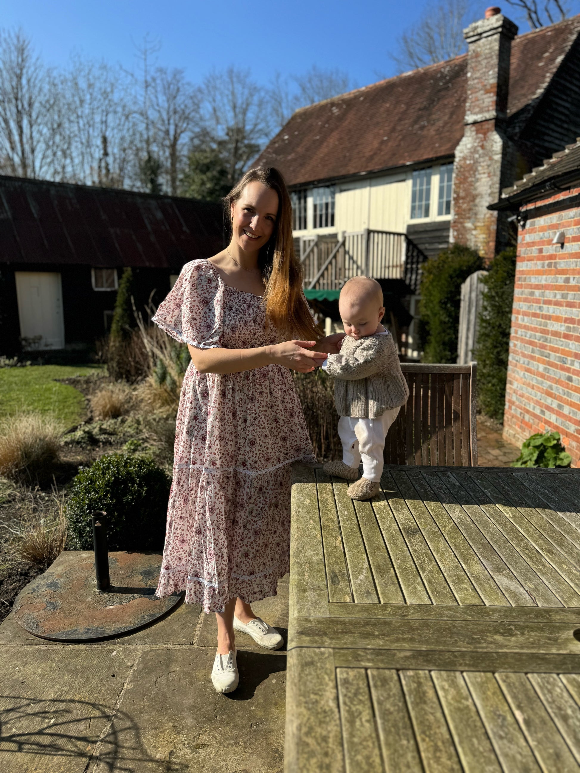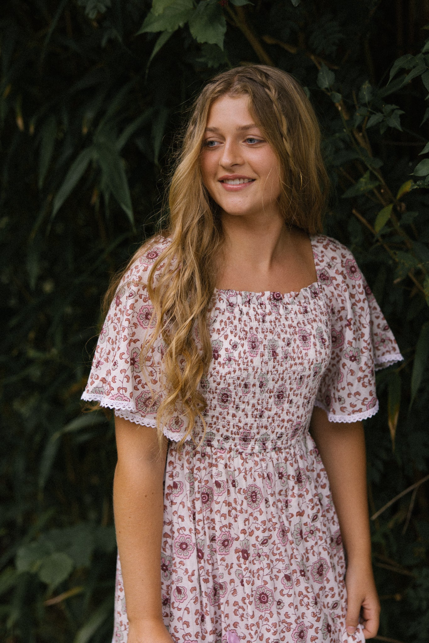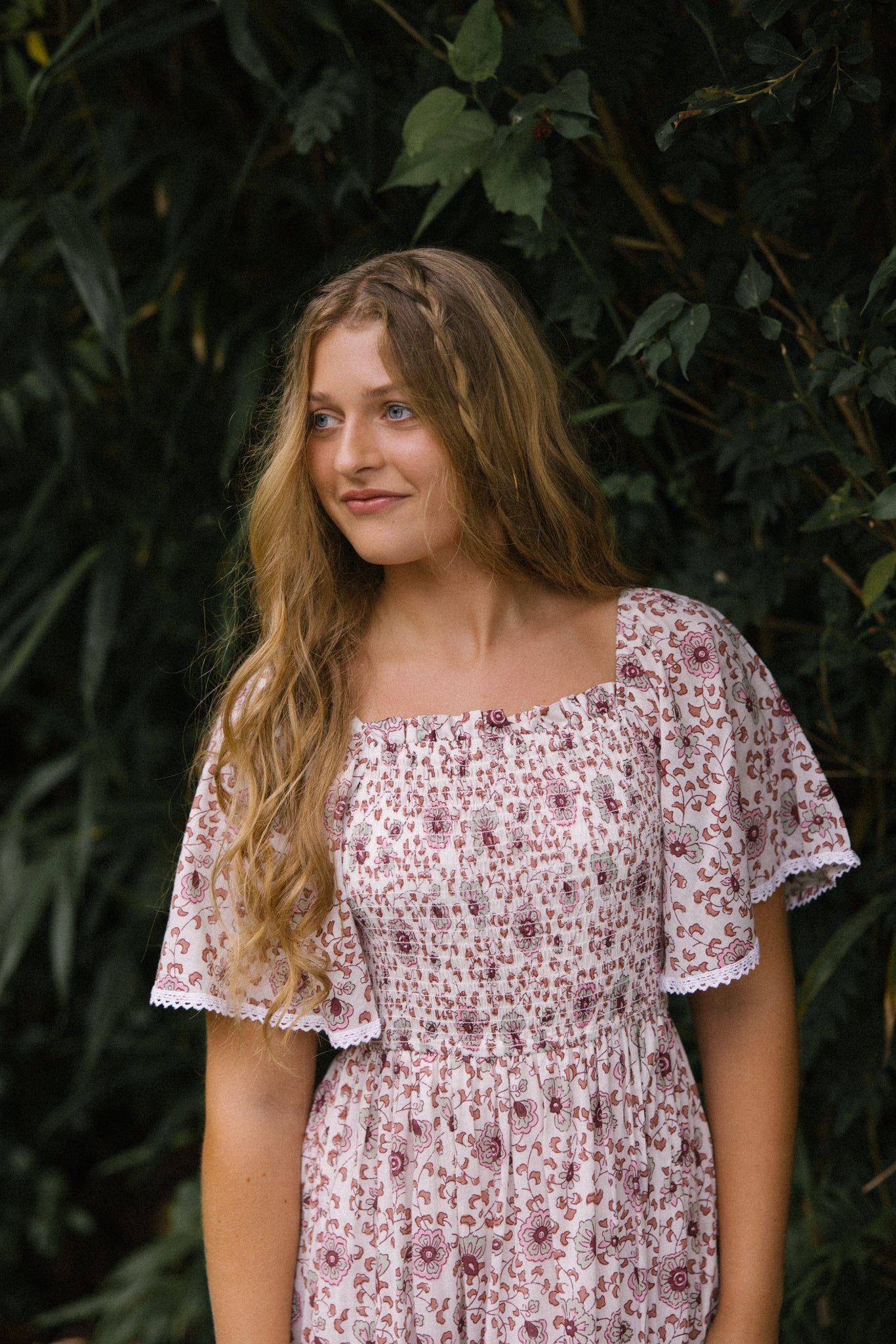 It is hand screen printed in our own exclusive Mona print, which has soft earth tones, making her a easy colour to wear for most skin tones.