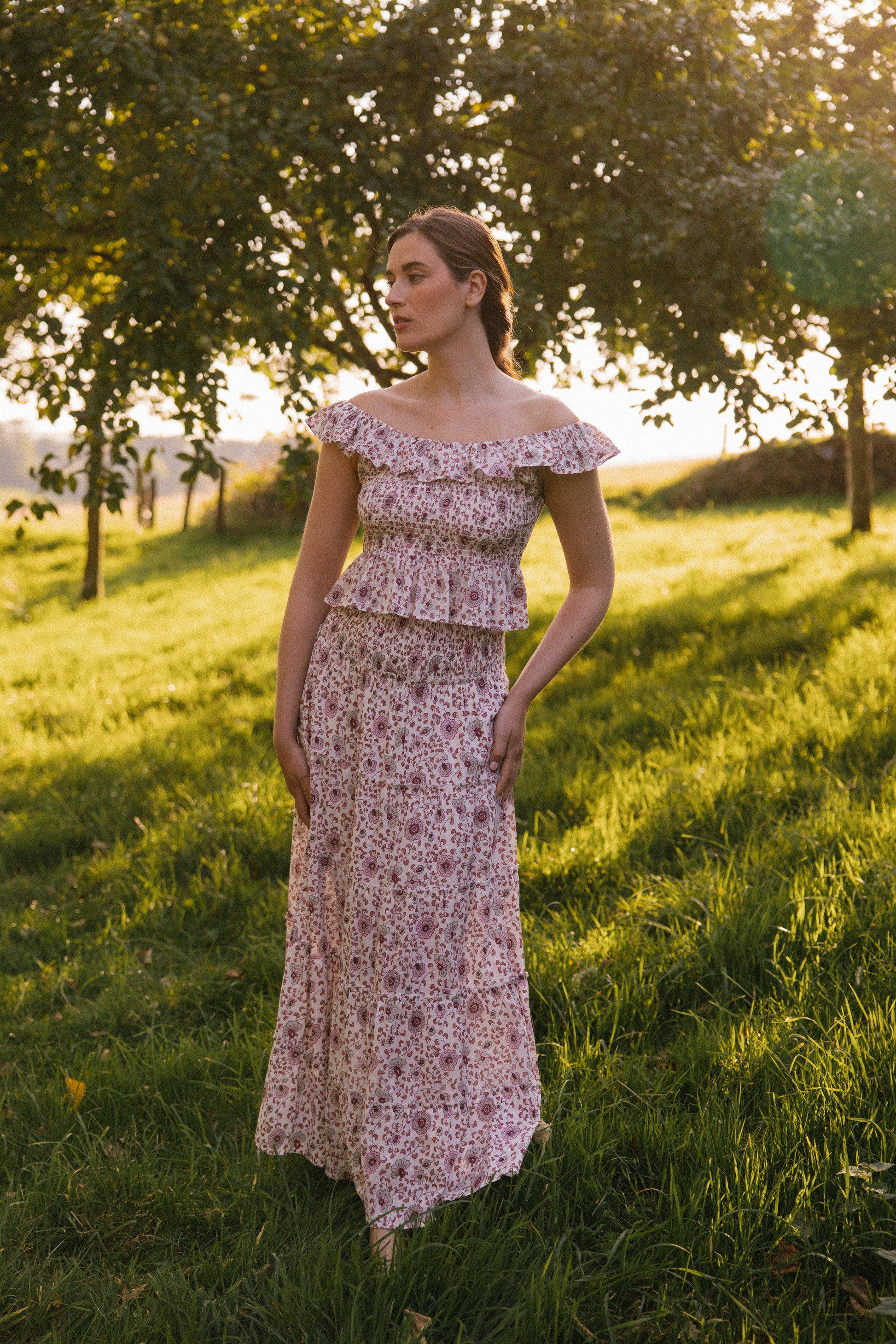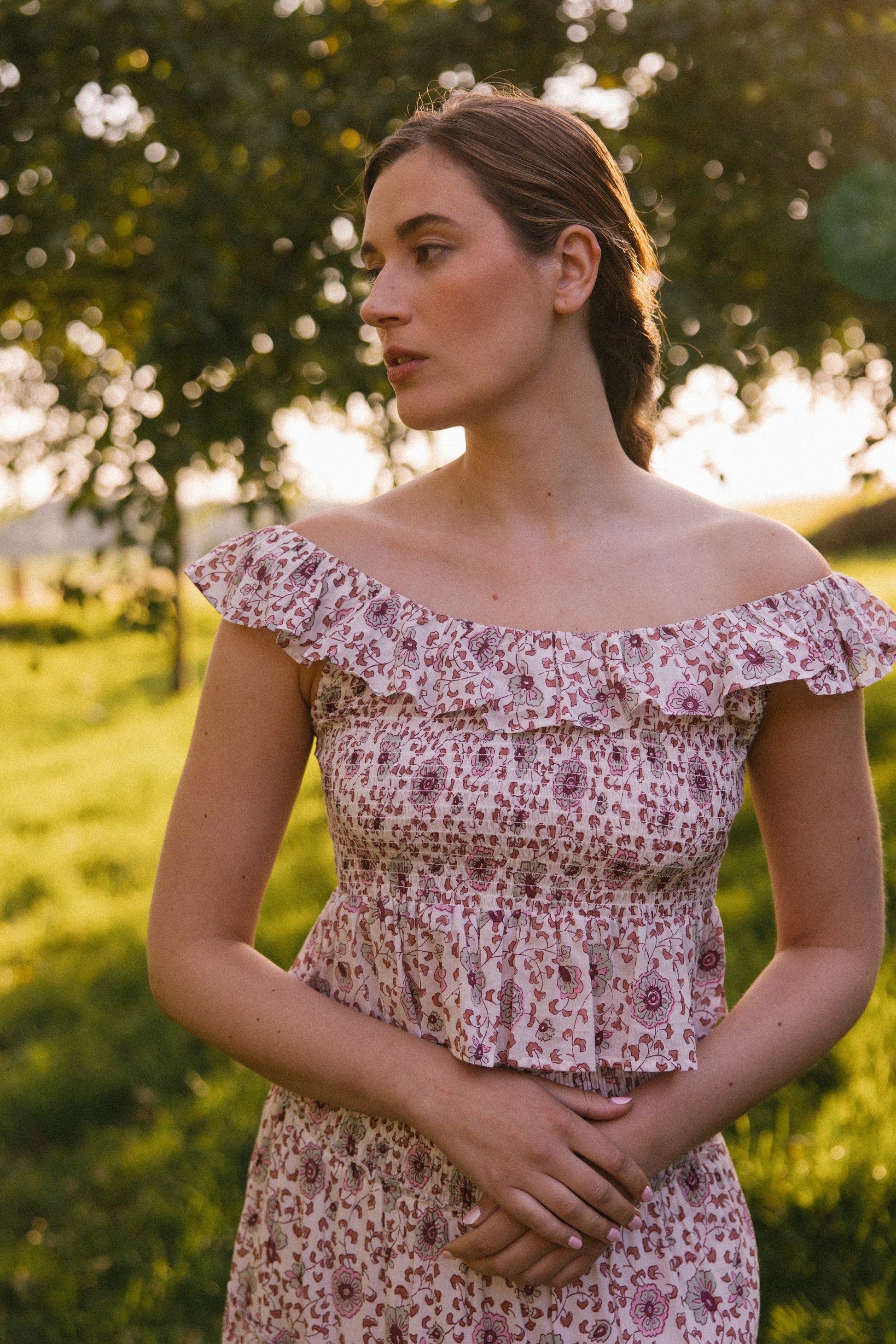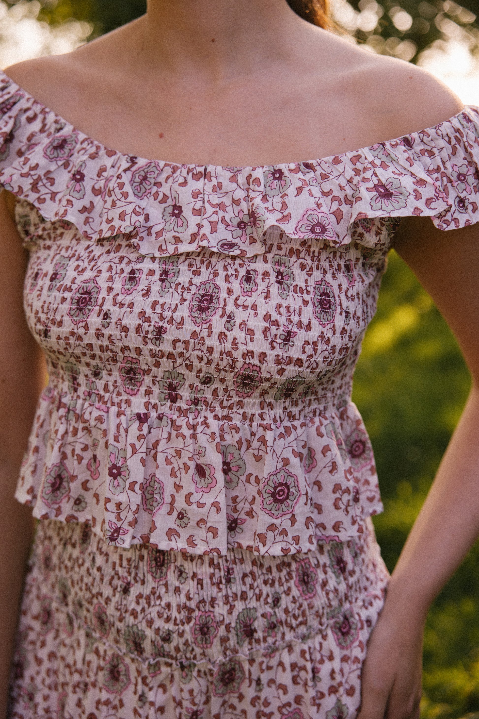 Mona is hand screen printed in our own exclusive floral print in soft earth tones.