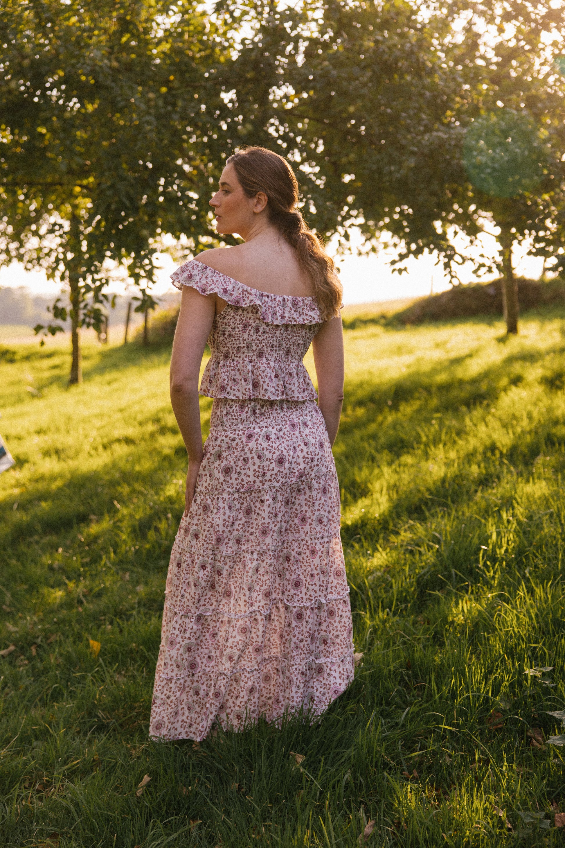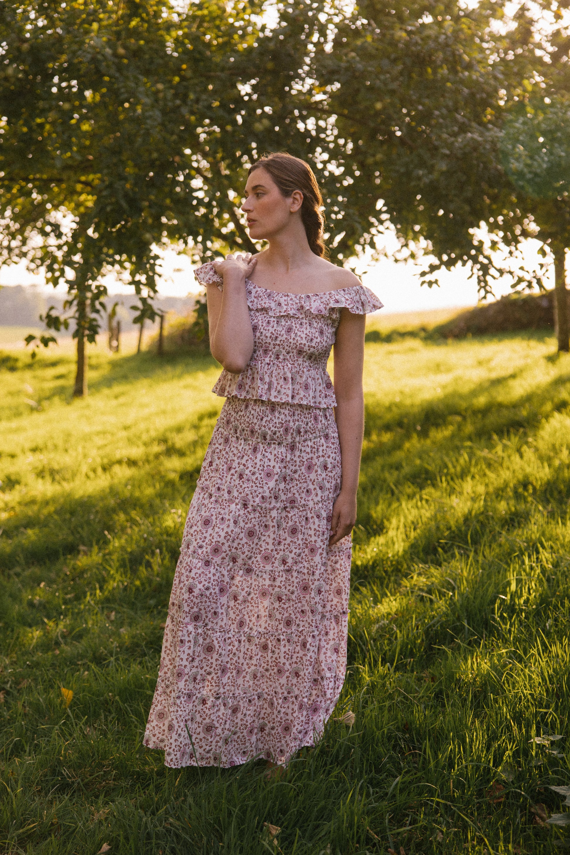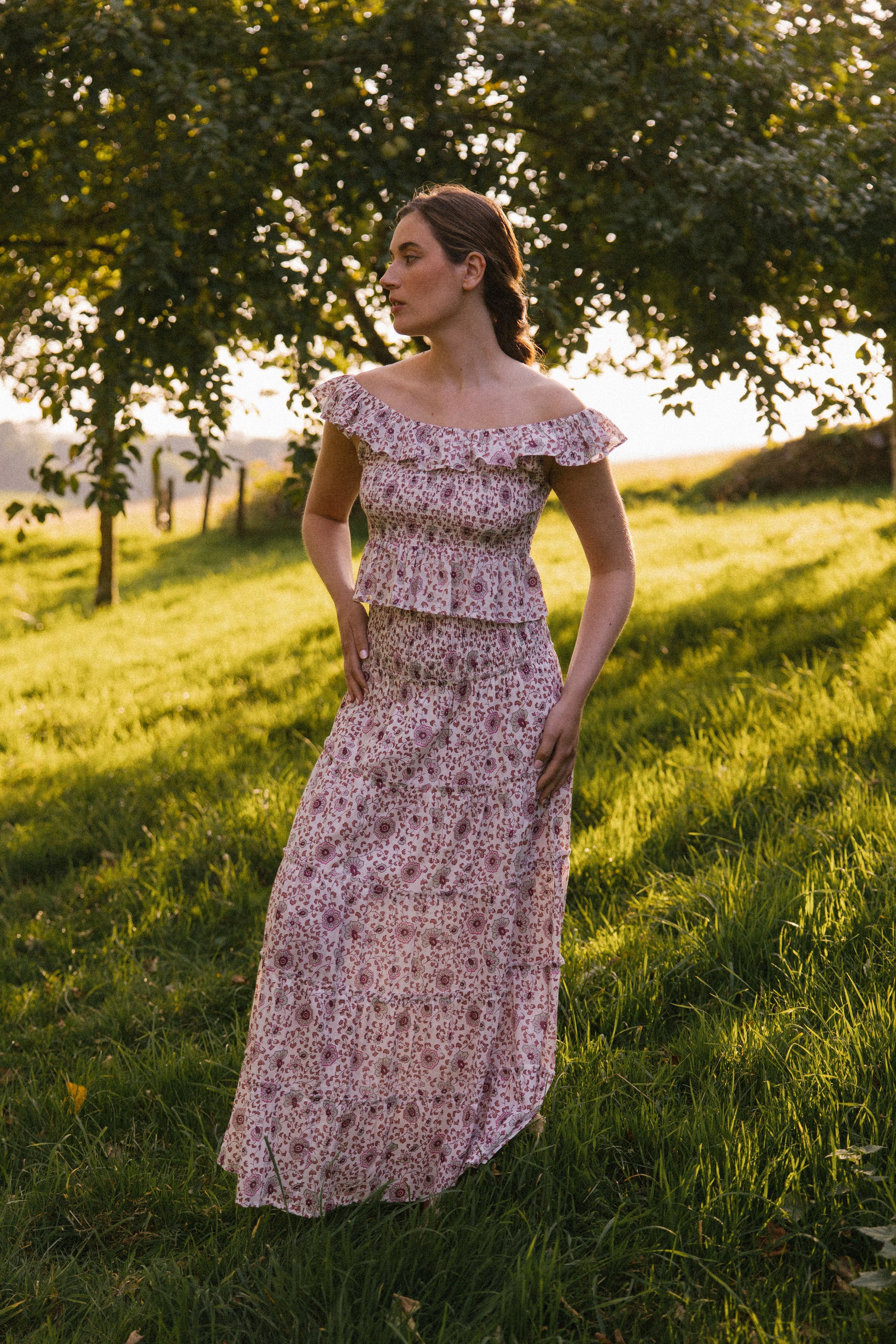 Hope is 5,10" is wearing a size small and styled with our Mona tiered skirt .