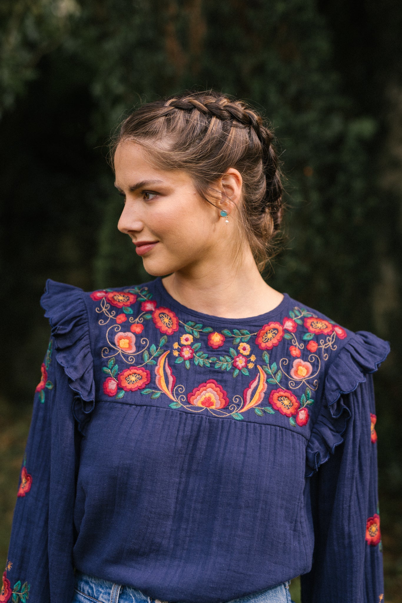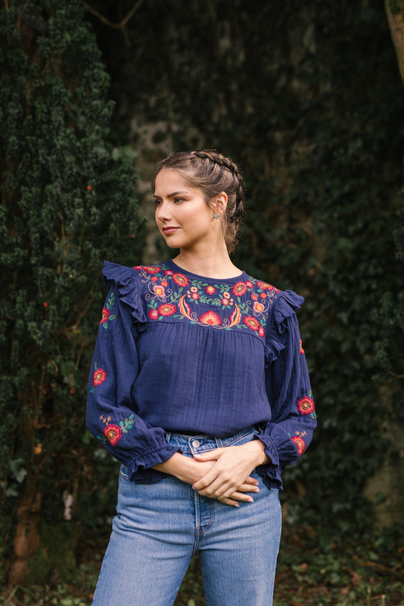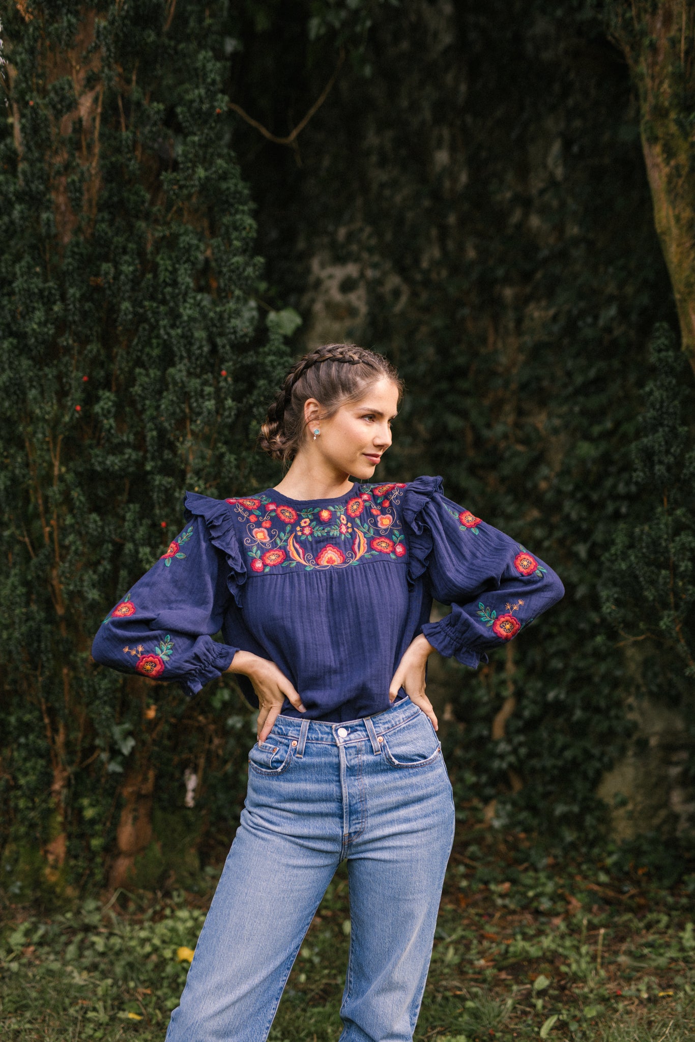 Folkloric inspired, Nadia will surely be the blouse of the season. Precious yet completely adaptable to every day pursuits, she will blend with ease into your wardrobe. Nadia is a great stand alone piece that works well with many separates, she will also look great under knitted vests, she will be wildly useful and add charm to any outfit.