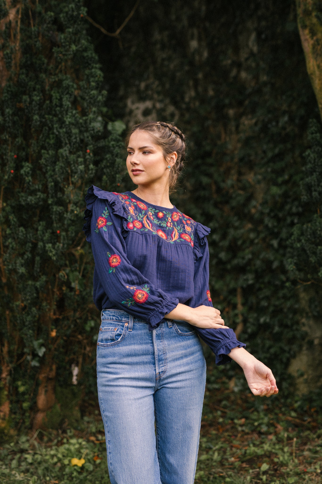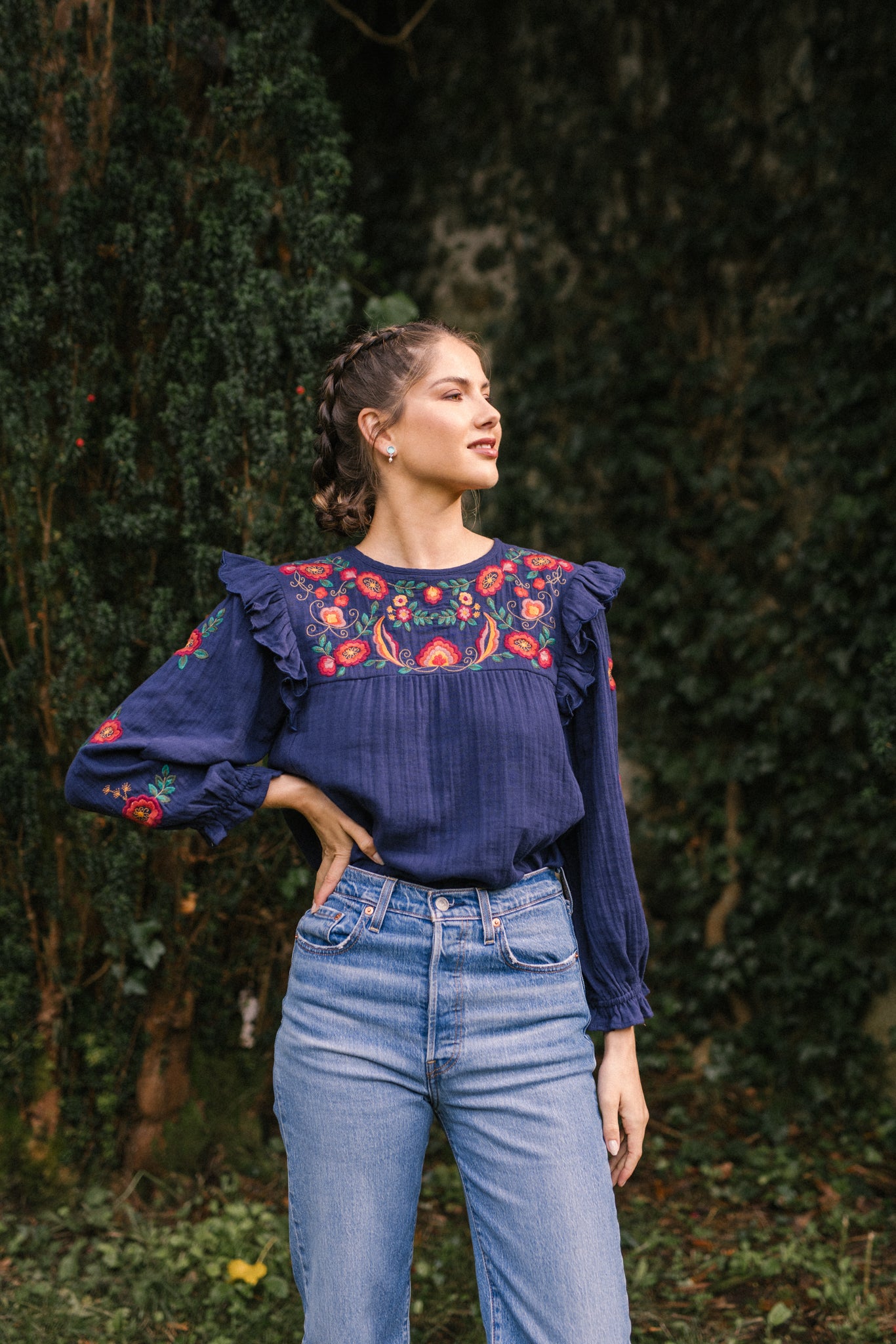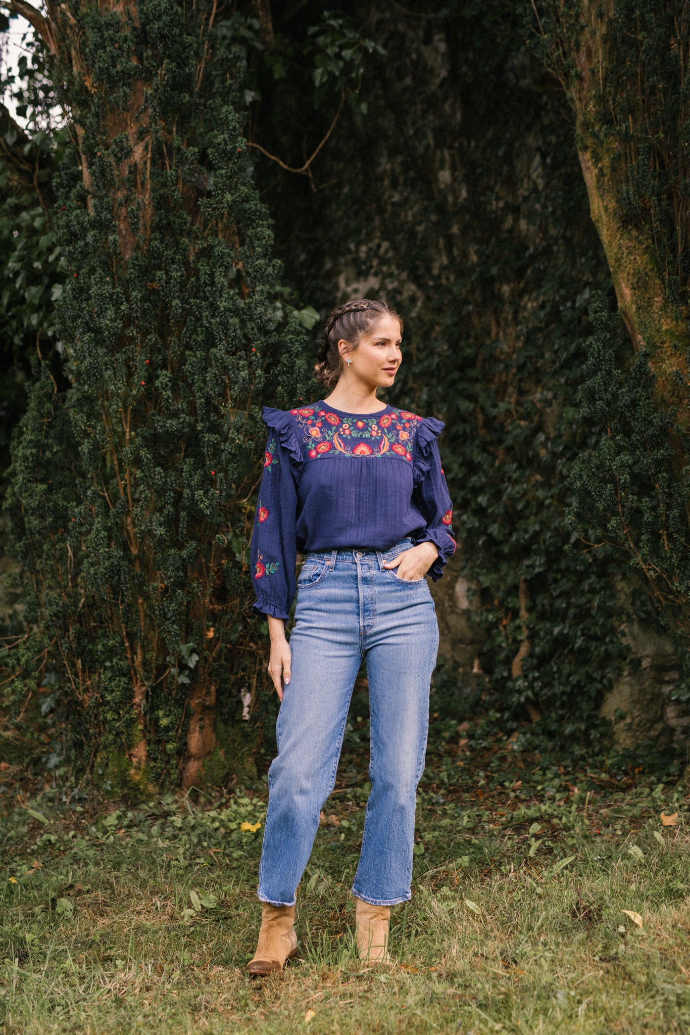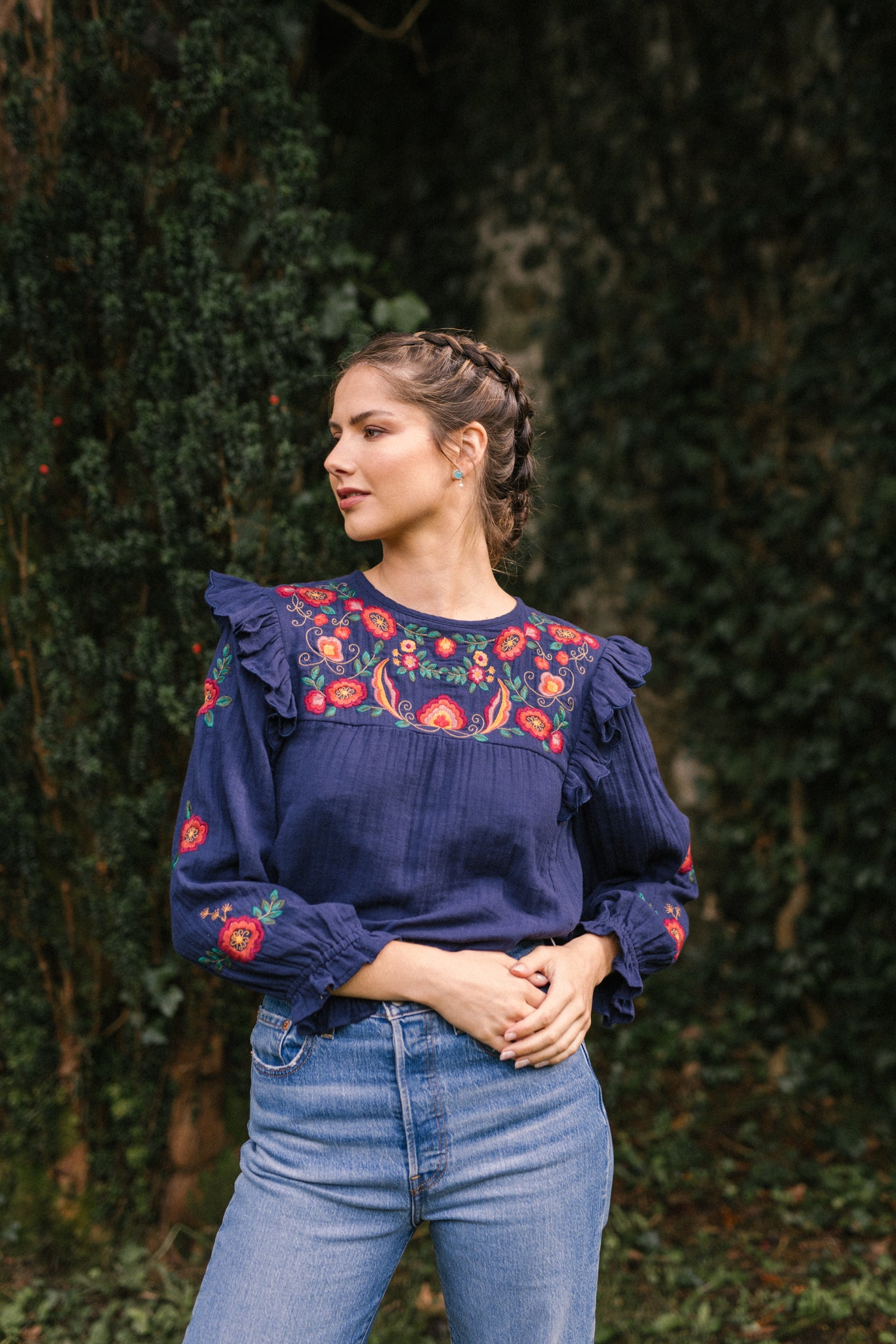 Folkloric inspired, Nadia will surely be the blouse of the season. Precious yet completely adaptable to every day pursuits, she will blend with ease into your wardrobe. Nadia is a great stand alone piece that works well with many separates, she will also look great under knitted vests, she will be wildly useful and add charm to any outfit.