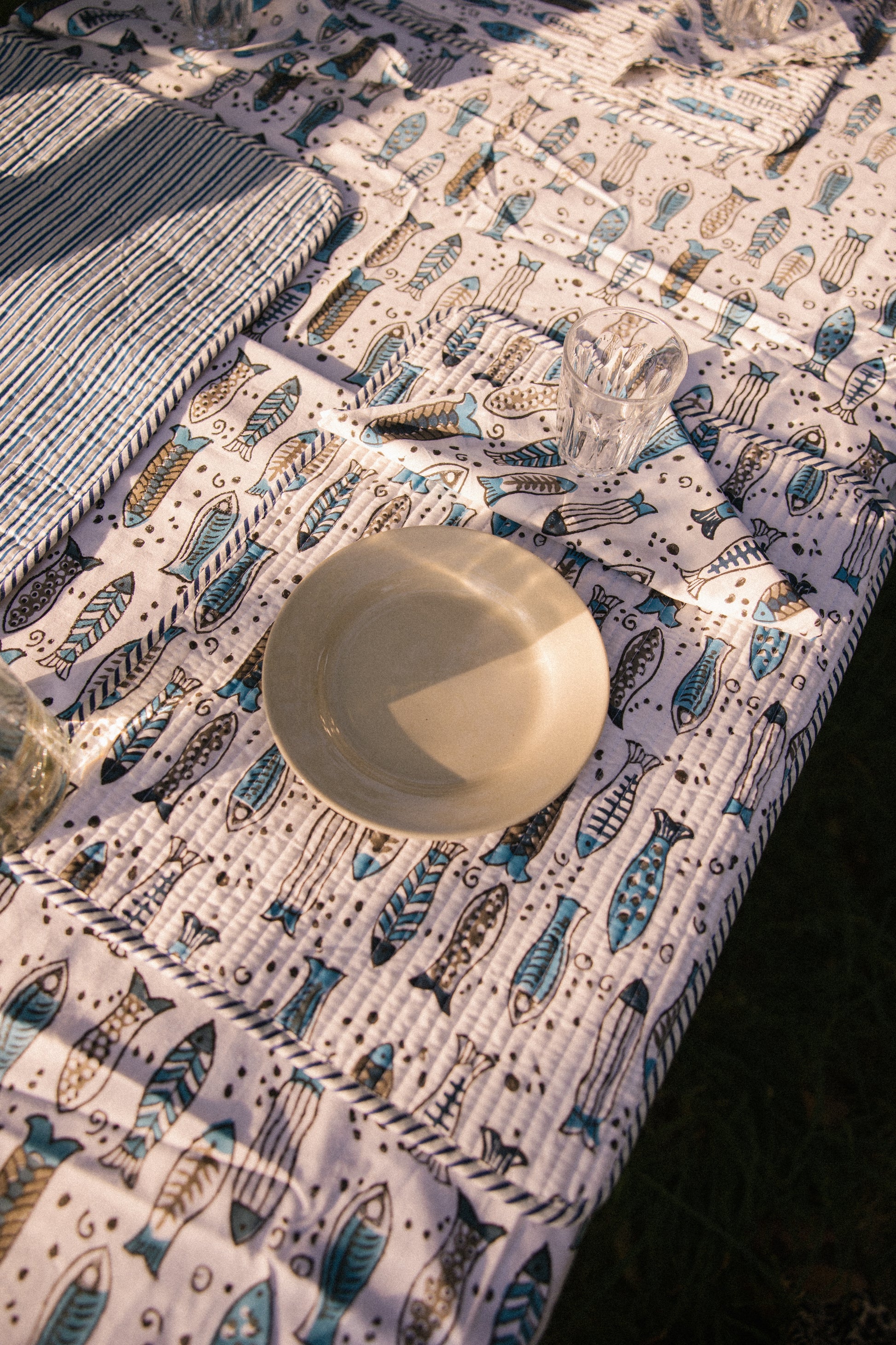 This pair of quilted placemats help to protect table surfaces and creates individual table settings. Crafted from soft quilted cotton and featuring a delightful flowing fish design in blue tones with a stripe lining. These placemats are perfect for every day settings and help to make meal time extra special.