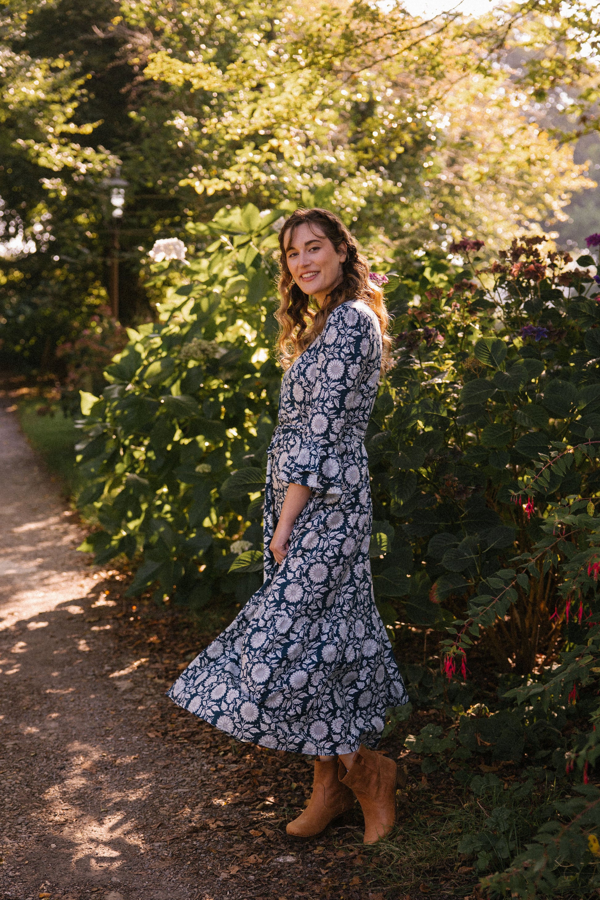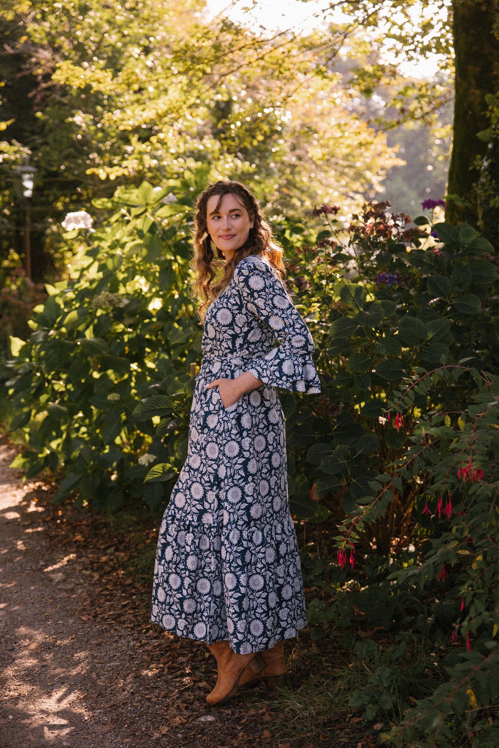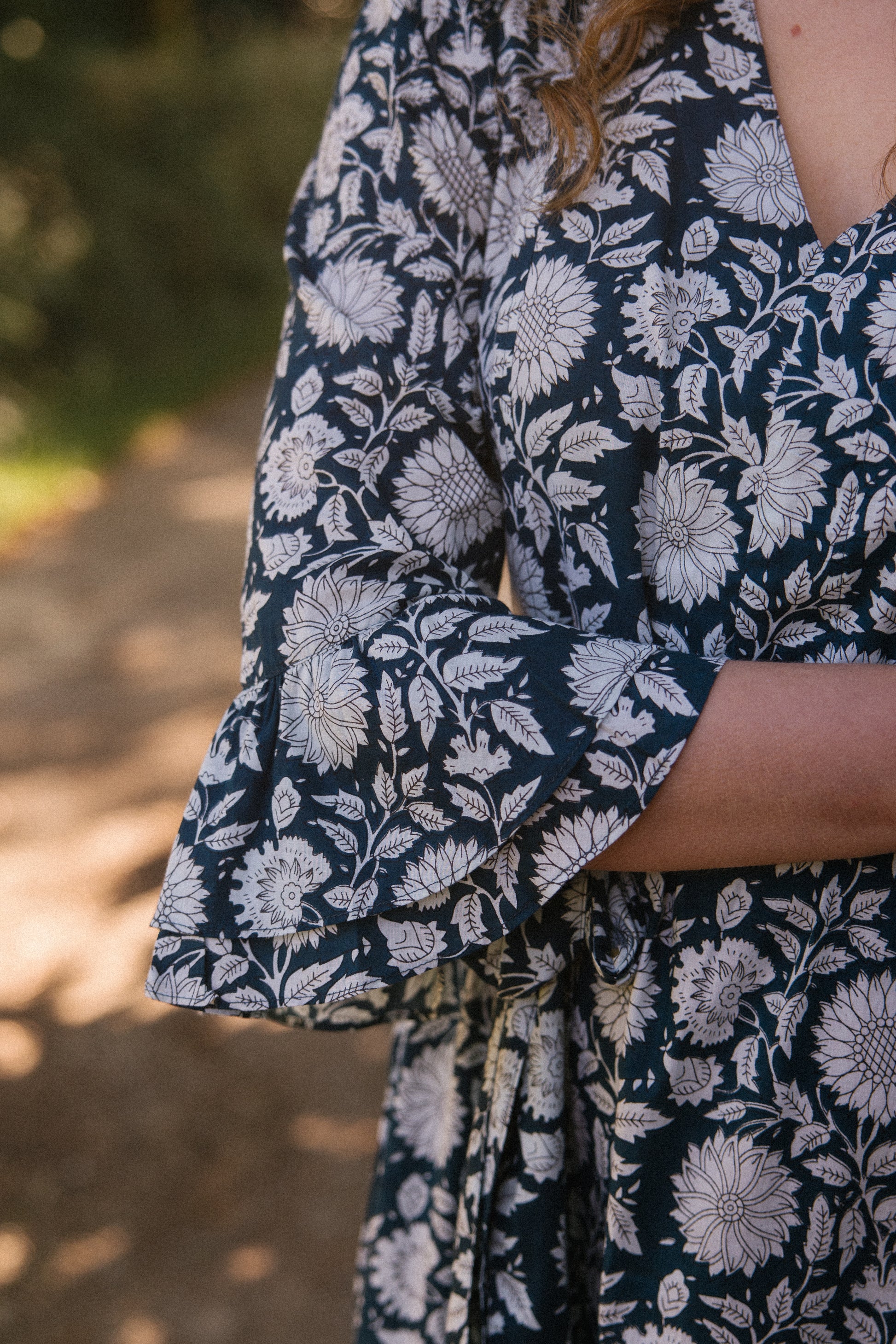 Frida V-neck maxi dress in midnight navy with a hand screen printed floral design is a beautiful full length prairie style dress with a fitted bodice and a soft fit and flare skirt, with 3/4 length puff sleeves and a double layered frill to add a touch of elegance.