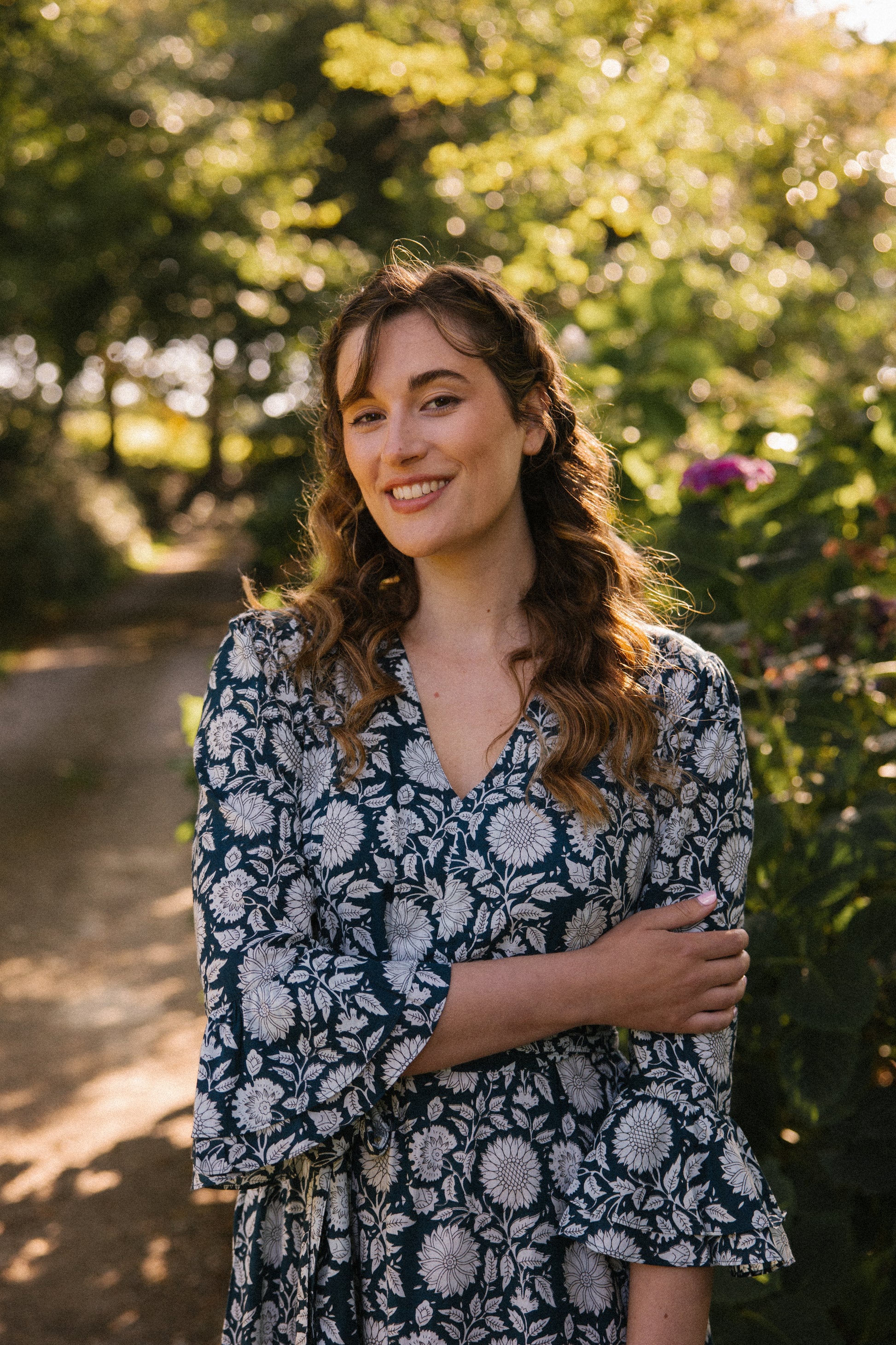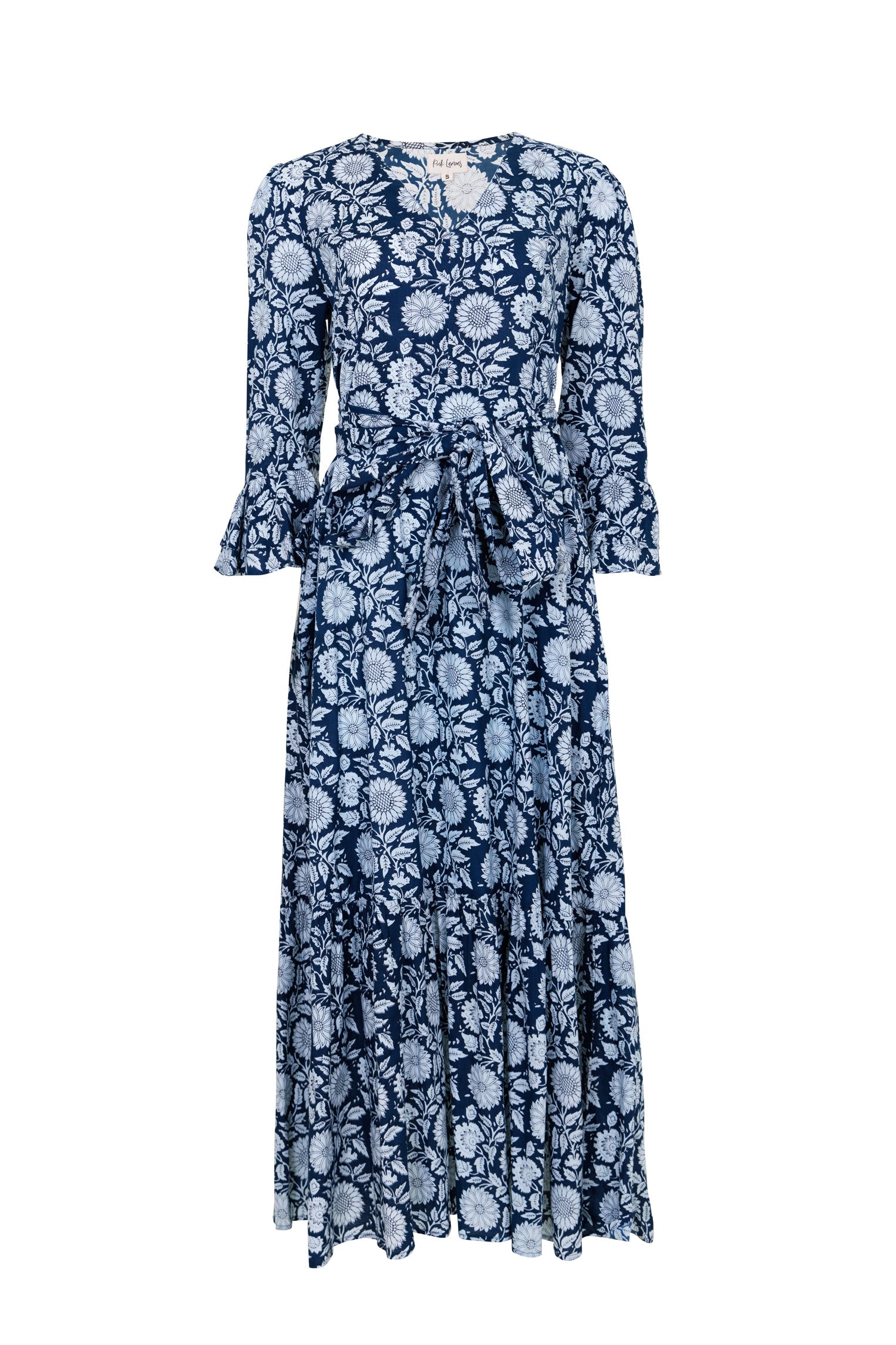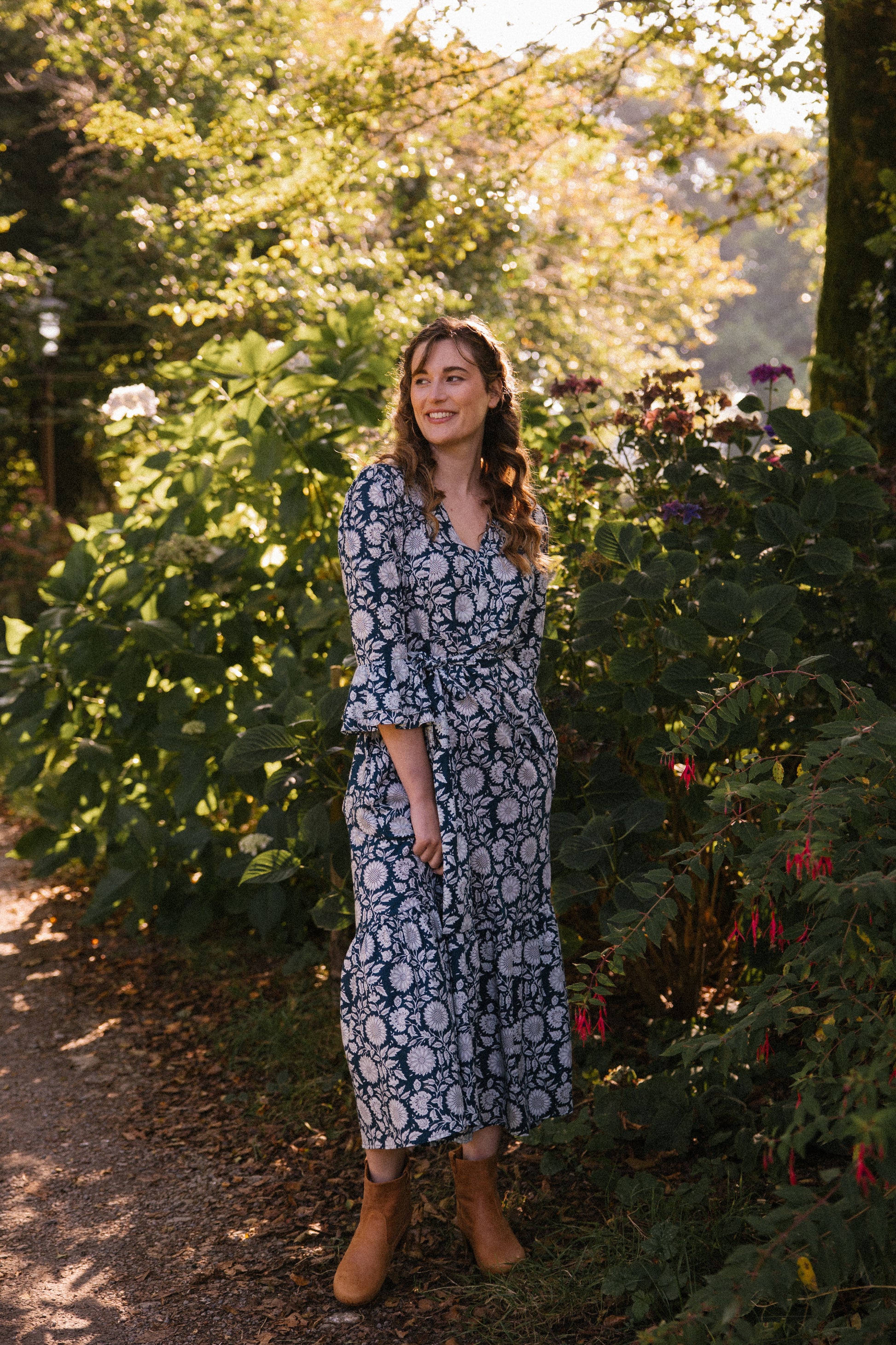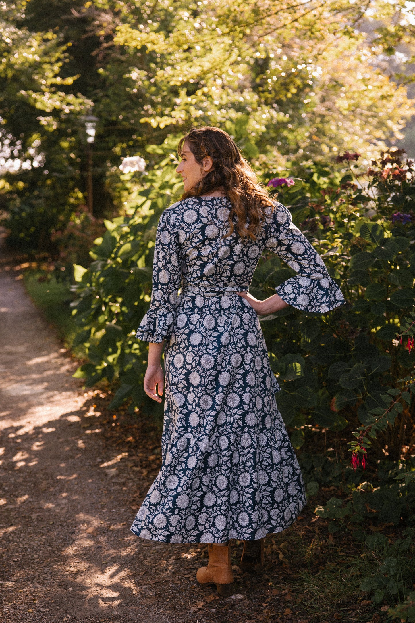Frida V-neck maxi dress in midnight navy with a hand screen printed floral design is a beautiful full length prairie style dress with a fitted bodice and a soft fit and flare skirt, with 3/4 length puff sleeves and a double layered frill to add a touch of elegance.