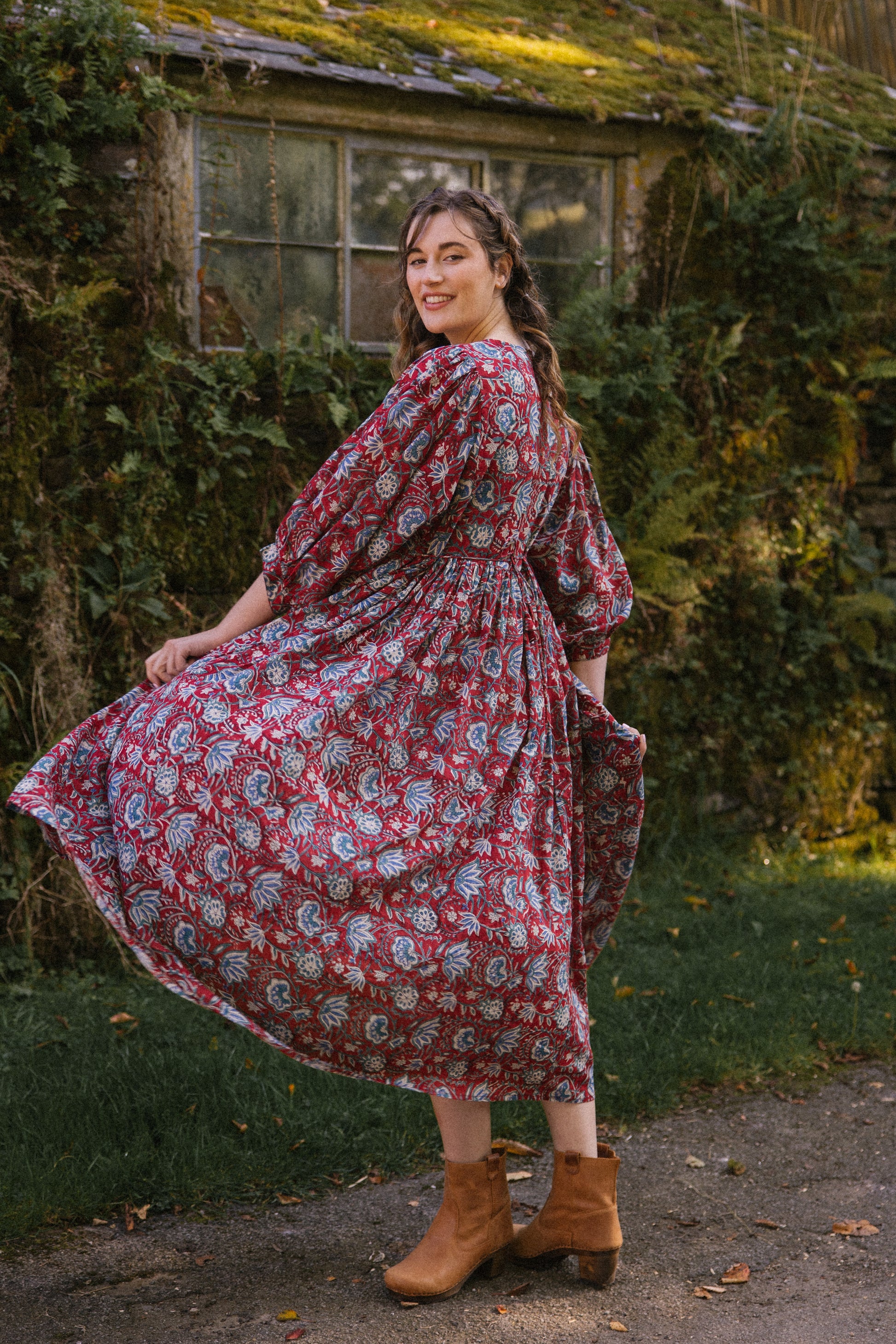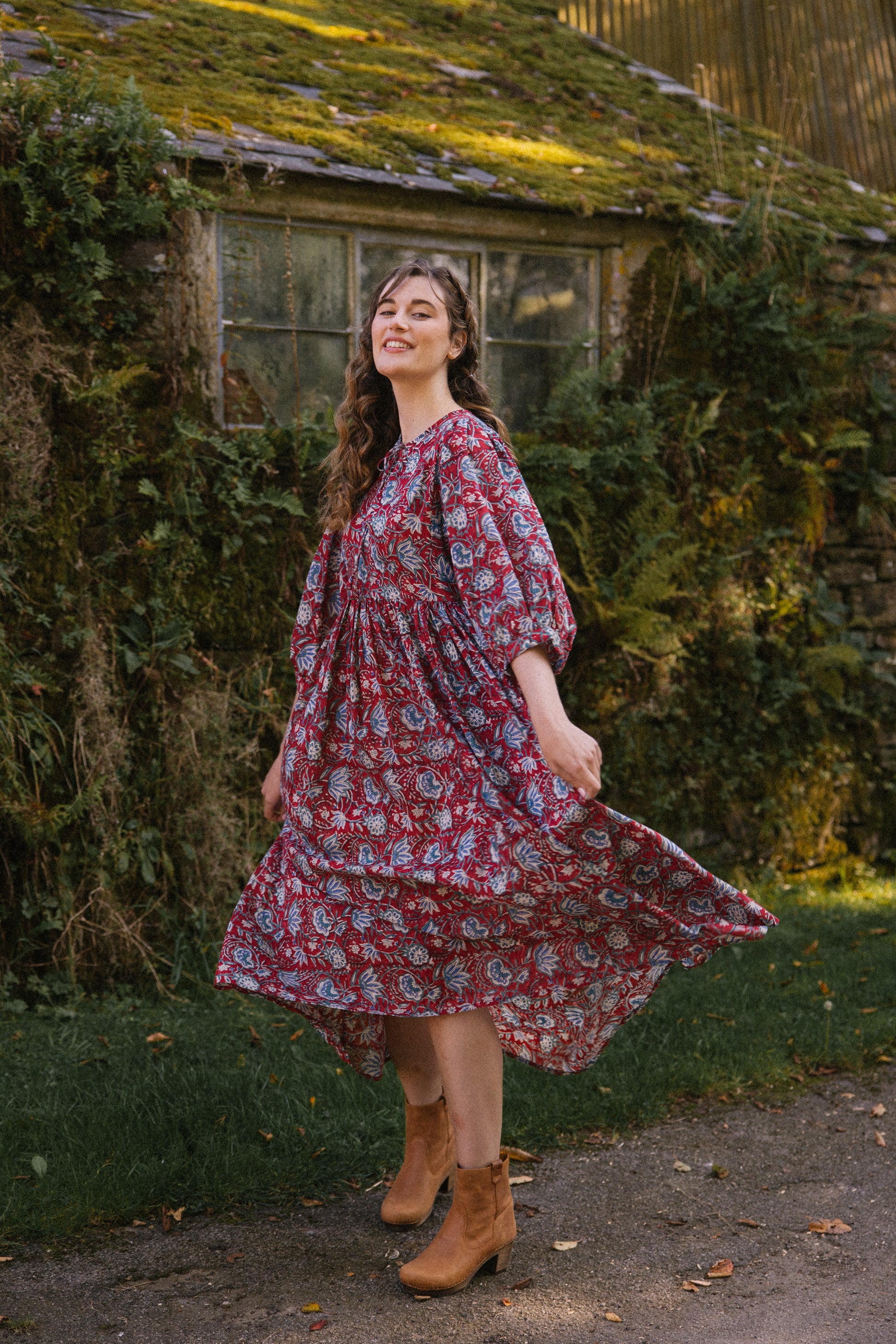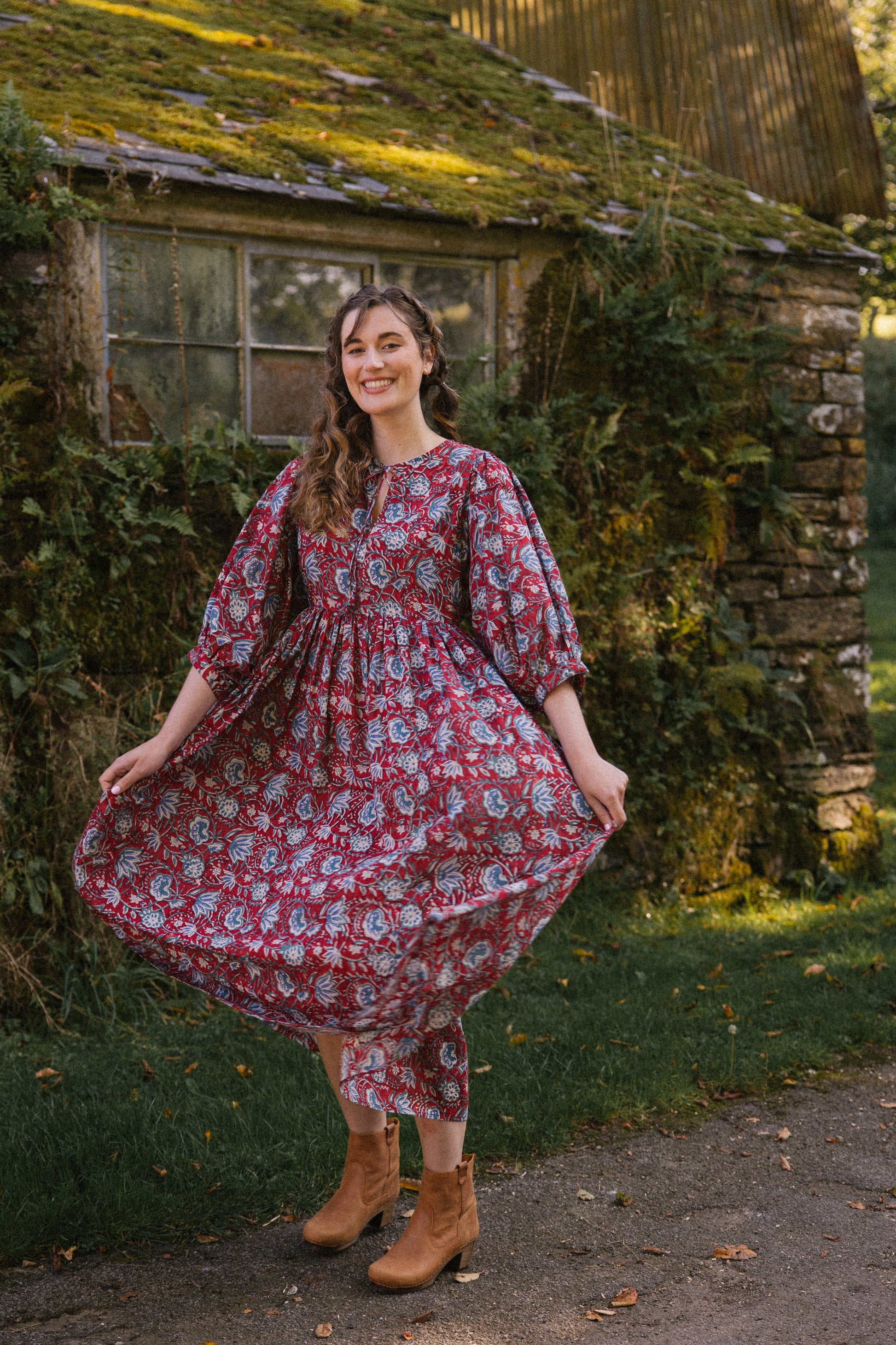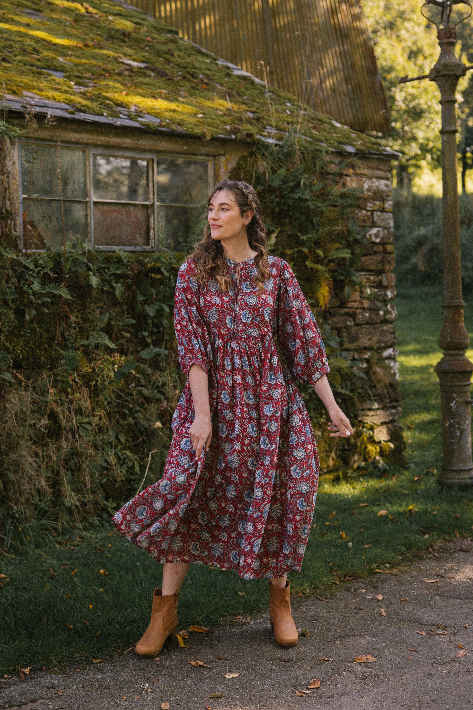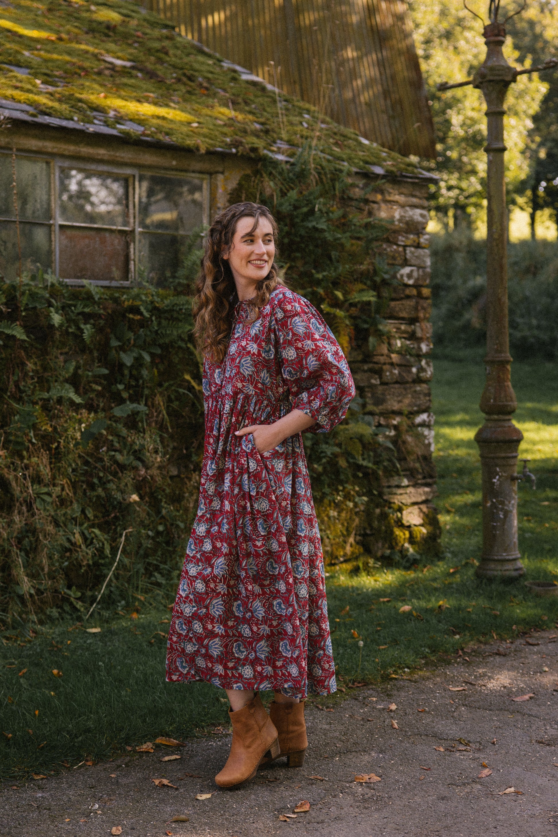 A delightful vintage inspired dress with romantic billowed sleeves. Once on, it will make you want to float throughout your day. Gaia dress is a midi length, with side pockets made in 100% organic cotton.
