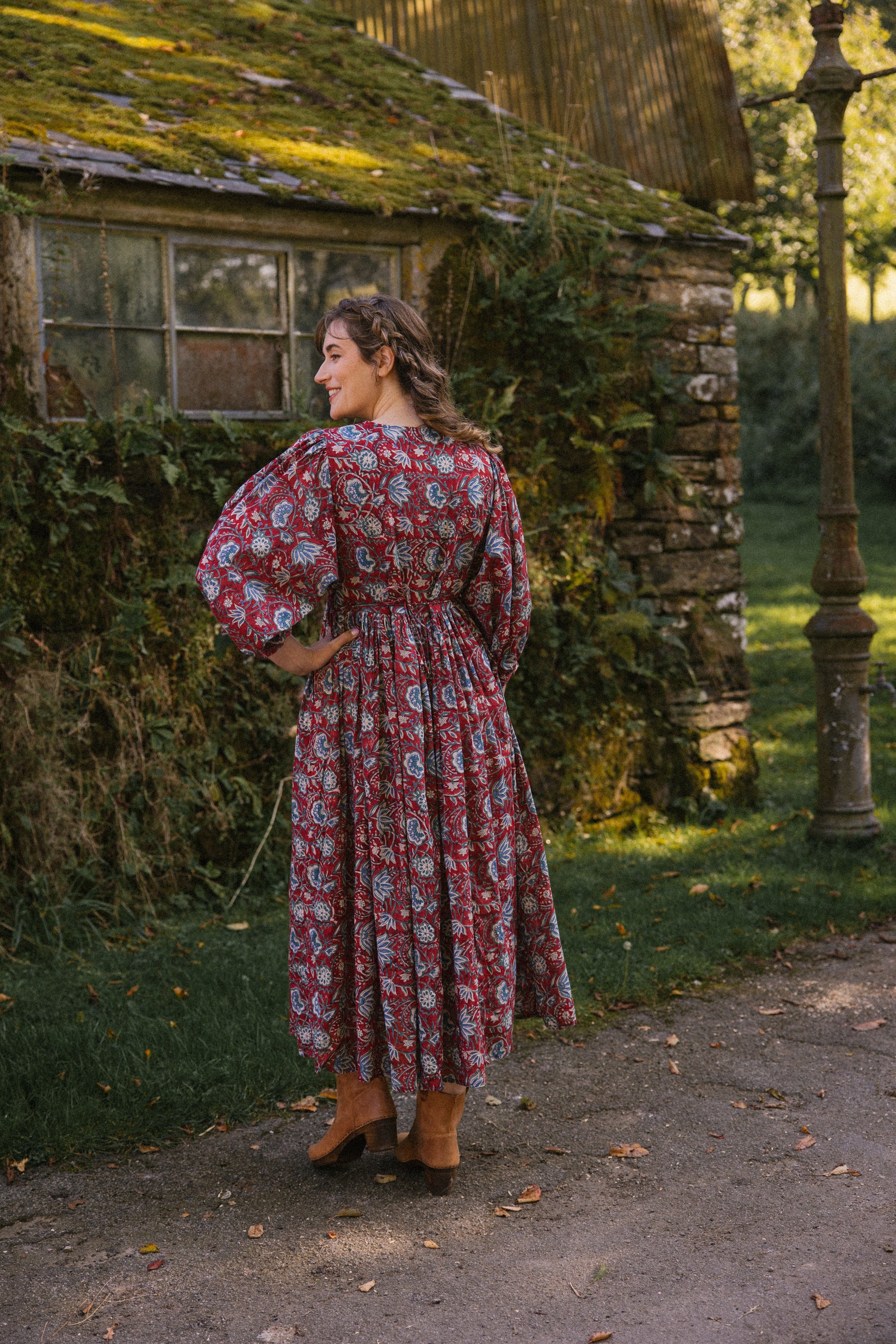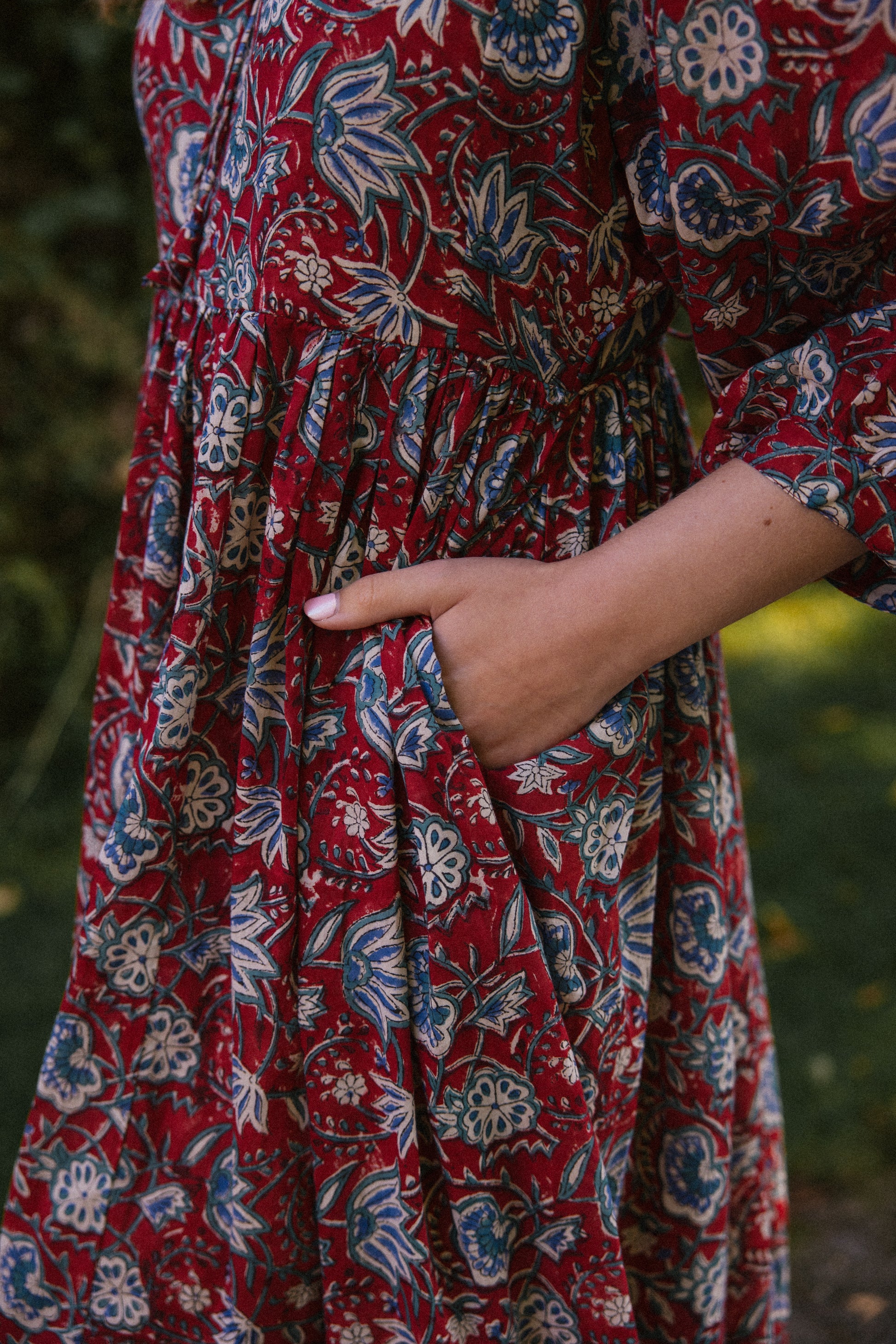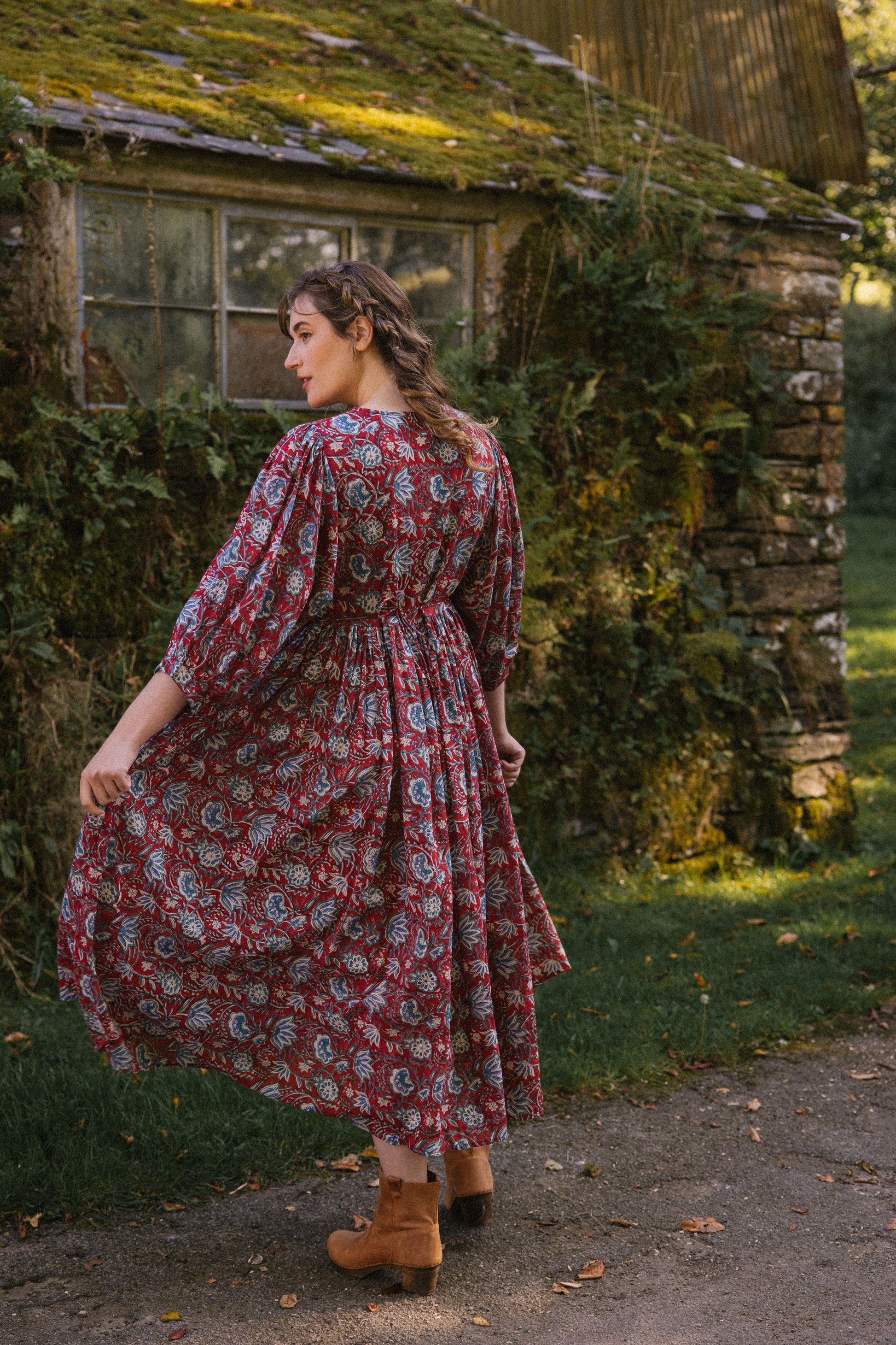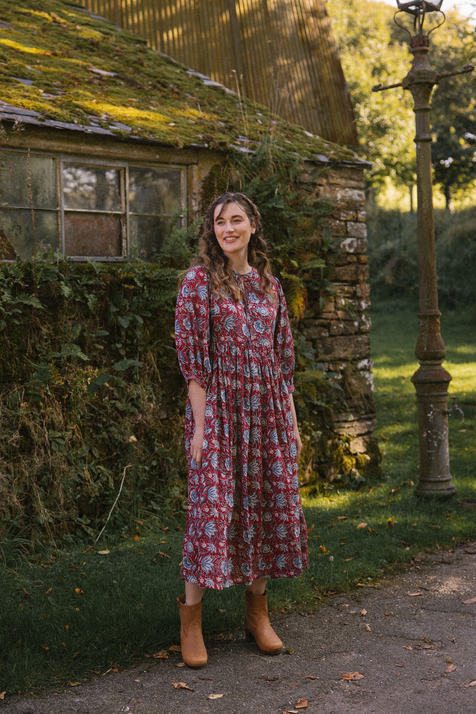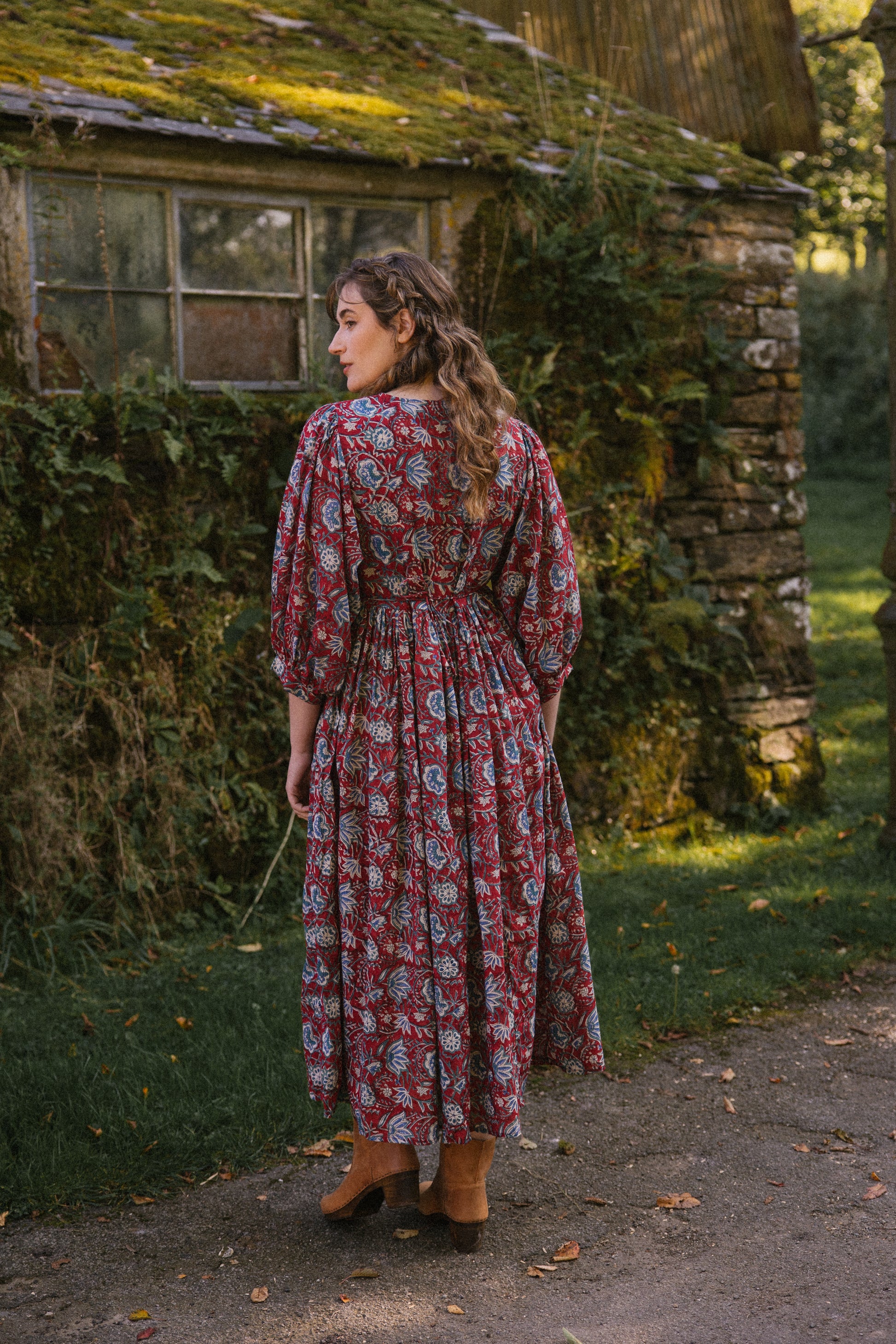 A delightful vintage inspired dress with romantic billowed sleeves. Once on, it will make you want to float throughout your day. Gaia dress is a midi length, with side pockets made in 100% organic cotton.