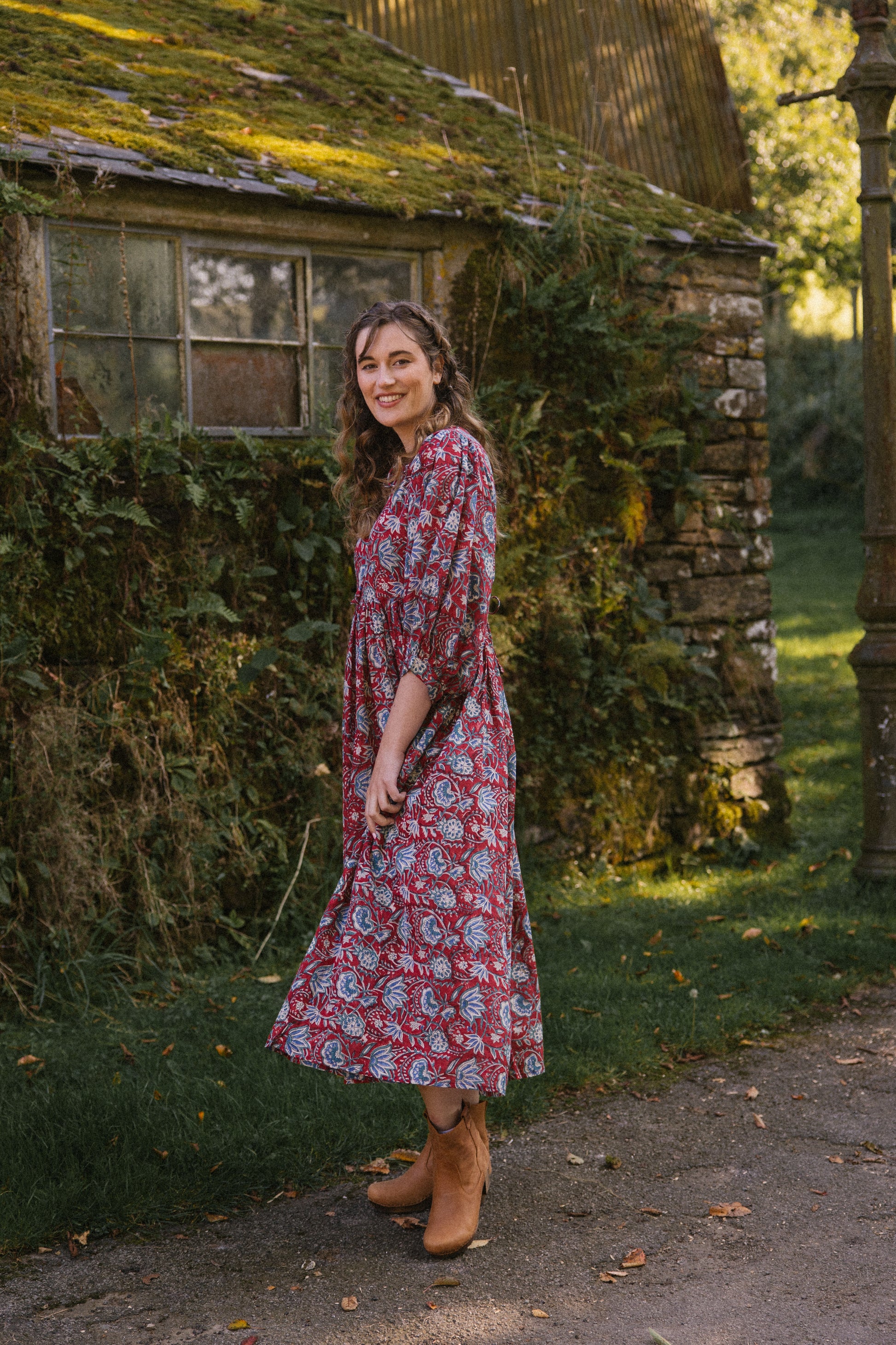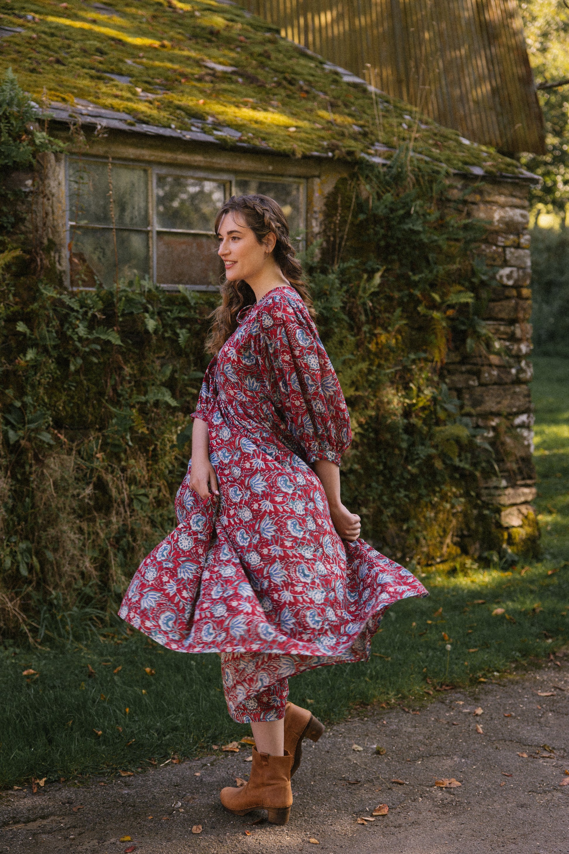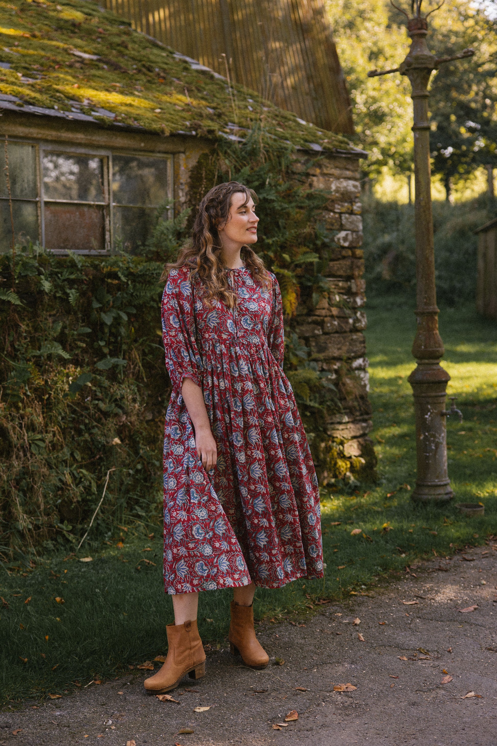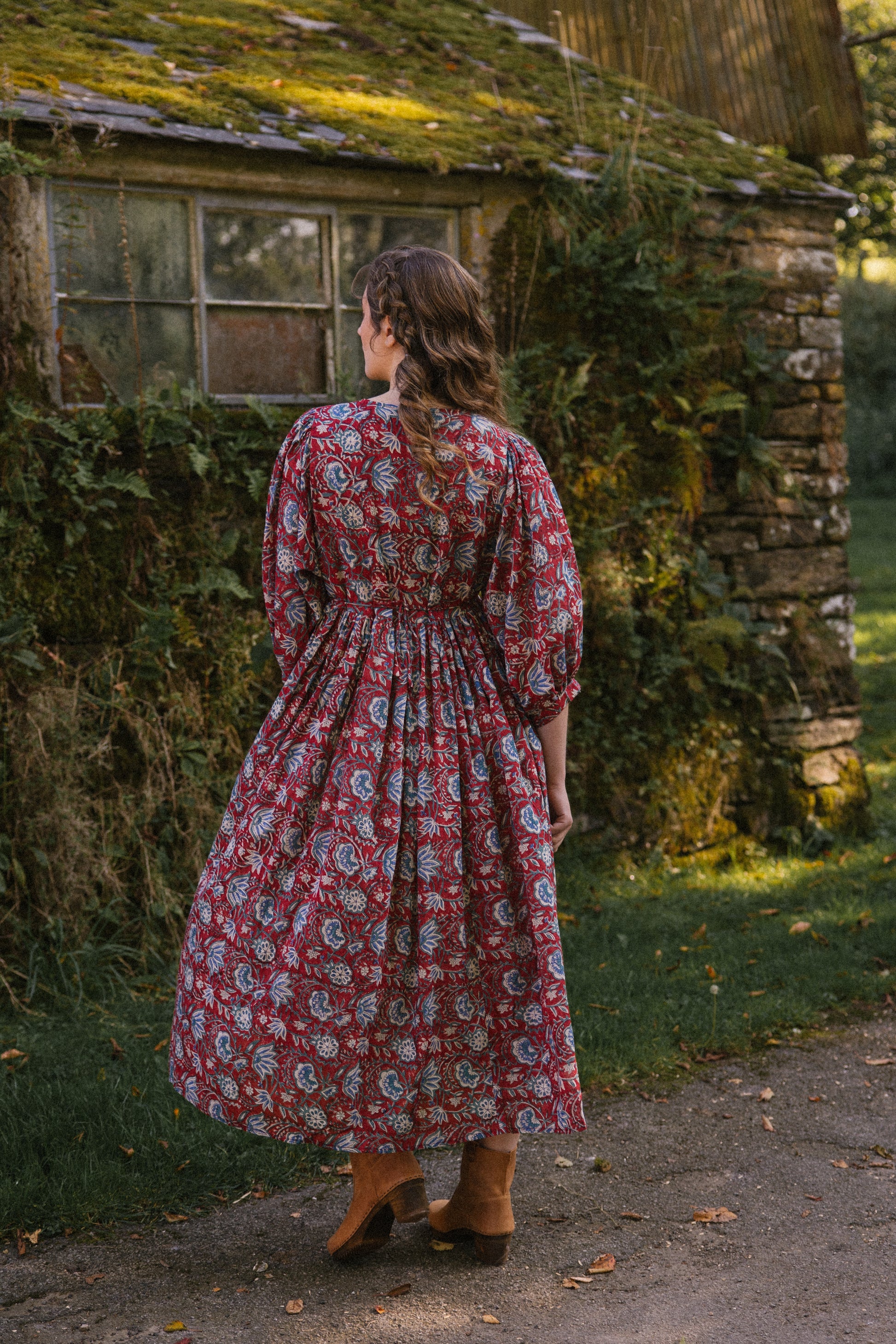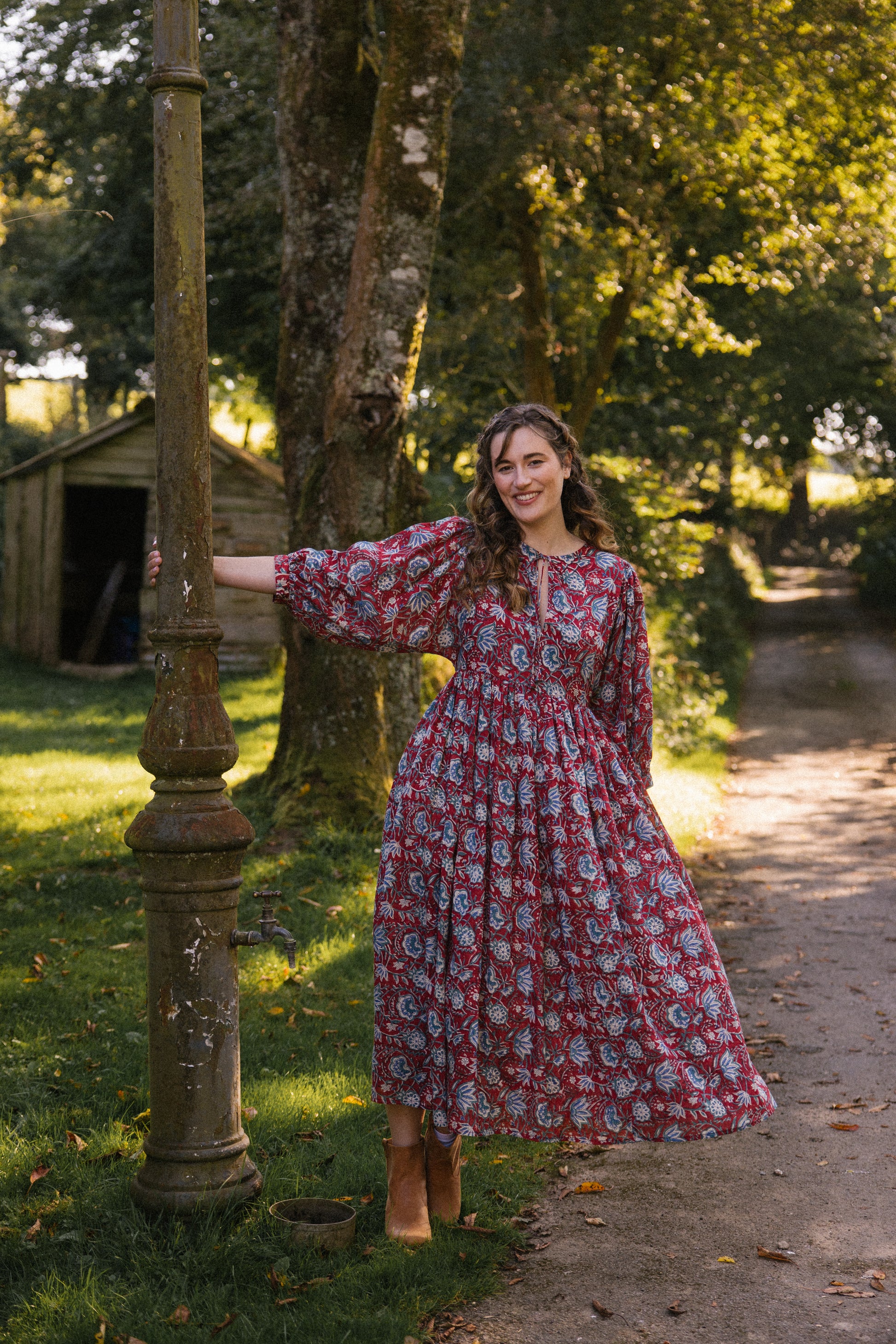 A delightful vintage inspired dress with romantic billowed sleeves. Once on, it will make you want to float throughout your day. Gaia dress is a midi length, with side pockets made in 100% organic cotton.
