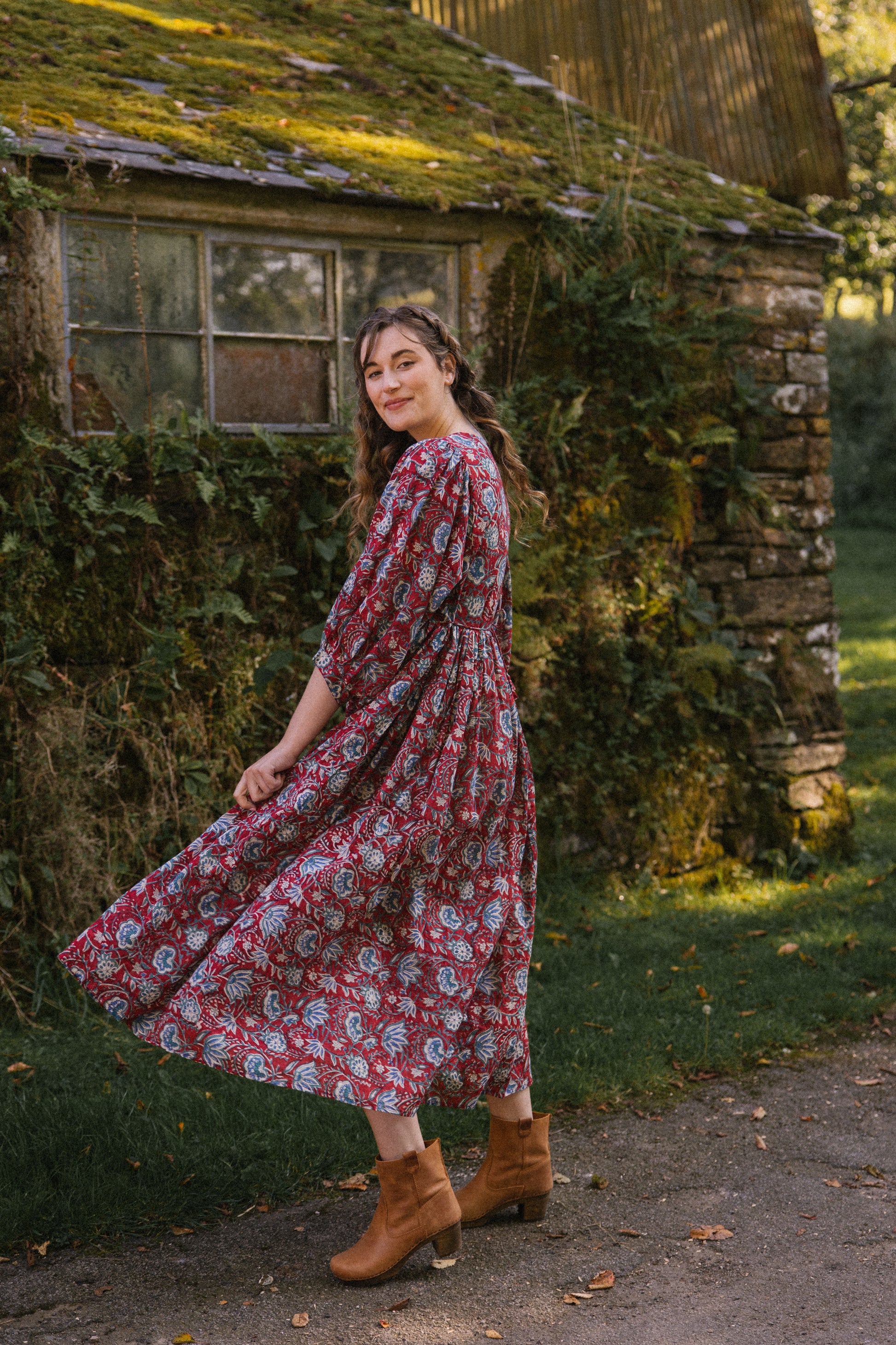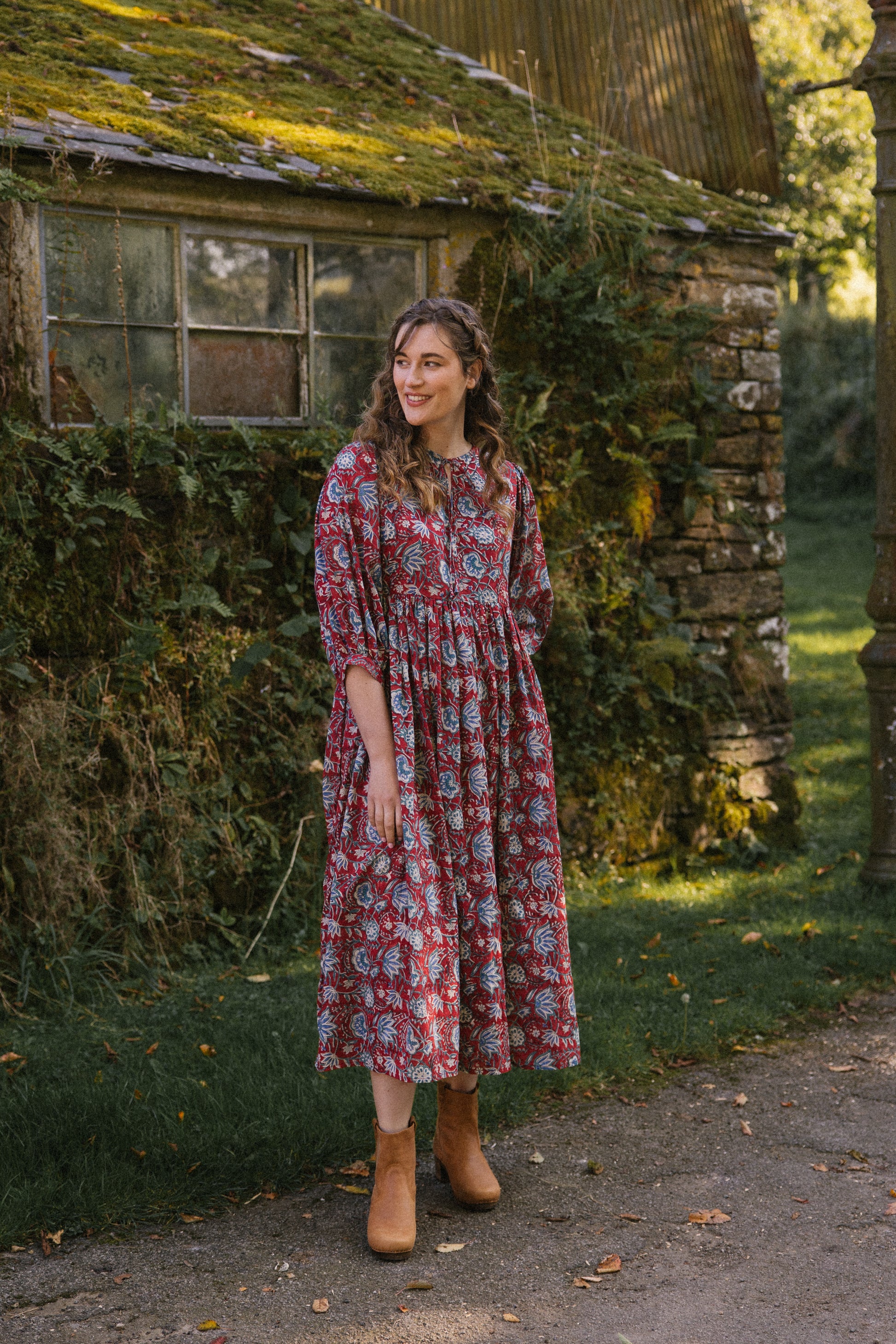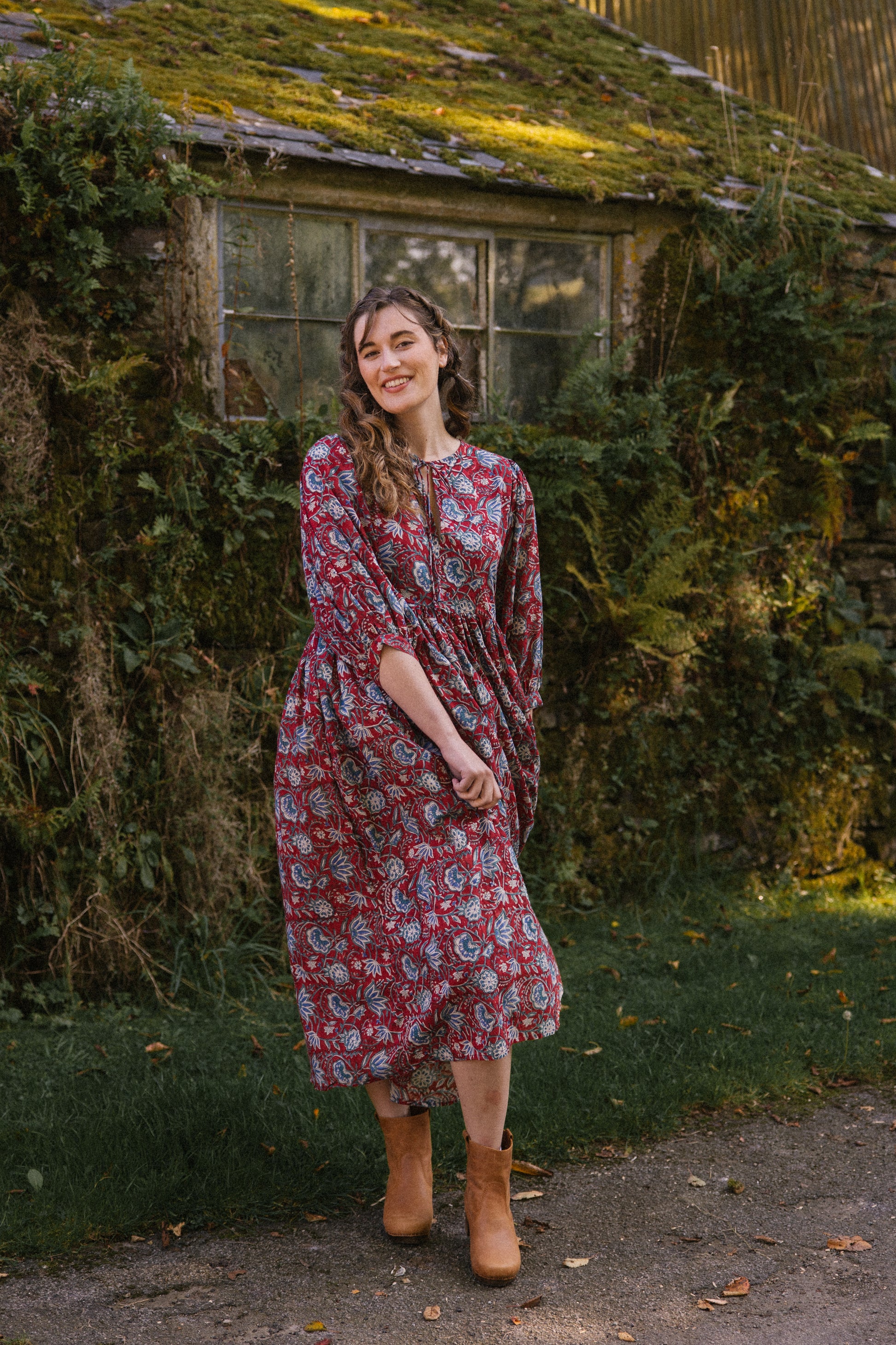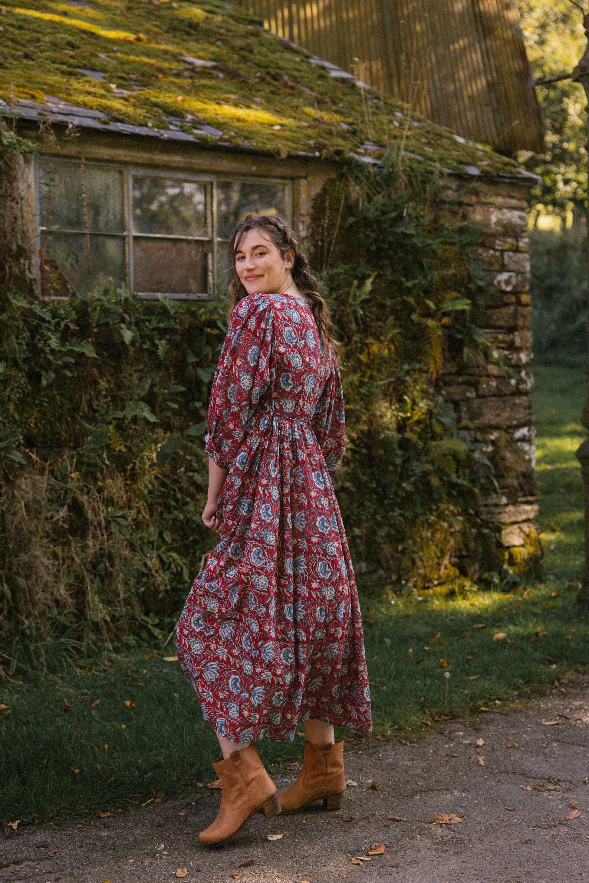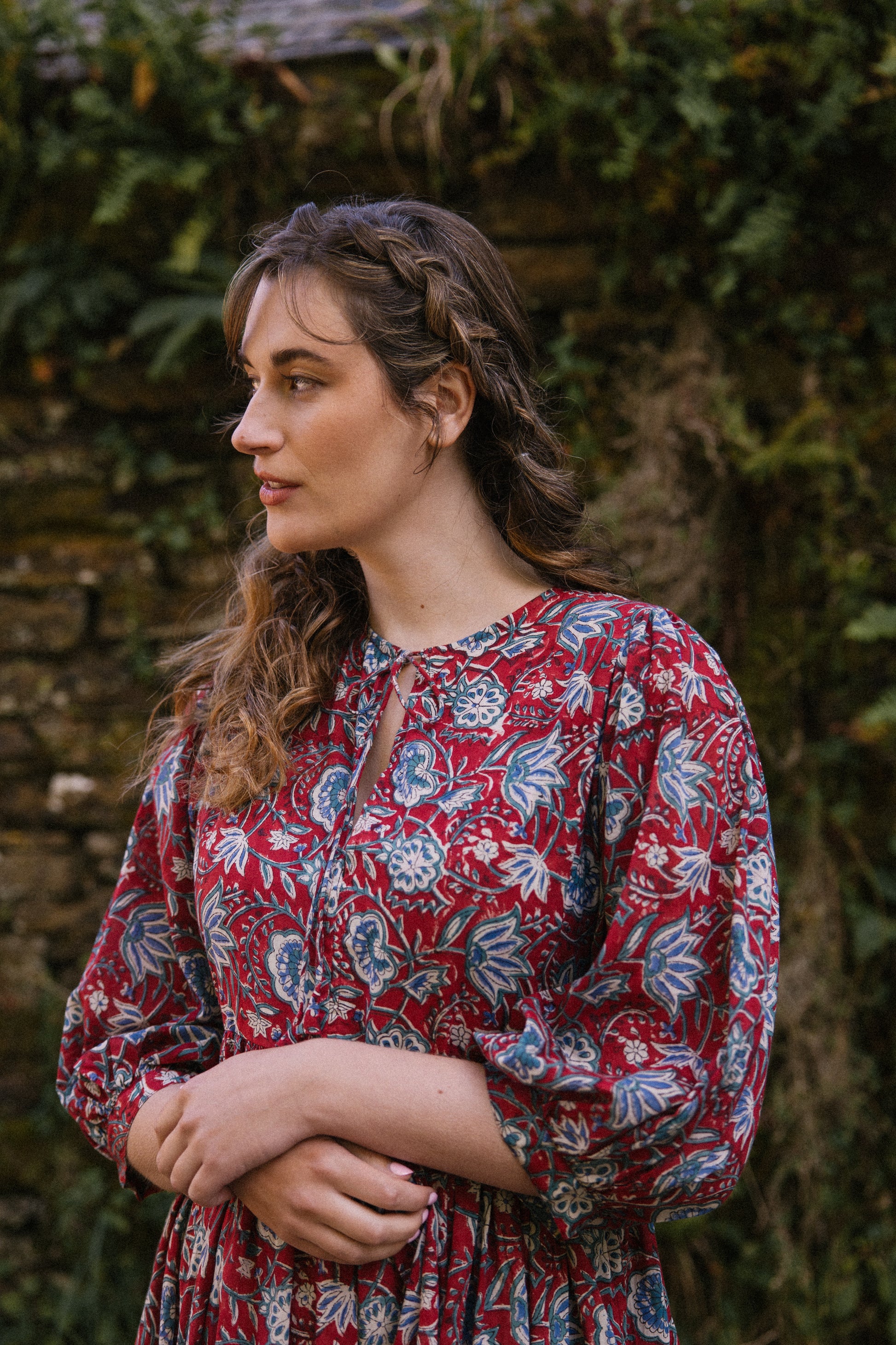 A delightful vintage inspired dress with romantic billowed sleeves. Once on, it will make you want to float throughout your day. Gaia dress is a midi length, with side pockets made in 100% organic cotton.