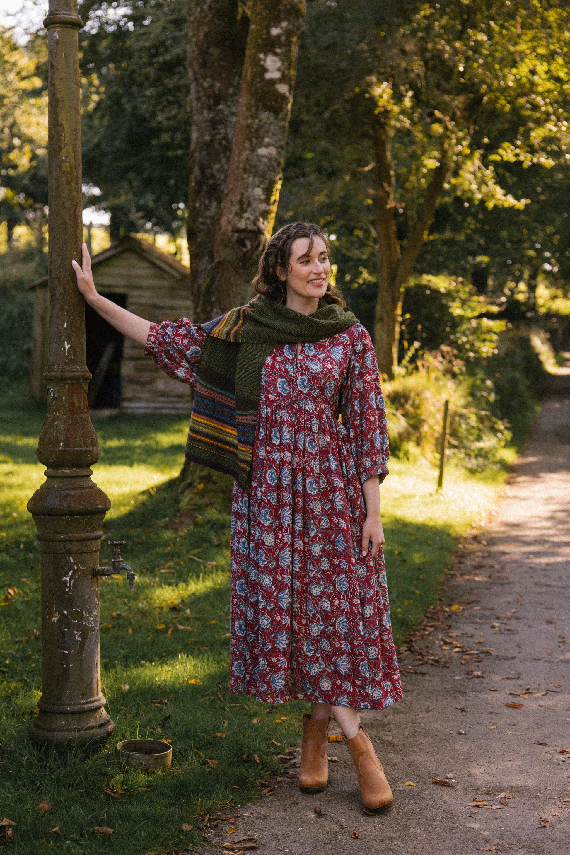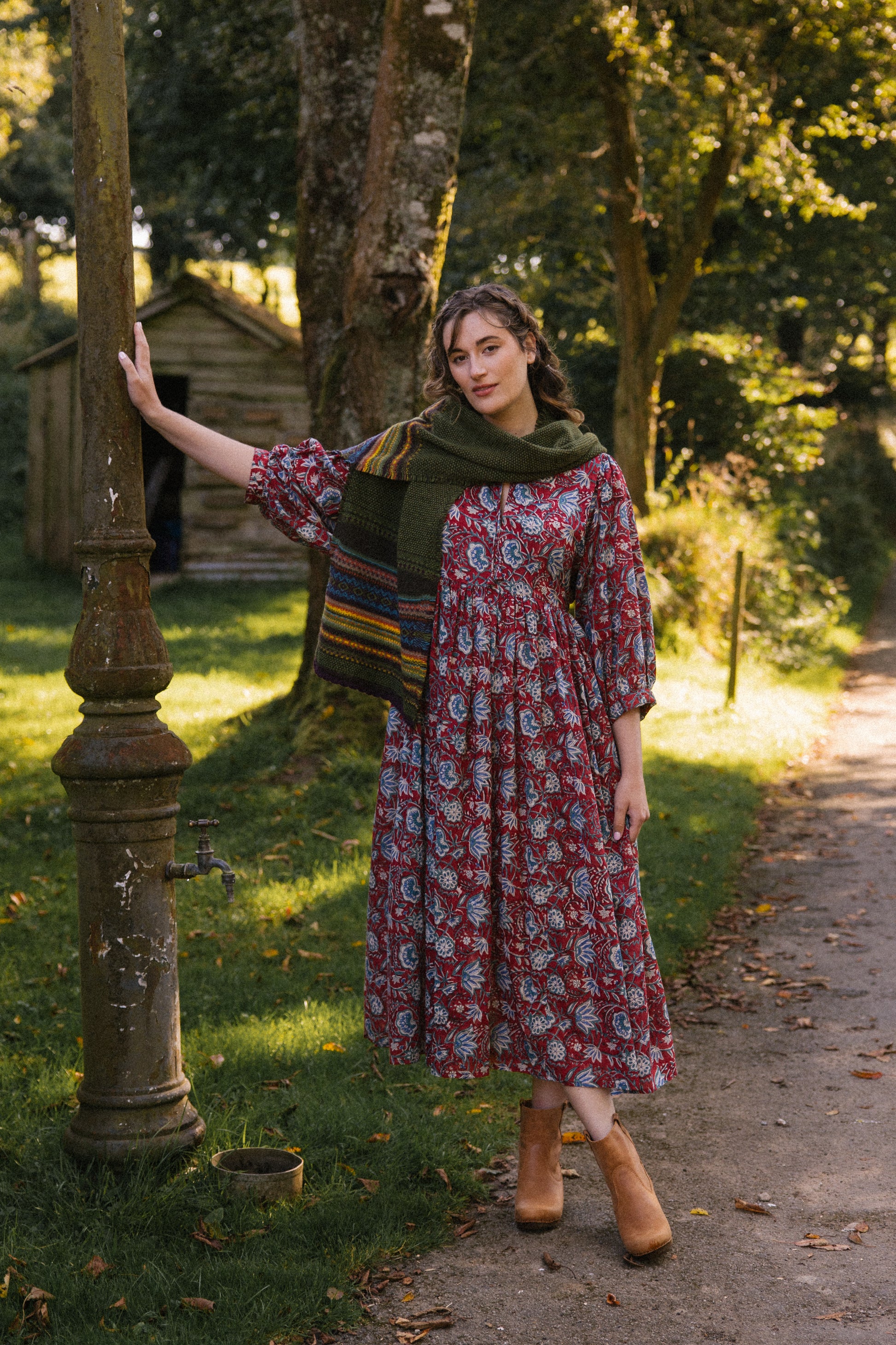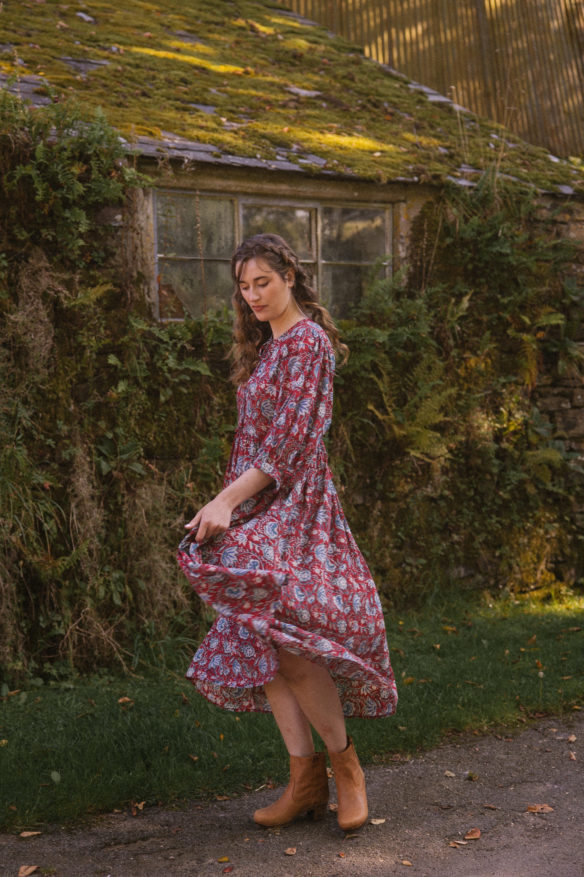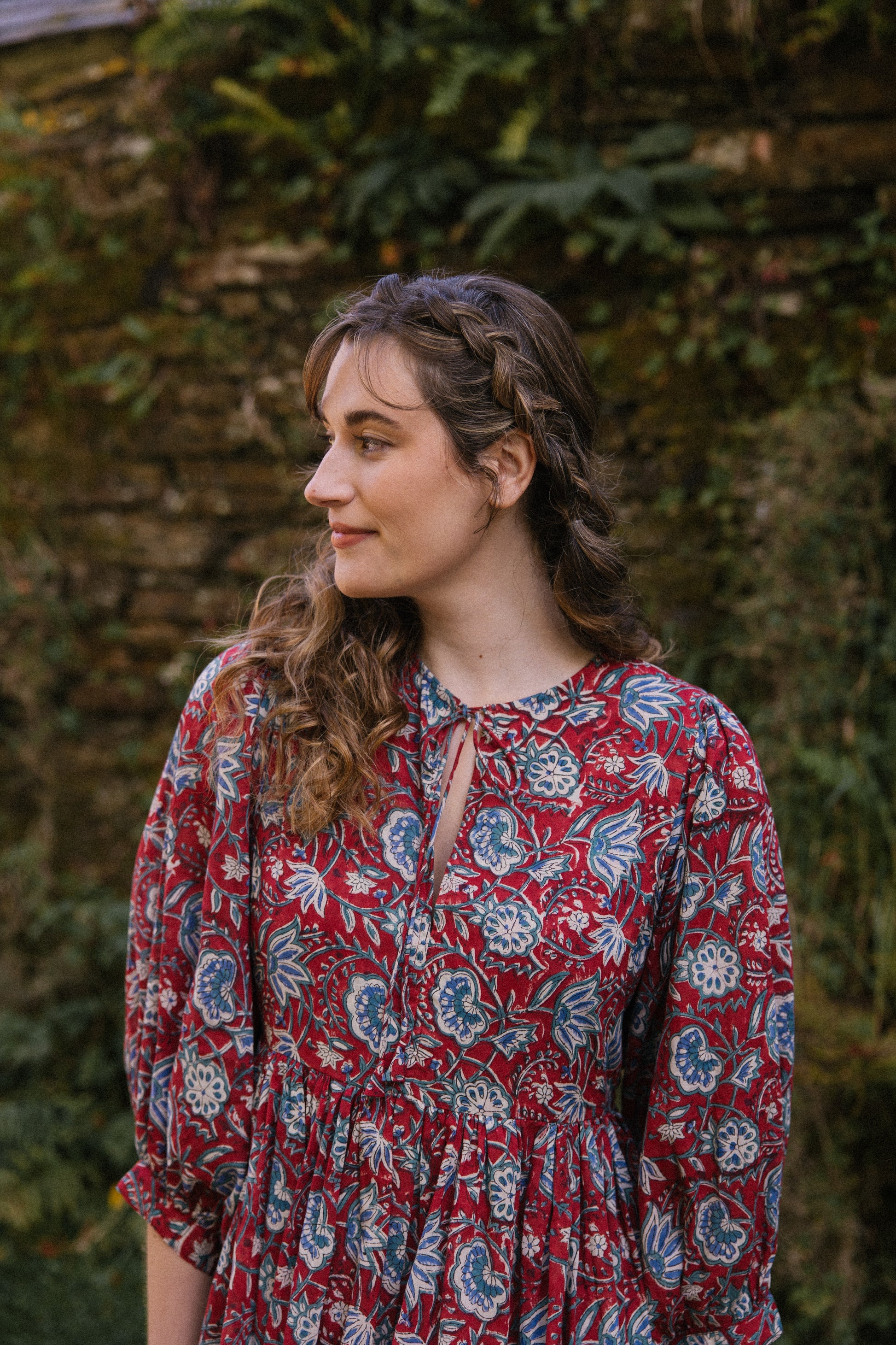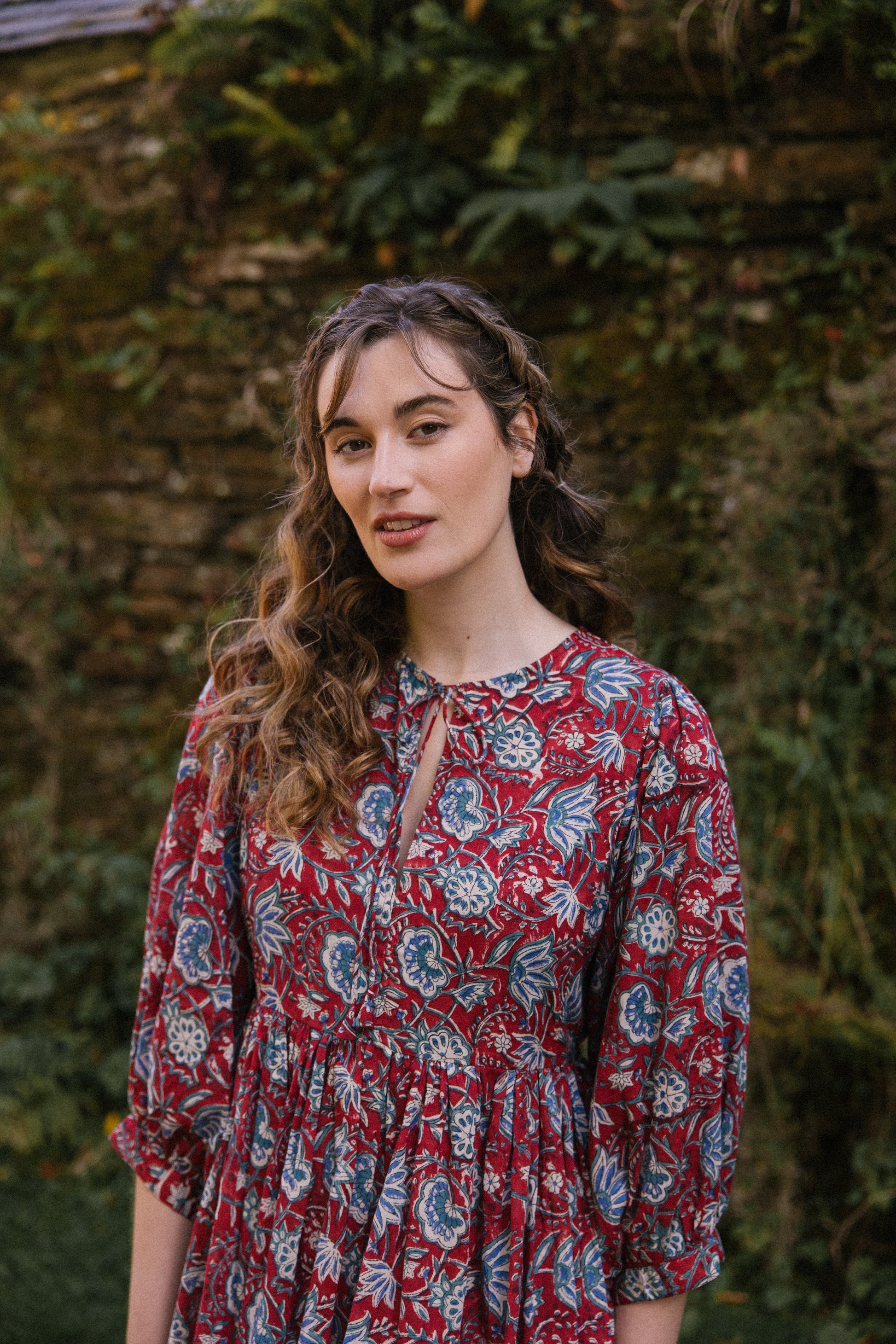 A delightful vintage inspired dress with romantic billowed sleeves. Once on, it will make you want to float throughout your day. Gaia dress is a midi length, with side pockets made in 100% organic cotton.