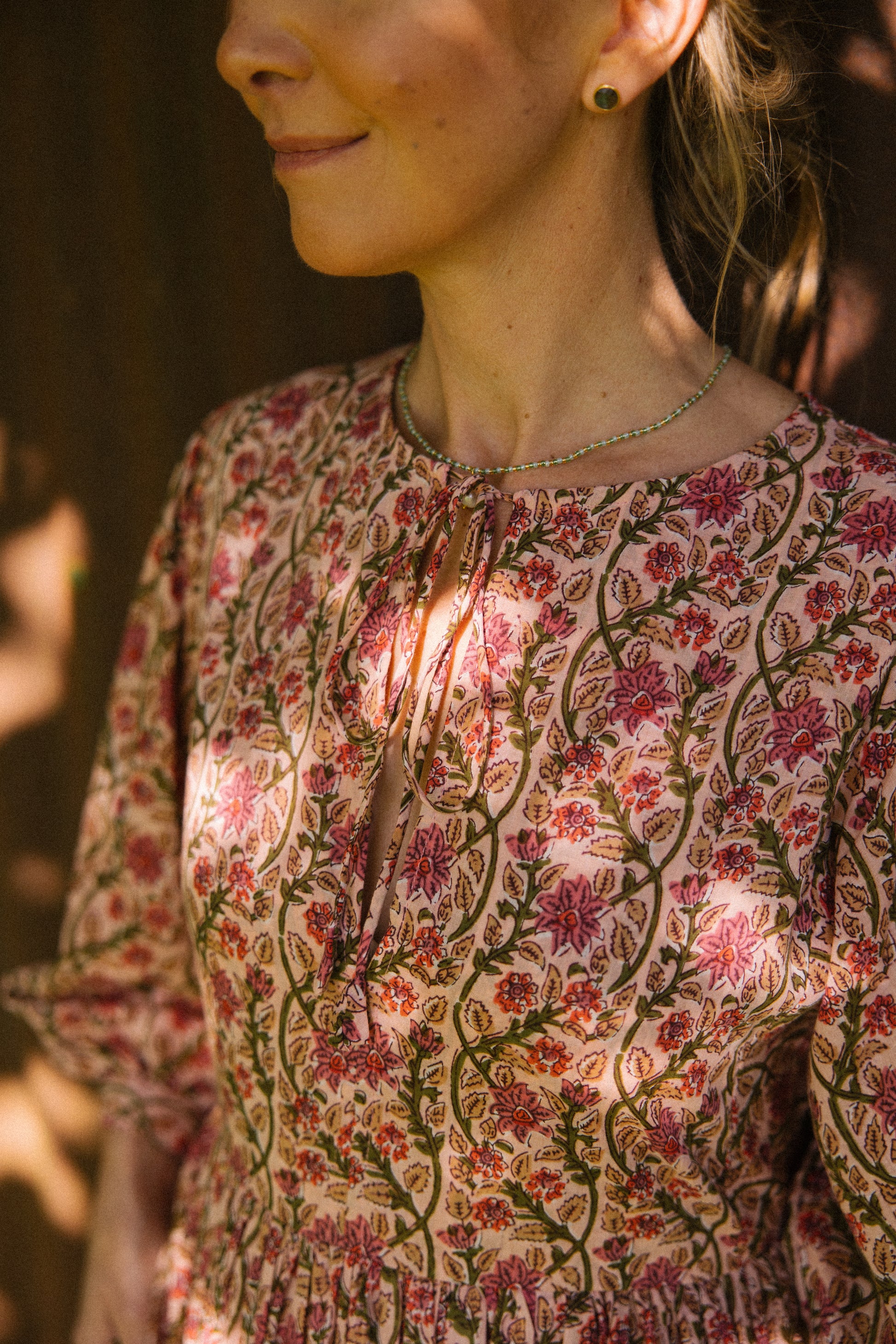 A delightful vintage inspired dress with romantic billowed sleeves. Once on, it will make you want to float throughout your day. Gaia dress is a midi length, with side pockets made in 100% cotton.