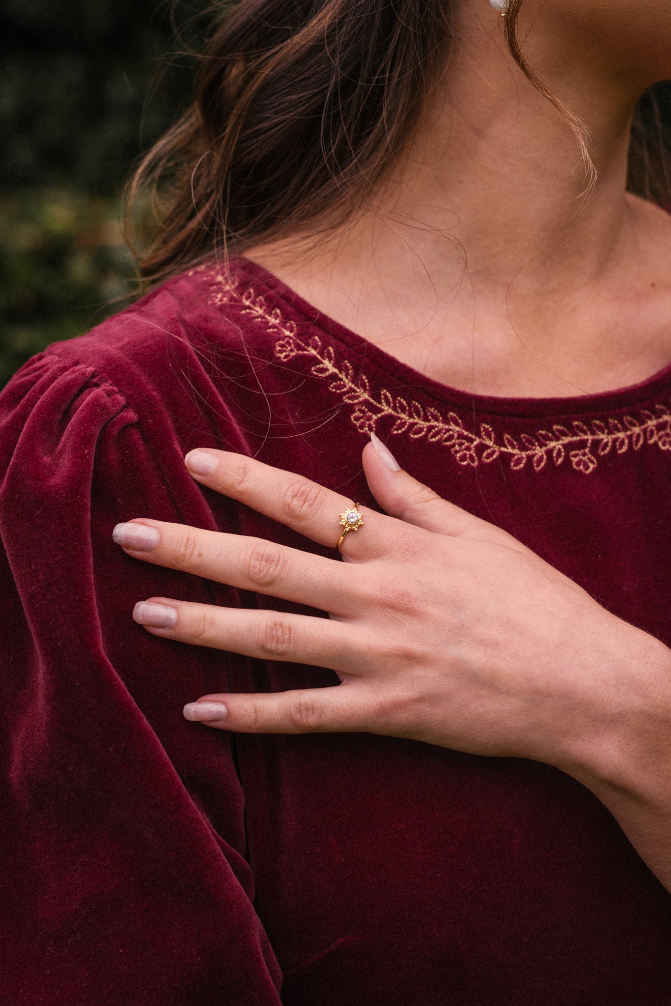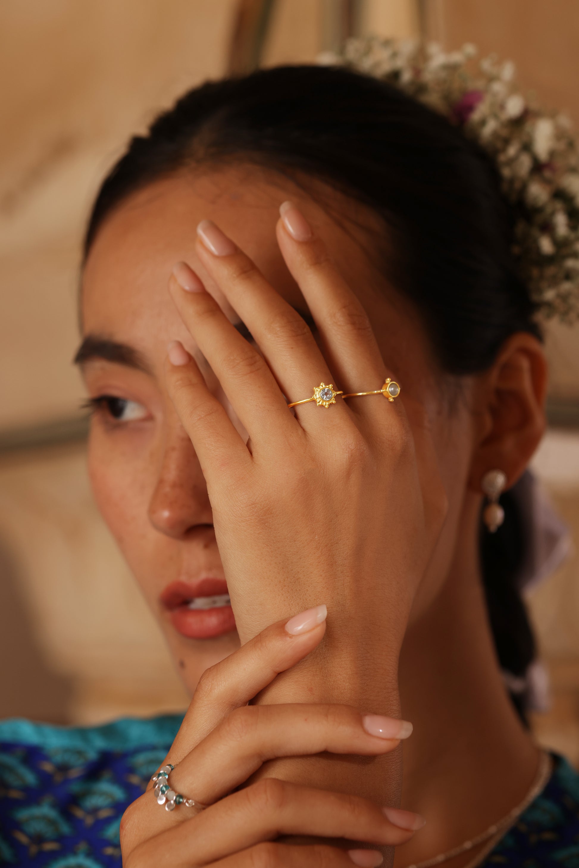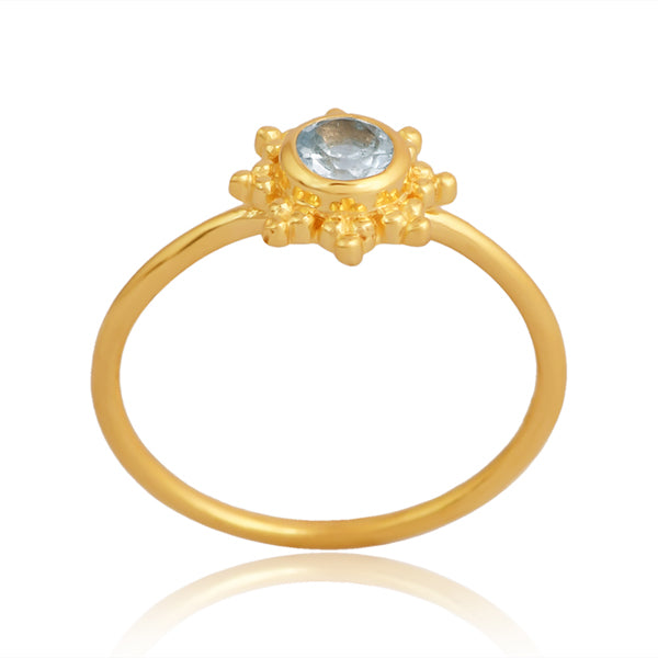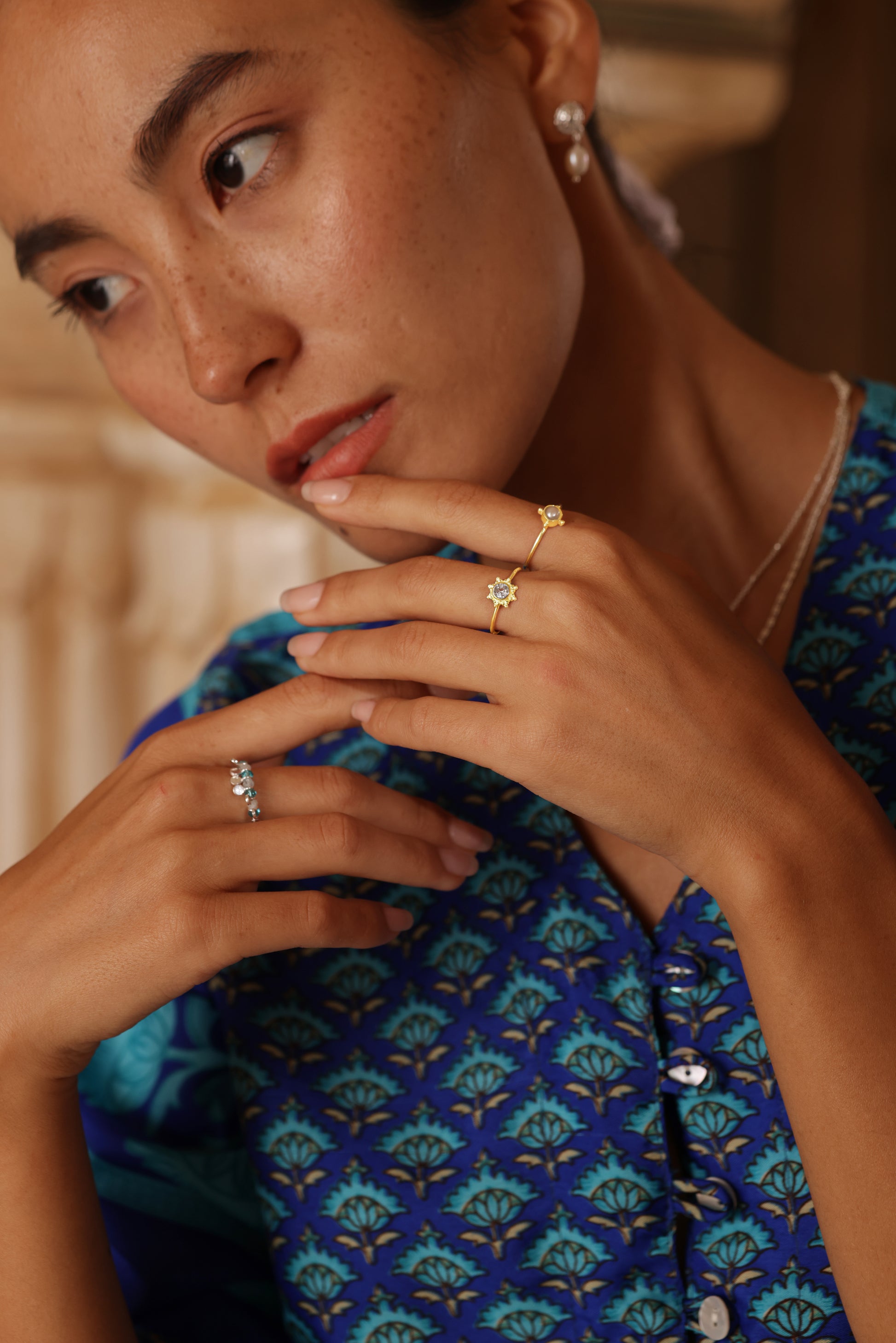 Asteria is a vintage inspired ring, Hand crafted in a romantic style with a dreamy hand cut round blue topaz set in a delicate filigree flower cluster. Wear it solo for everyday elegance, looks equally beautiful with our twisted stacking ring.