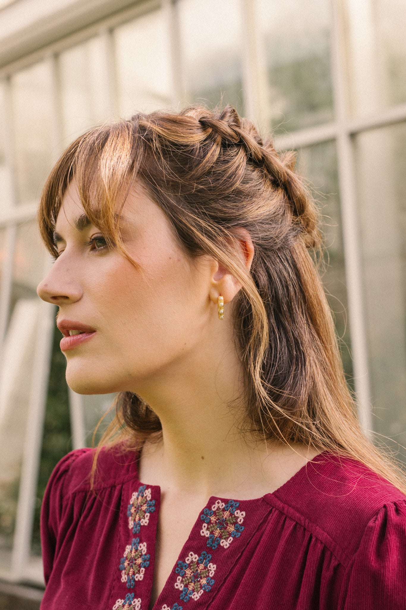 These beautiful hoops are inspired by east meets west fusion, they have a contemporary but also a feel of antiquity. Hand crafted by Artisans, they’re punctuated with small lustrous cabushion pearls on a 18ct gold vermeil hoop with a matt finish. These hoops have a understated elegance, they are lightweight and can pair well with a day and a special night outfit .