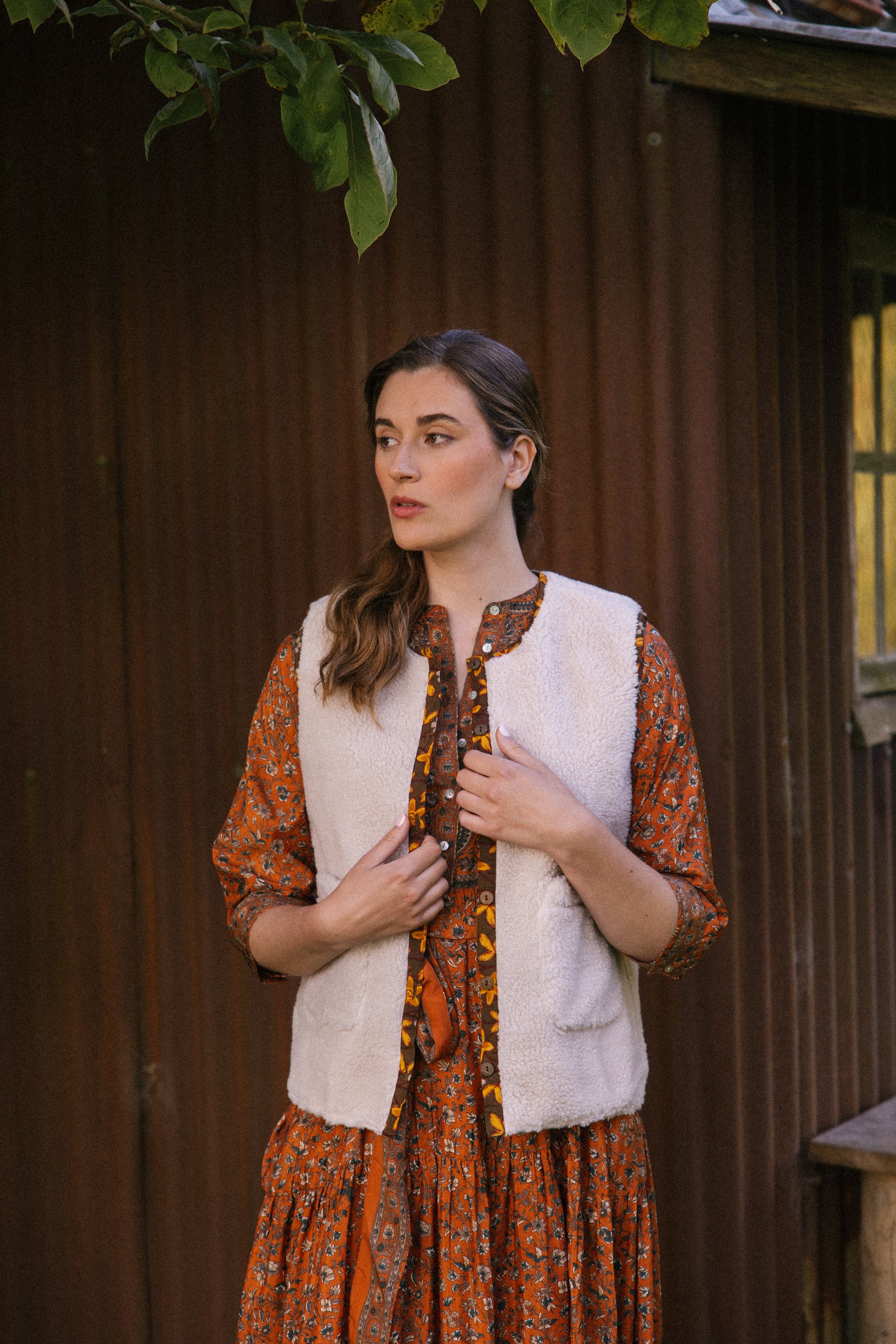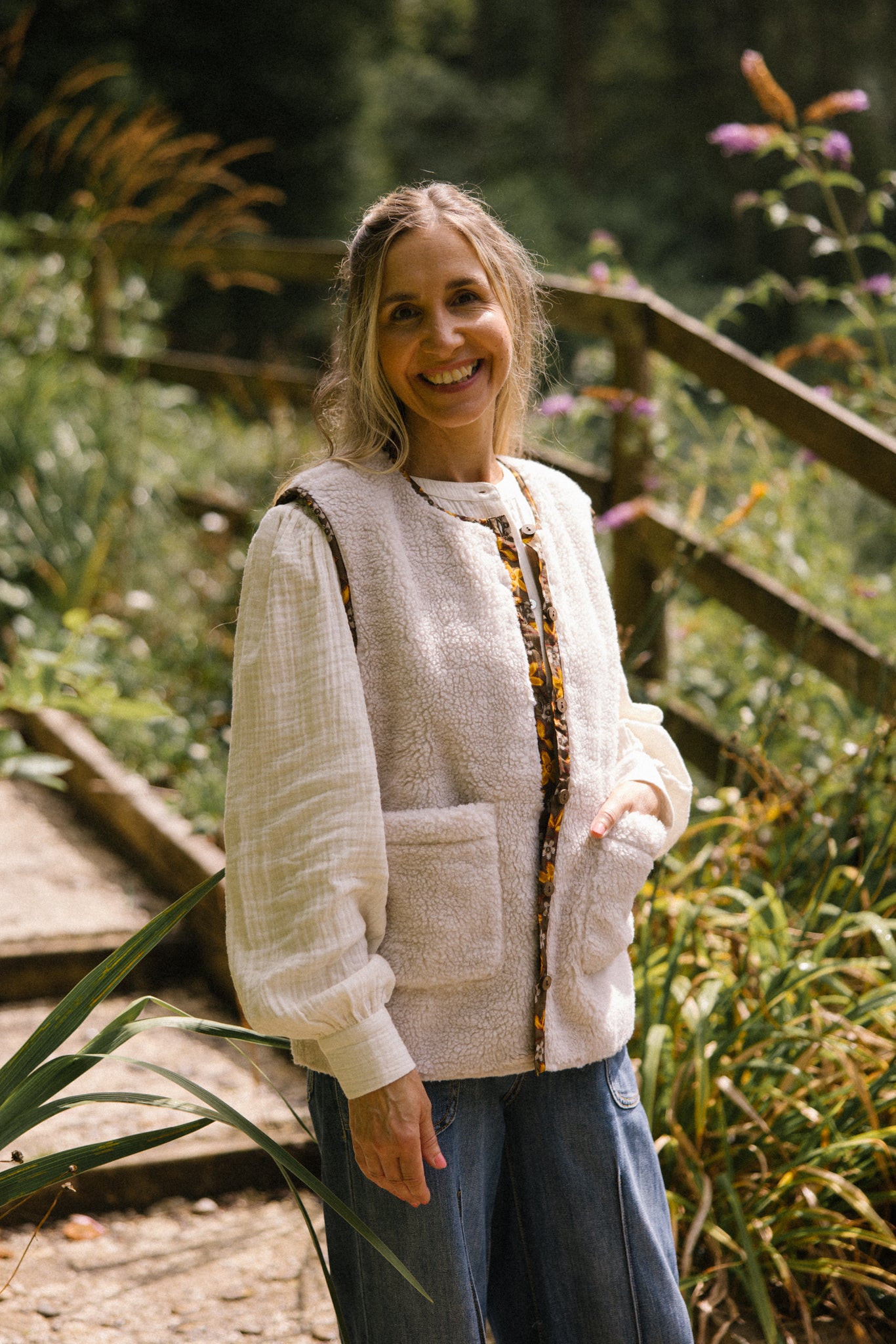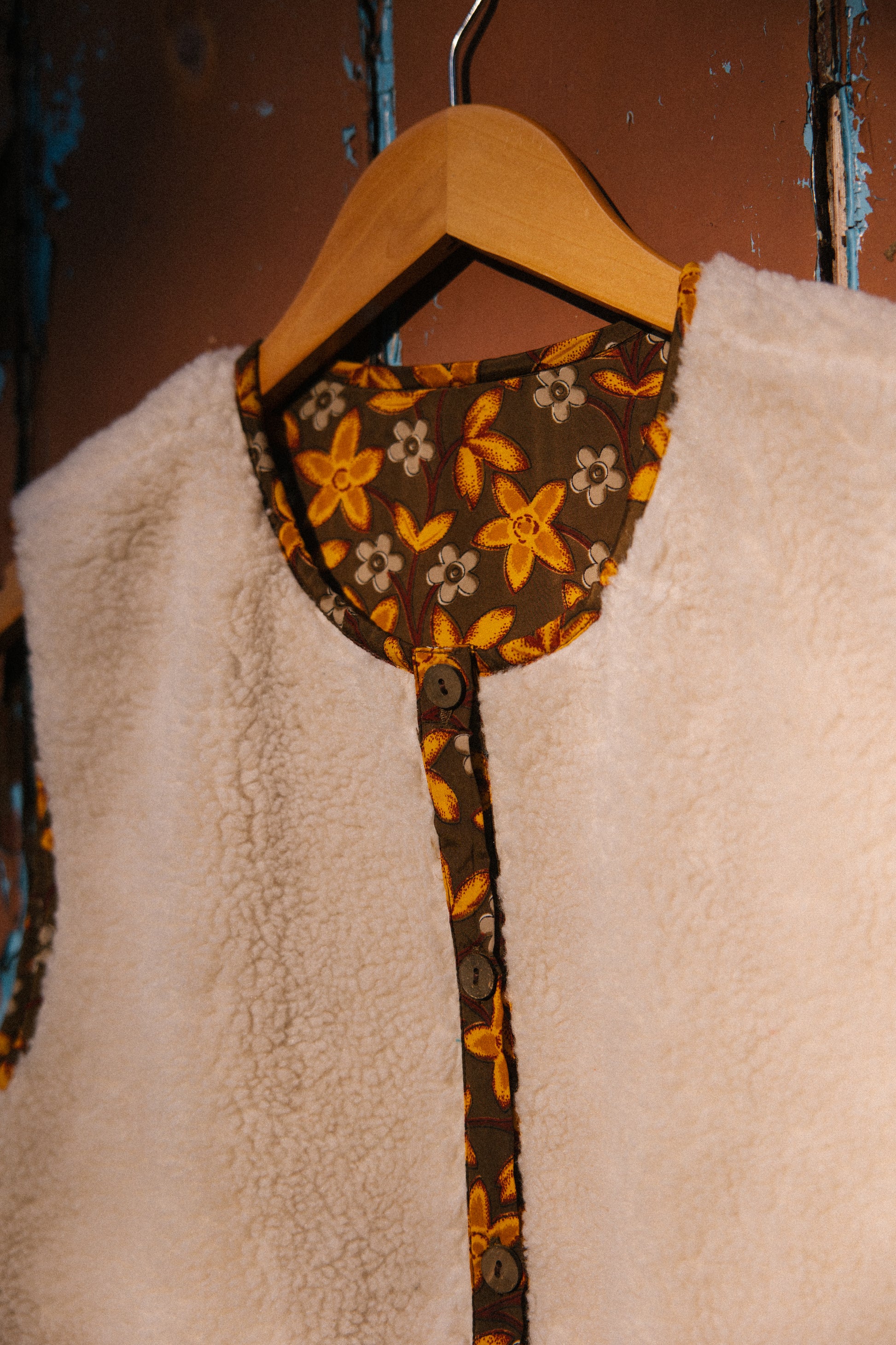 This will be your essential layering piece, whatever the season. Super snug with a soft teddy on one side and a unique vintage sari print on the reverse, this pretty gilet is the ultimate folk piece and hopefully one that will be treasured for years and then passed down to generations!