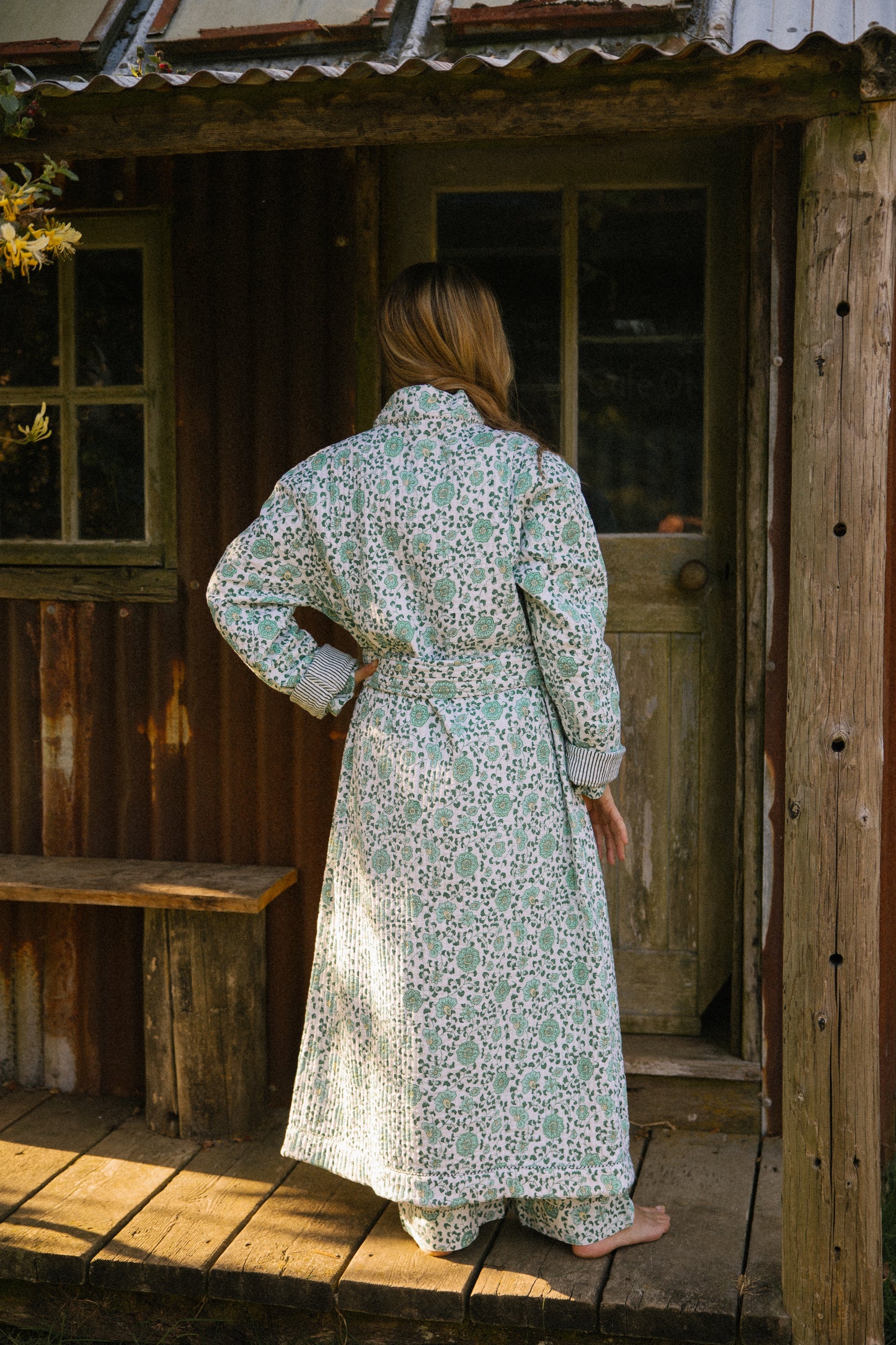 Made in our beautiful original Mona print in a soft petal green ,which is hand screen printed in our own exclusive fresh floral design, with the inside printed in a stripe motif . Its cut from GOTS-certified organic cotton and quilted throughout, so it feels like a warm hug.