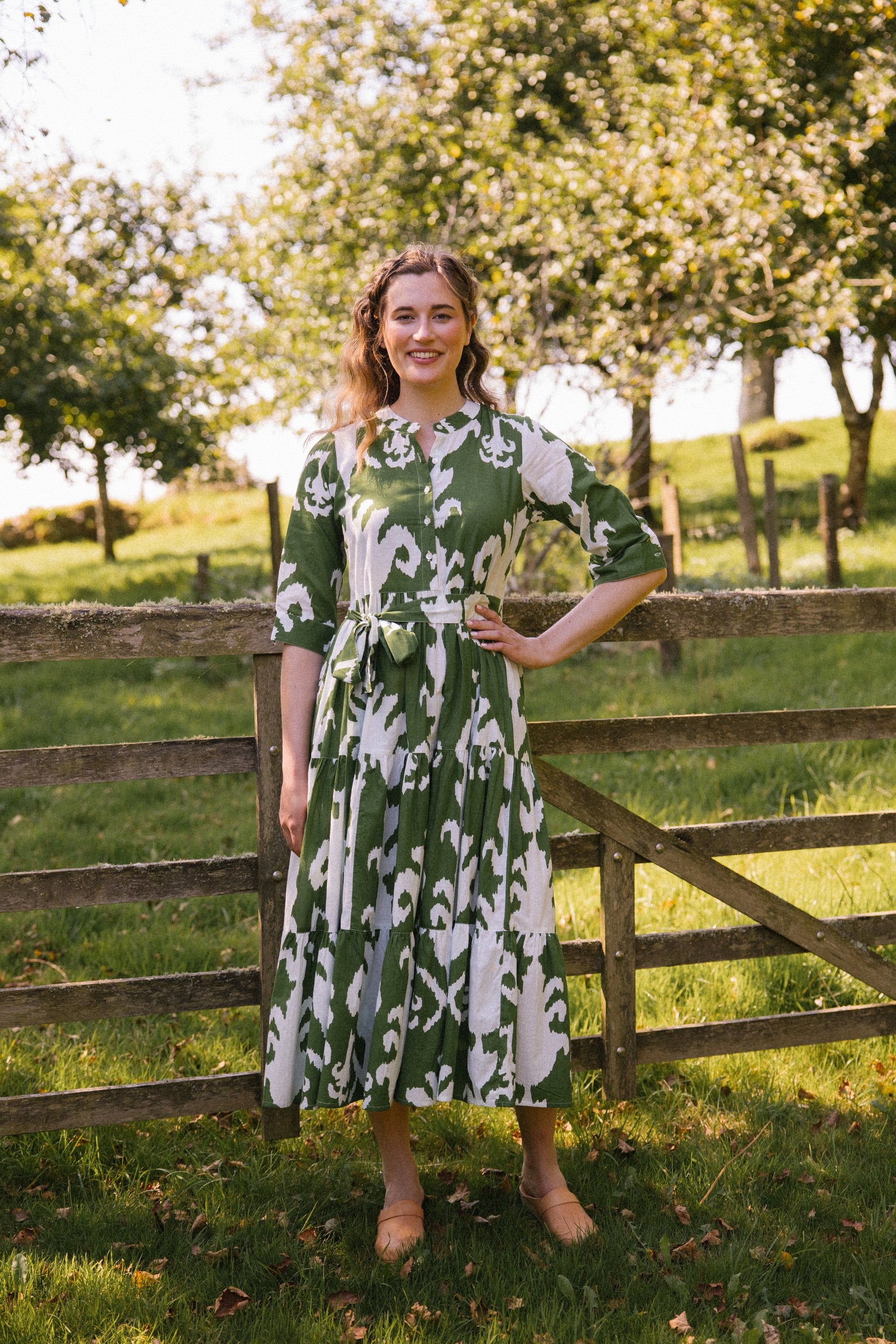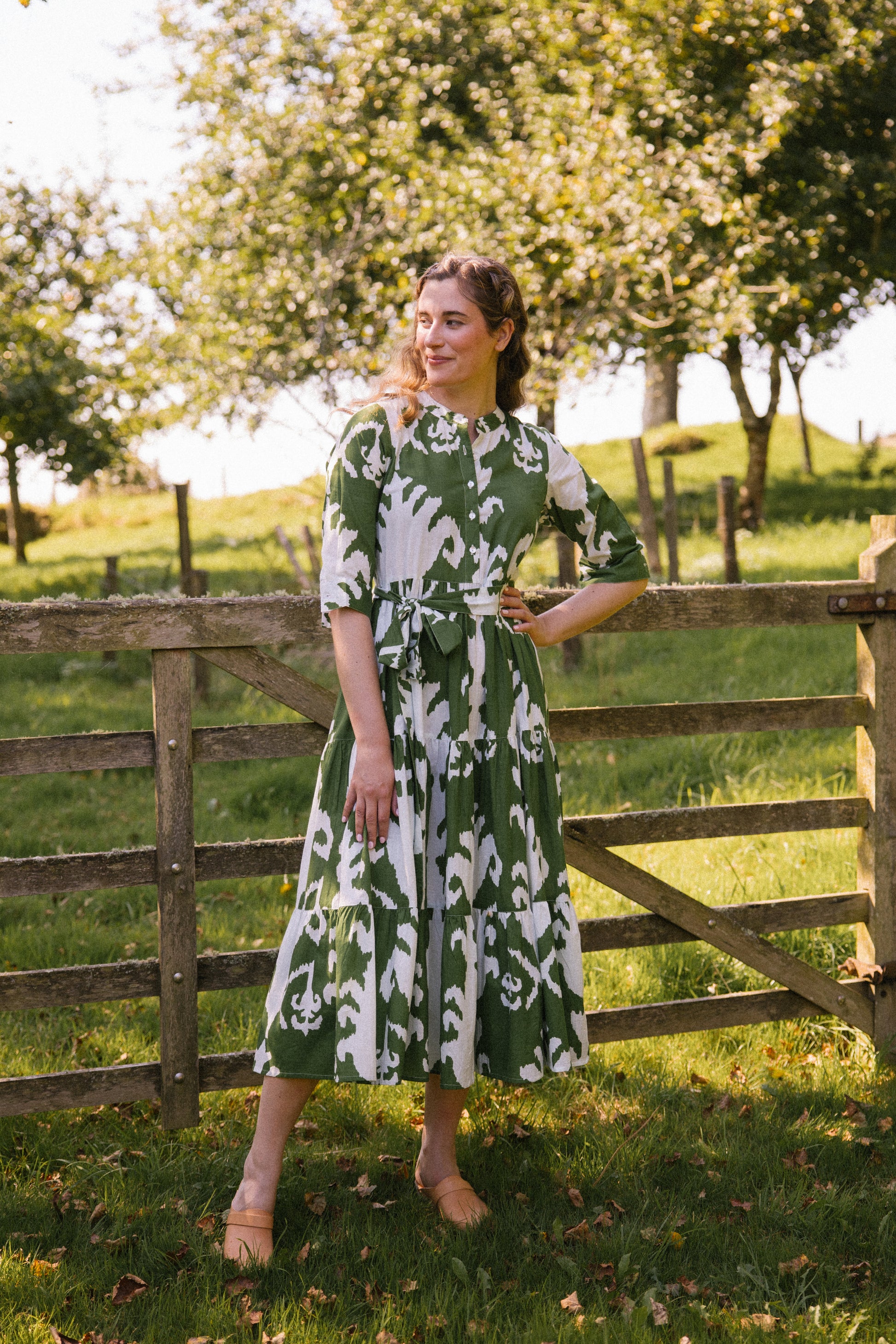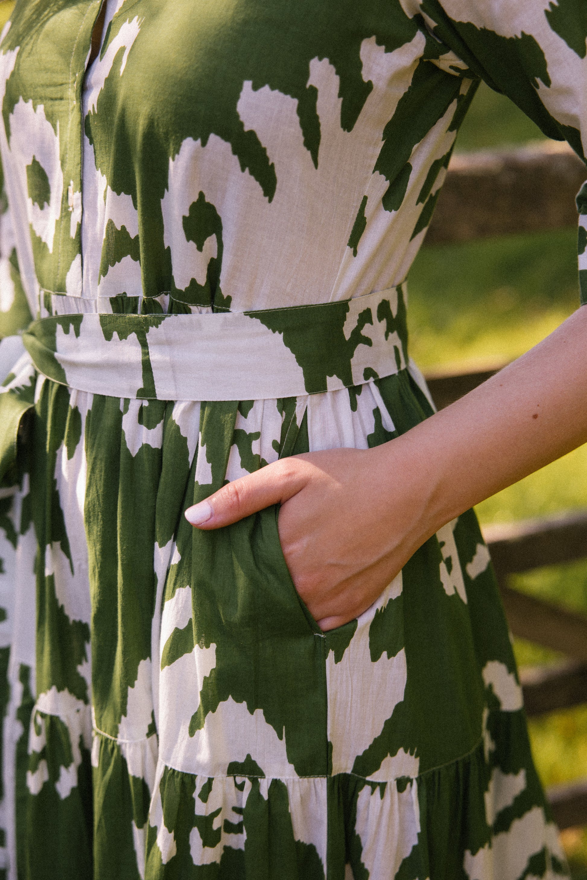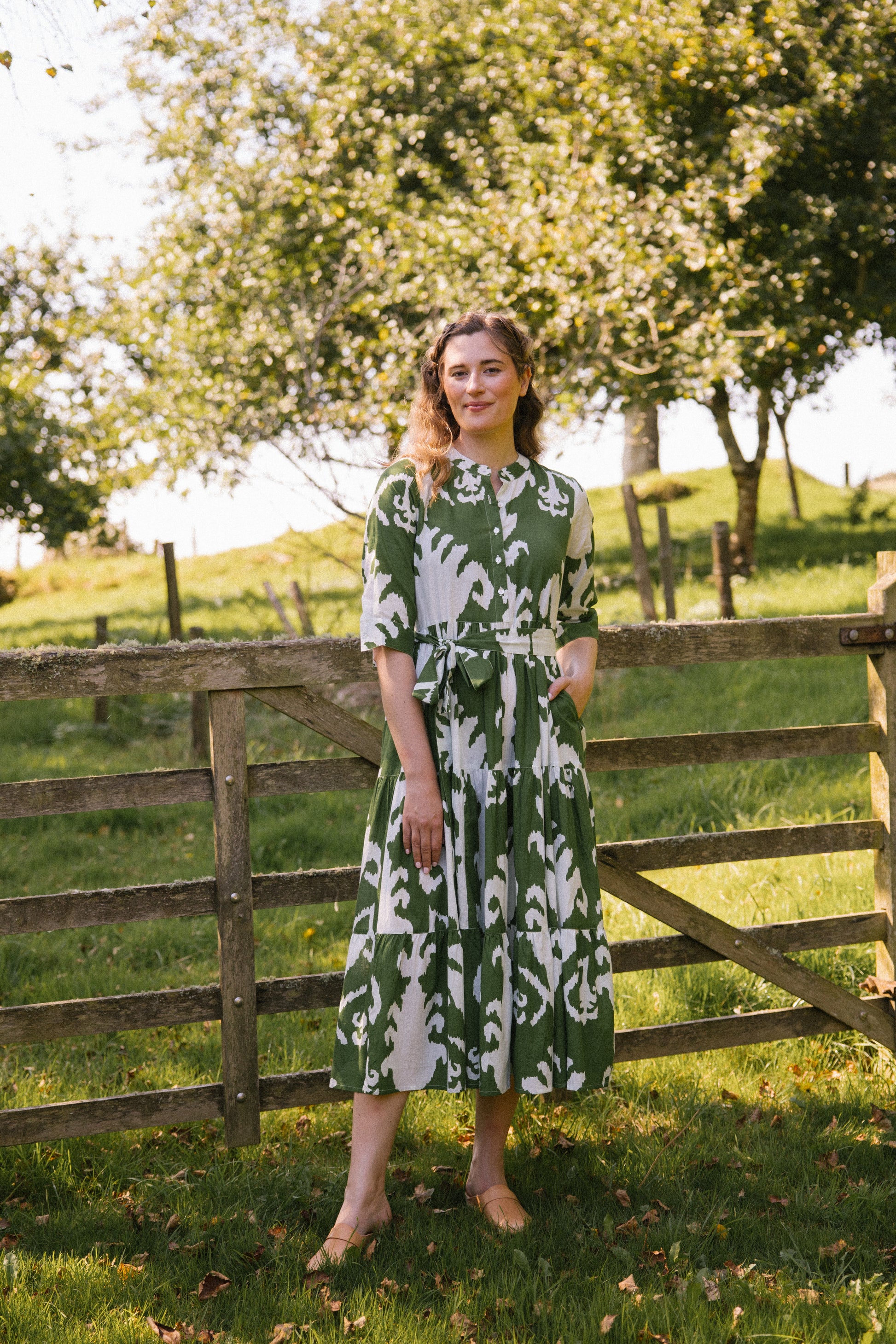 Prairie is a full length maxi style dress with a buttoned front bodice with a tiered skirt, 3/4 length sleeves plus an optional belt to cinch in the waist, internal side pockets .