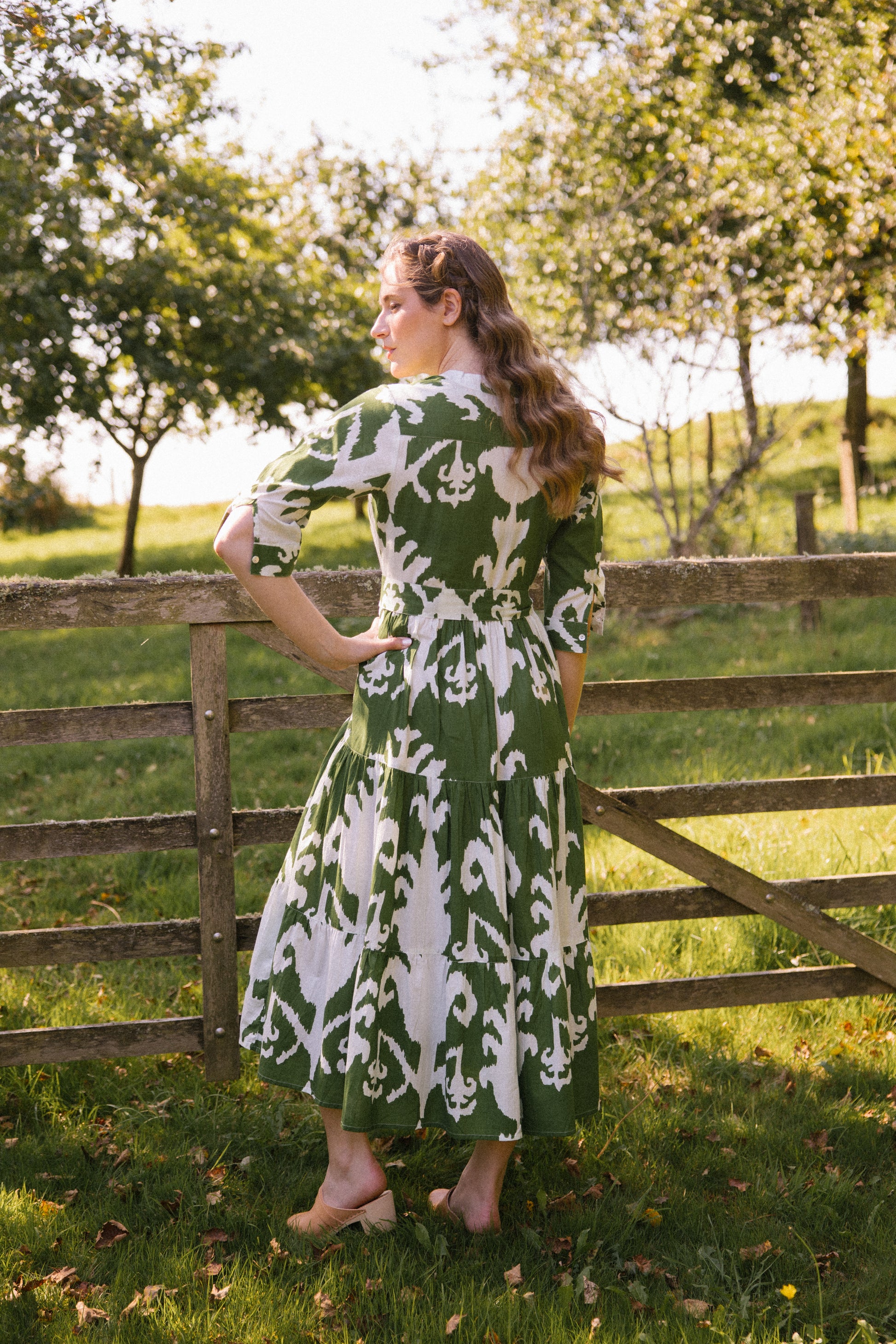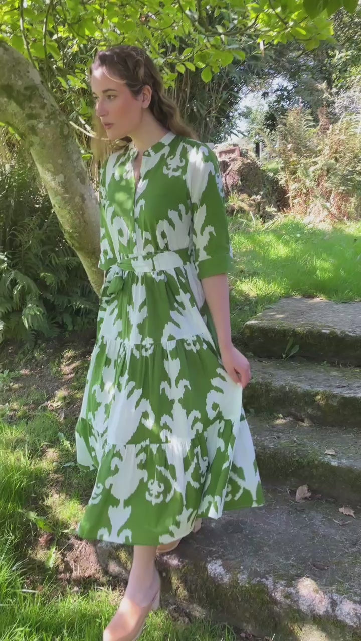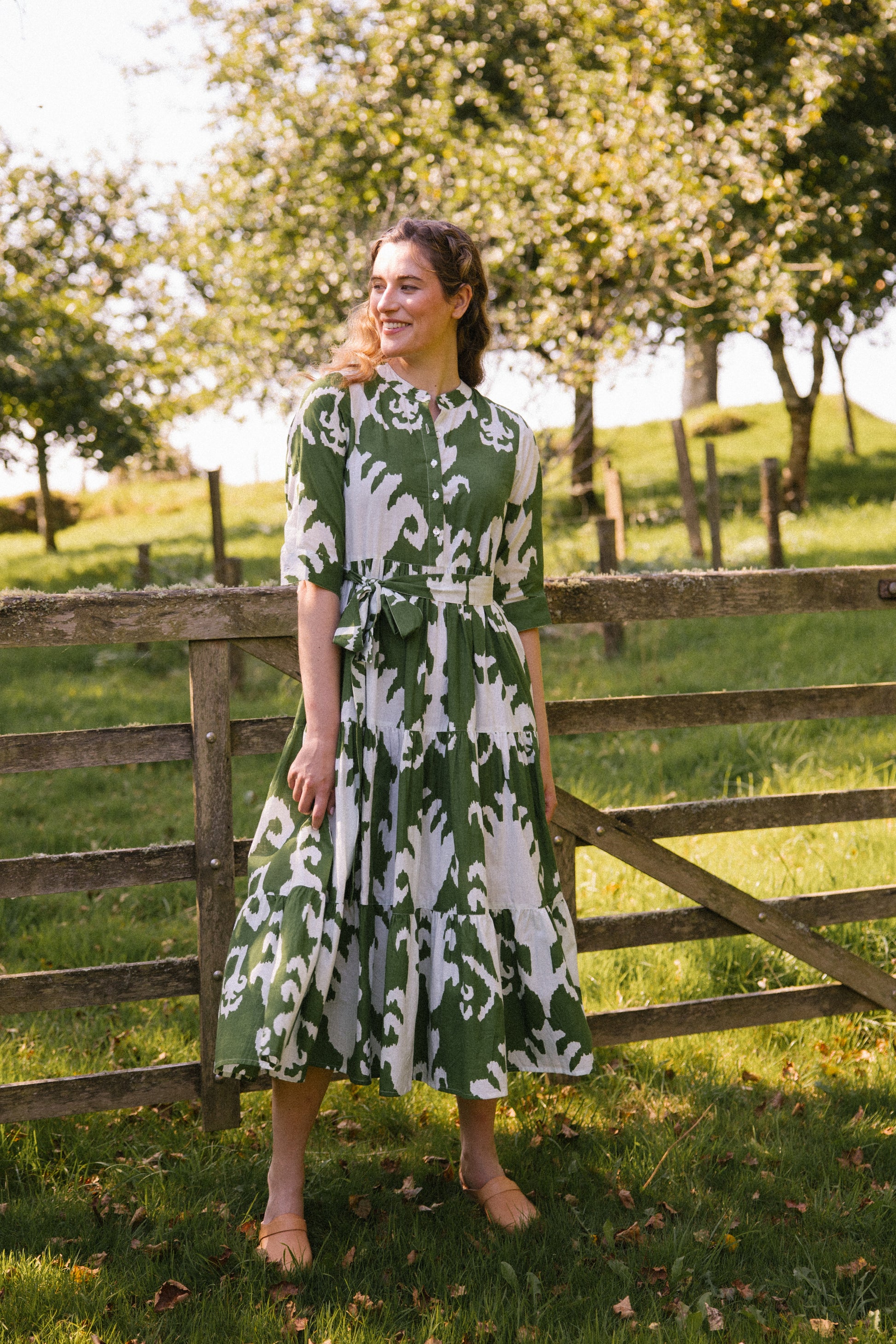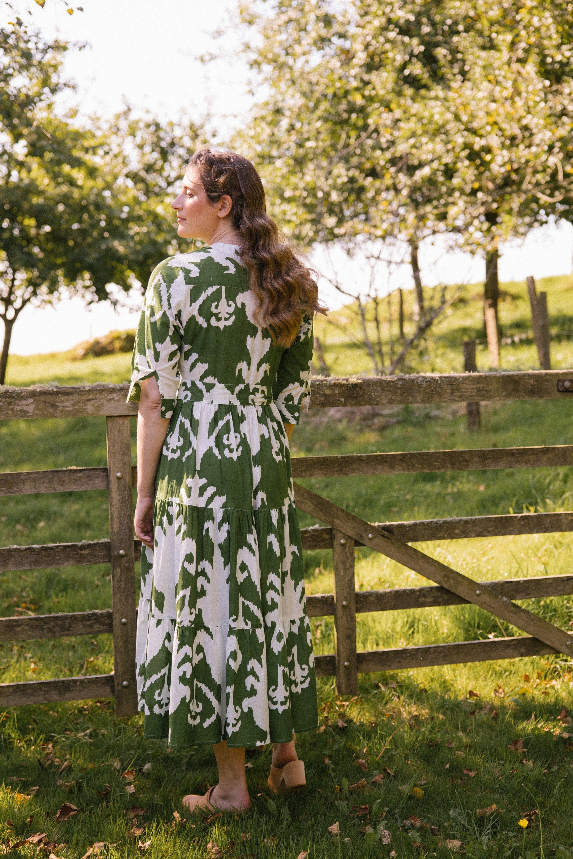 Prairie is a full length maxi style dress with a buttoned front bodice with a tiered skirt, 3/4 length sleeves plus an optional belt to cinch in the waist, internal side pockets .
