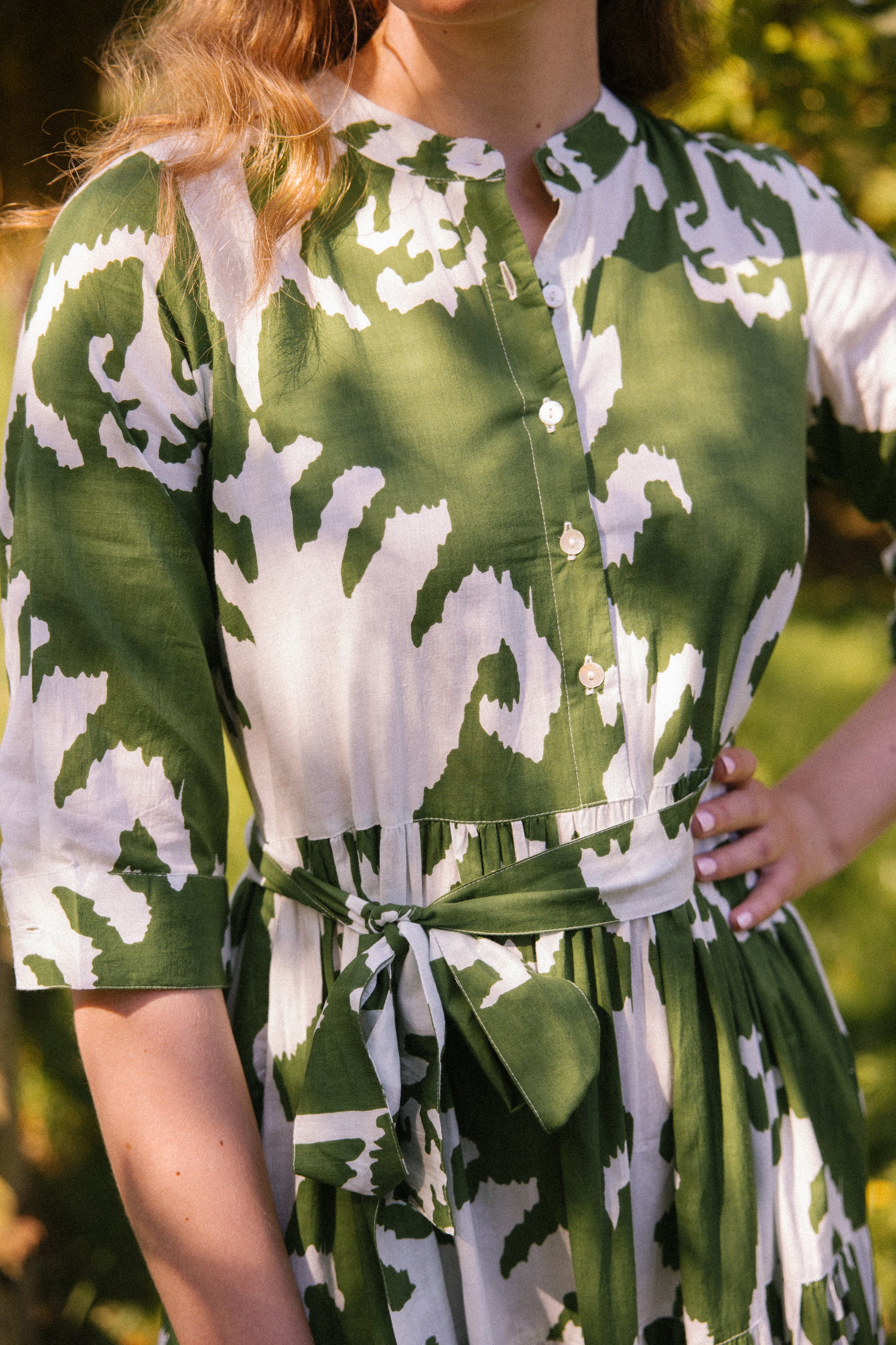 We have brought her back in this season in a really easy abstract print in a fresh green and white combo .