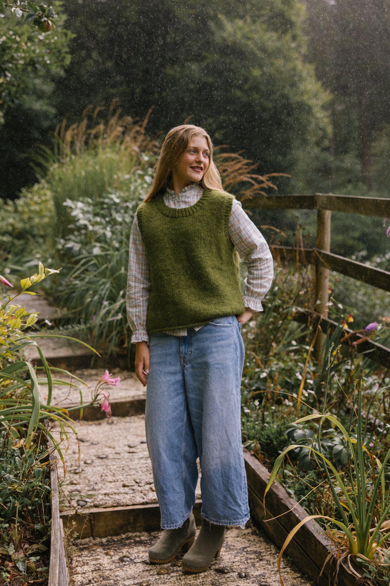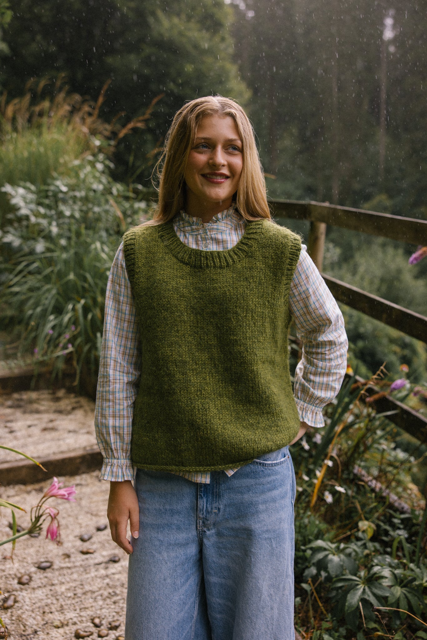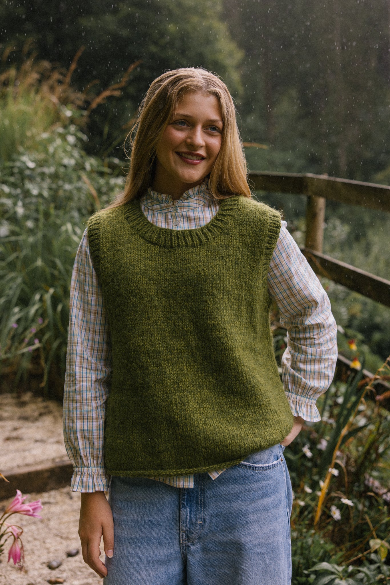 Round ribbed neck and armholes. Straight cut. Roll-up Hand-knitted with hand-spun, hand-dyed yarn made from non-mulesed wool. A resilient yarn that softens and adapts over time.