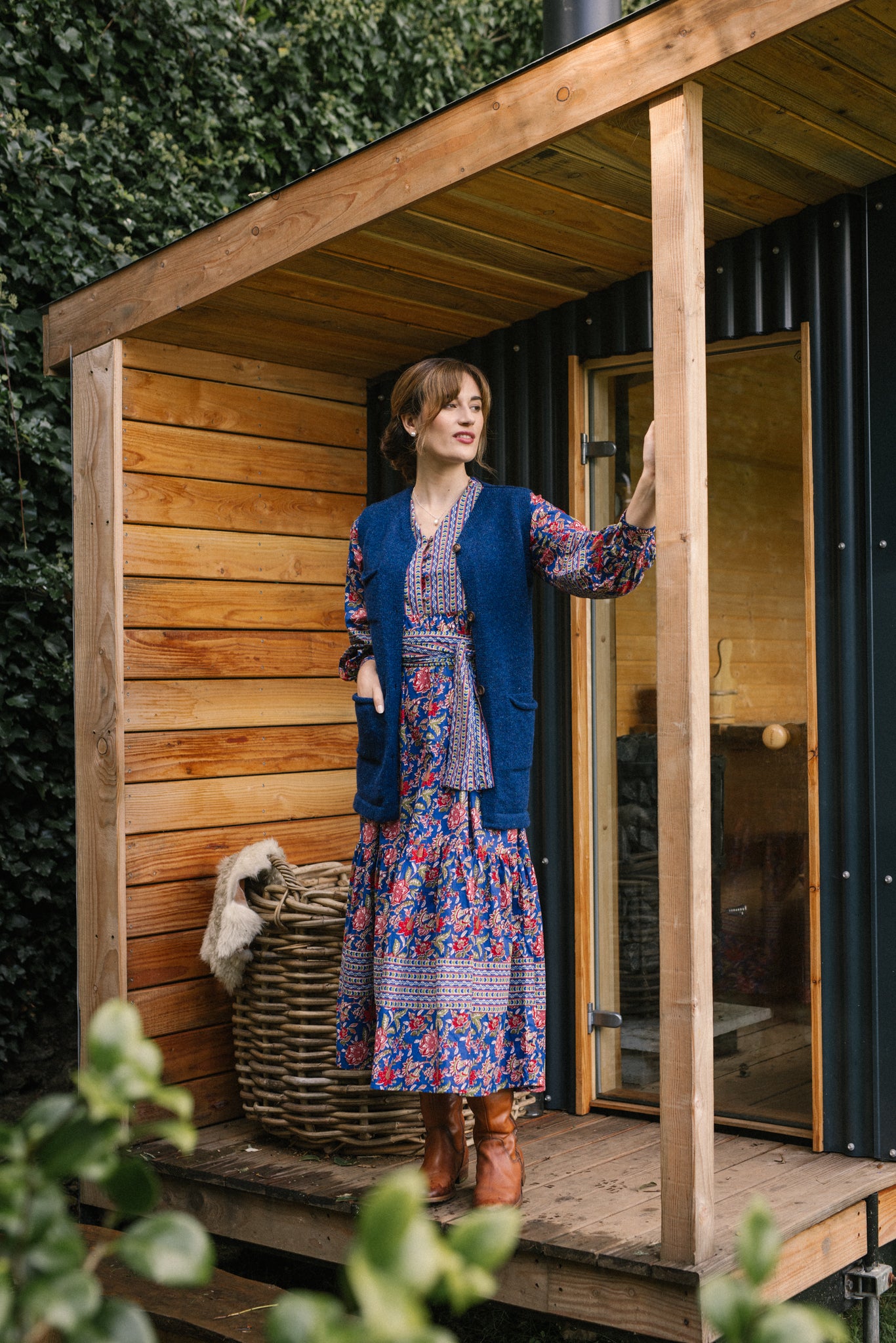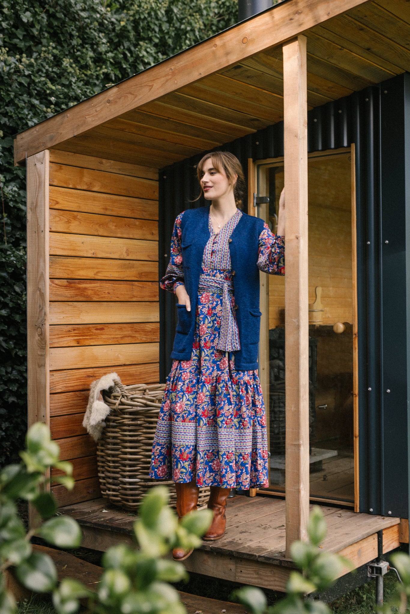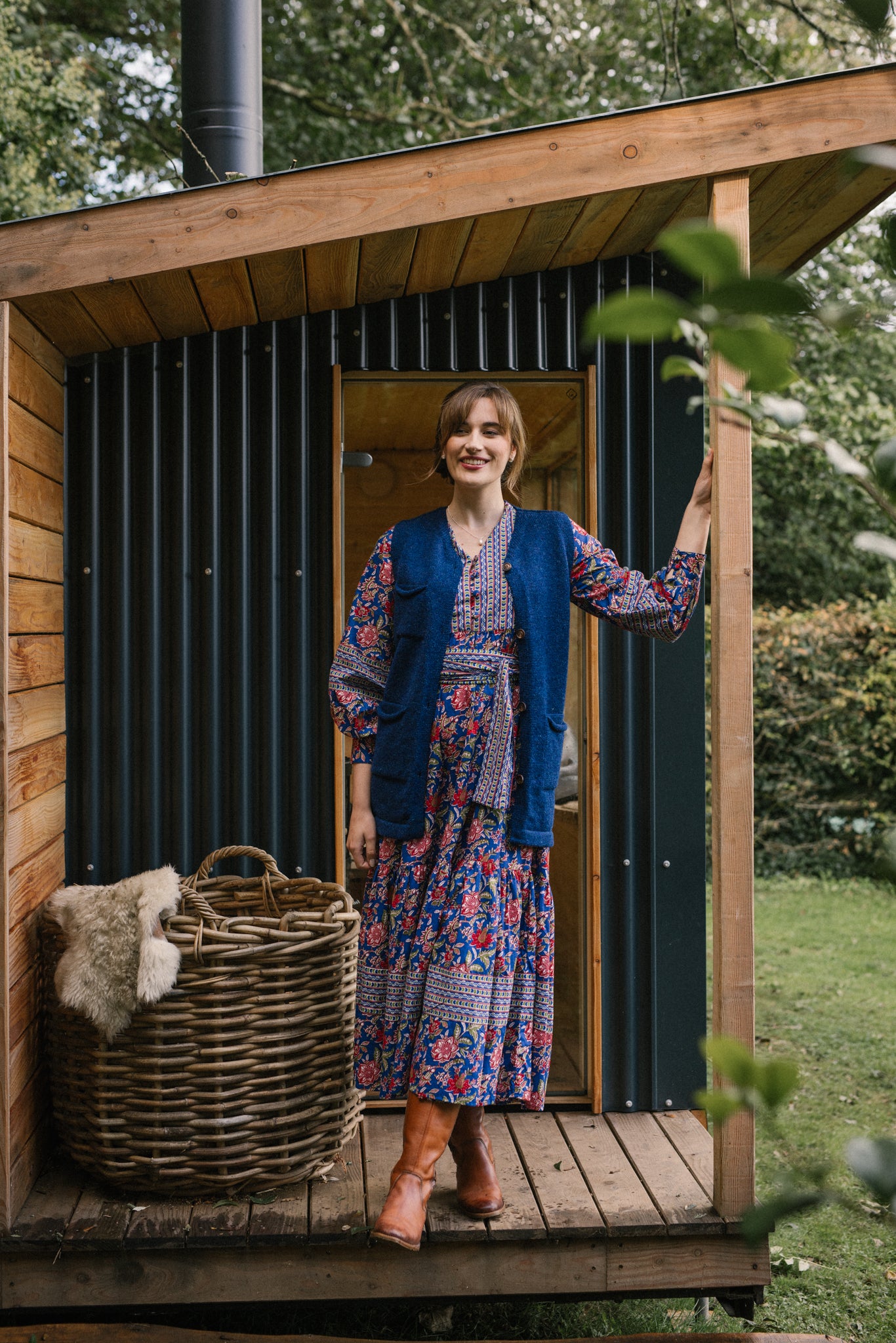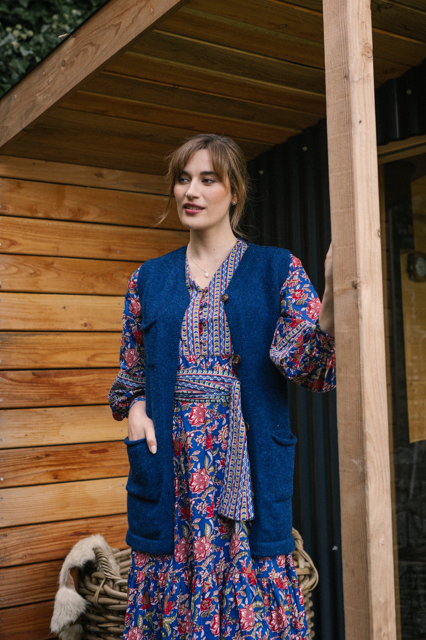 Long length waistcoat/gilet with 3 pockets. Attractive details are knitted into the V-neck, armhole, back and shoulders. This heavy weight garment made from 100% British wool is incredibly warm and made to last. Features include large horn buttons and doubled hems for added quality and durability.